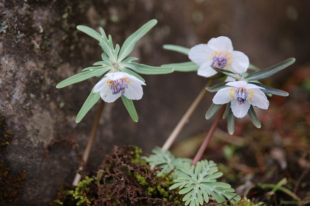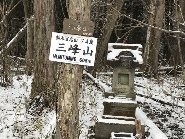 <詳細報告>7:40御嶽山神社脇駐車場に到着し、安全祈願してから登山口に向かった。清滝不動、普寛堂を過ぎると石祠が次々と現れ石段から次第にガレ場になり歩きづらい参道が続いた。御嶽大神御岩入口の石碑があったが鎖場は避け、大岩の右側を通り奥の院を目指した。細尾根を過ぎると杉木立の中歩きやすい静寂な参道が続いた後、分岐を右に進み奥の院に到着した。三柱の神々に安全祈願して小休止した。木々の間から三峰山が見えた。奥の院から三峰山に向けて出発した後、初めて人に出会った。暫く稜線を進むと鉱山の立入禁止の看板とロープが張られ、石灰石を採掘するけたたましい機械音が聞こえて静寂な登山が吹き飛んでしまった。杉木立の中をいったん下り、緩やかな登りを歩き続けると行き止まりとなり、一瞬道を間違えたかと思ったが小さい石祠があり、三峰山の頂上と気が付いた。フェンス越しに石灰石の採掘場と遠くに街が見えるのみで展望は良くないので休憩せず下山した。昨日までの雨のせいで急な下り道は泥濘でとても滑りやすく、気を使い疲れた。その後ガレ場と倒木で歩きづらい道が続いたが麓に近づくにつれ歩きやすくなり御嶽山神社に到着した。昼食をとり春の気配が感じられる節分草、福寿草、枝垂れ梅等を撮影してから岩船の遊楽々館で汗を流し小山に戻った。