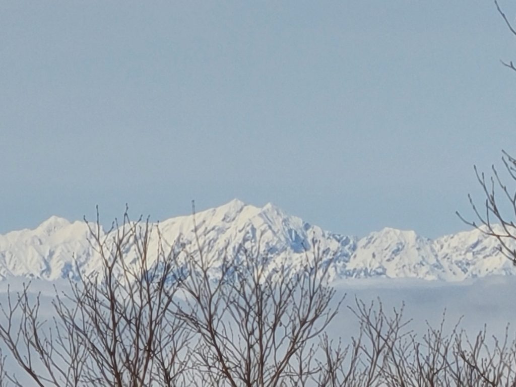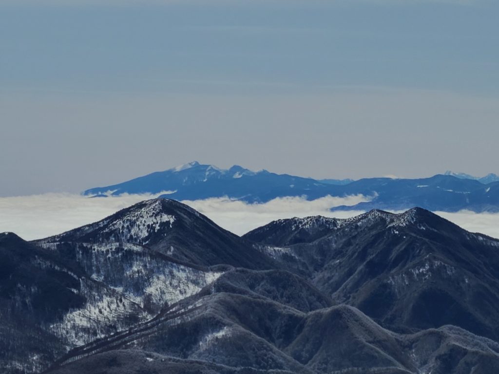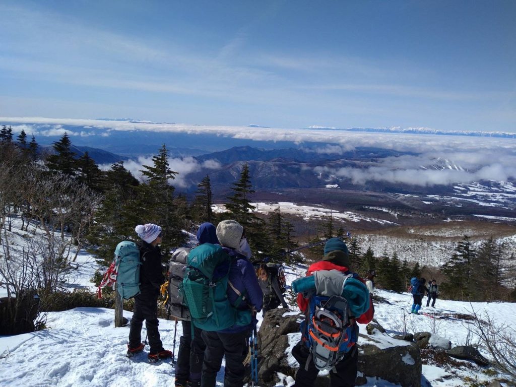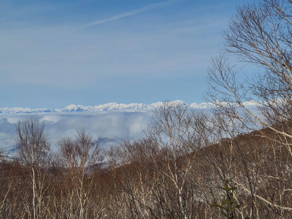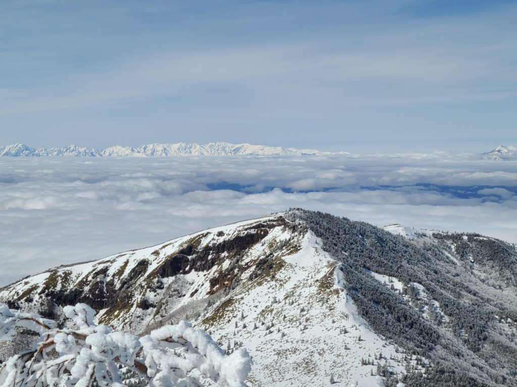 昨年行きたいと思いながら機会を失っていて、天気も良さそうなので四阿山行きを決行!大正解!国道から高原ホテル跡までの道に前日降った雪があって慎重に運転しました。ホテル前の駐車場はほぼ満車でしたが端っこに停められました。雪は少なく雪崩はないと思いますが練習のため先日習ったビーコンのグループチェックをして出発しました。会で買ってもらったスノーシューの試し履きもしてみました。高度を上げ振り返ると雲海の上に北アルプスが一直線に見え歓声が上がります。急登を休み休み登り山頂に到着。山頂は狭くリッジ状なので写真を撮って少し下りたところでお昼にしました。下りはスイスイあっという間に下山。駐車場の車はほとんどありませんでした。真田の湯(500円)で温まり帰路につきました。温泉で知り合いにばったり、ほんとによく会います。三連休でしたが高速の渋滞はありませんでした。
