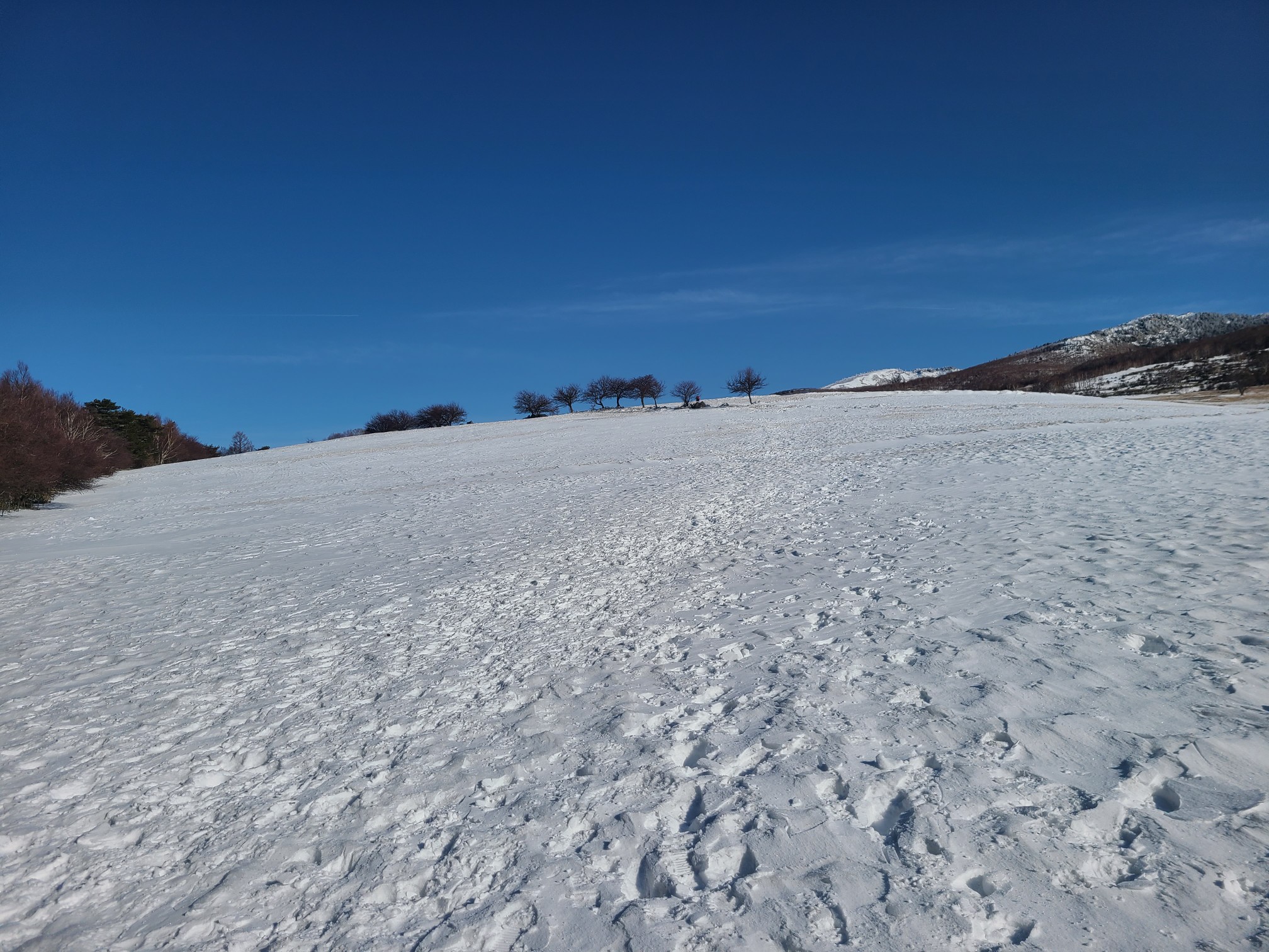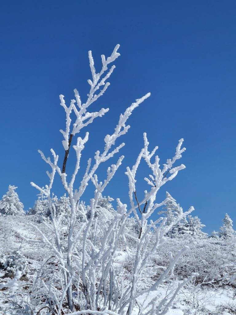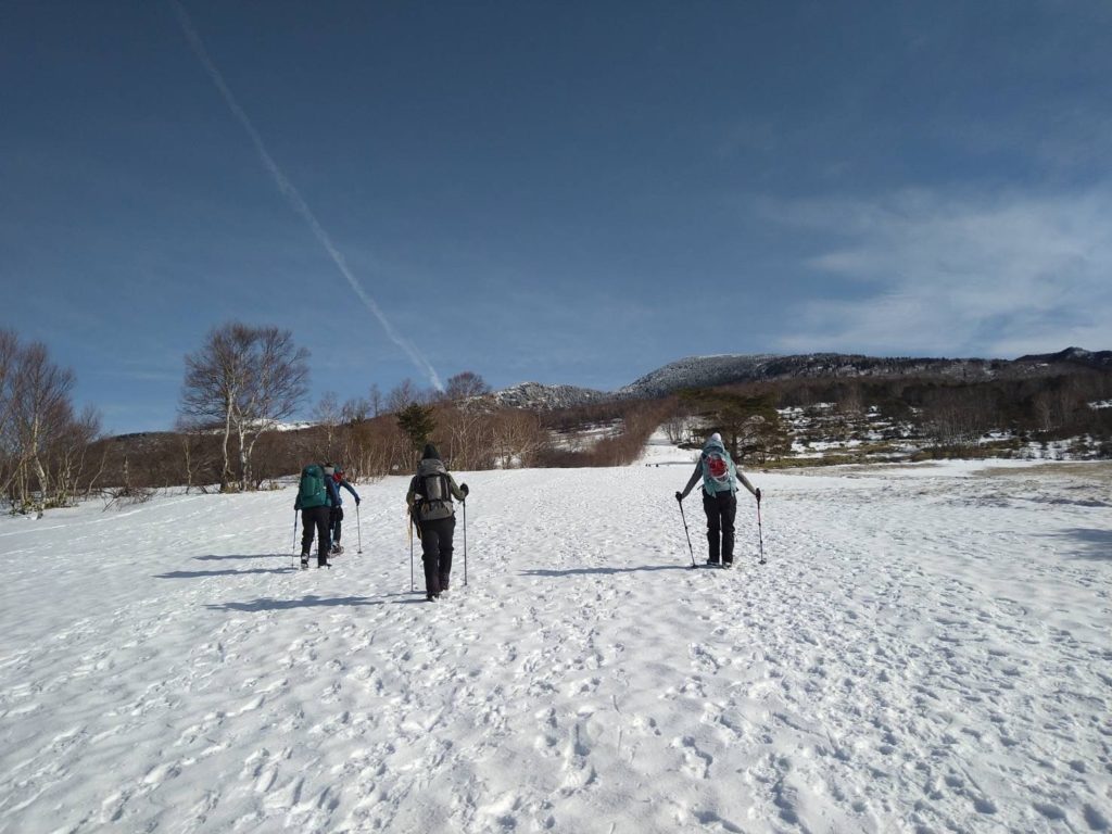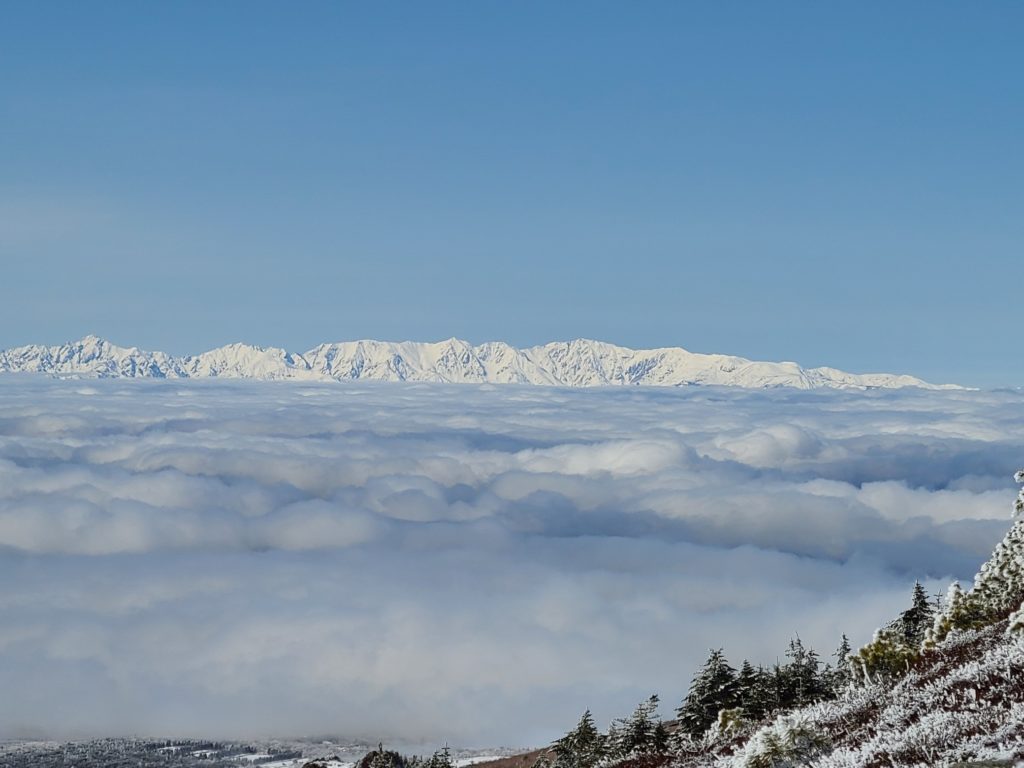 昨年行きたいと思いながら機会を失っていて、天気も良さそうなので四阿山行きを決行!大正解!国道から高原ホテル跡までの道に前日降った雪があって慎重に運転しました。ホテル前の駐車場はほぼ満車でしたが端っこに停められました。雪は少なく雪崩はないと思いますが練習のため先日習ったビーコンのグループチェックをして出発しました。会で買ってもらったスノーシューの試し履きもしてみました。高度を上げ振り返ると雲海の上に北アルプスが一直線に見え歓声が上がります。急登を休み休み登り山頂に到着。山頂は狭くリッジ状なので写真を撮って少し下りたところでお昼にしました。下りはスイスイあっという間に下山。駐車場の車はほとんどありませんでした。真田の湯(500円)で温まり帰路につきました。温泉で知り合いにばったり、ほんとによく会います。三連休でしたが高速の渋滞はありませんでした。