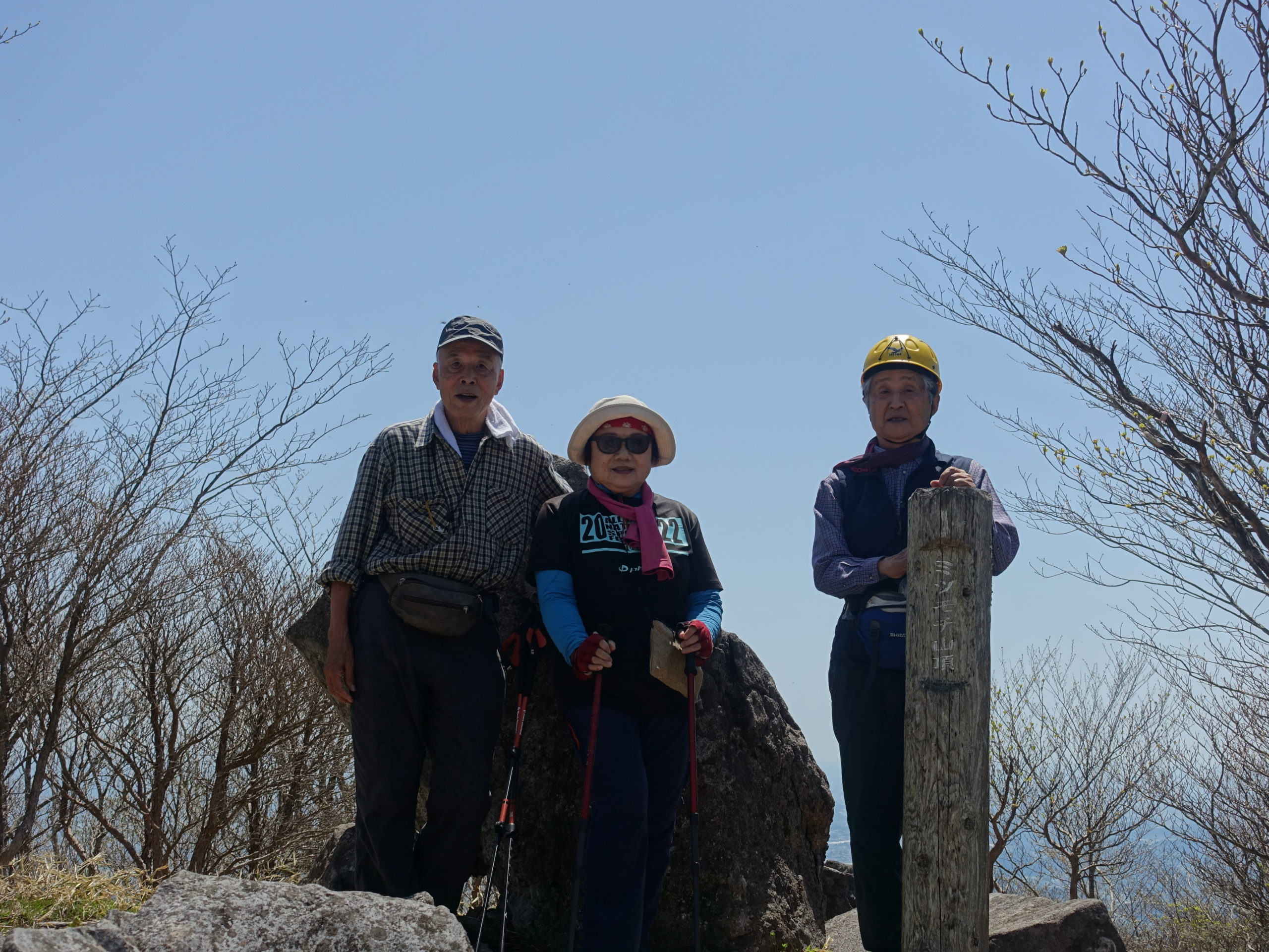 単独行との違いは緩斜面の歩きはオシャベリが何より、話すということは素晴らしいことであります。笹原を抜け展望が開けると、見晴台のあるピークに到着、展望を楽しんだ後、ゆっくり昼食タイムです。50mほど西側に、大岩が鎮座するピークがあり気になったので行ってみた。なんと標高は低くなるが、こちらが山頂になるらしい。初めて知りました。山頂標識が薄く見ずらいため、修理が専門のあんまんさんの出番です。ほぼ綺麗に修理しました。帰りは見晴らしコースです。ひだりに釈迦の稜線を眺めながら、ノンビリ歩きです。散り残りの赤ヤシオが斜面の多くで散見され癒されます。オシャベリ歩きでほどなく大間々に到着しました。