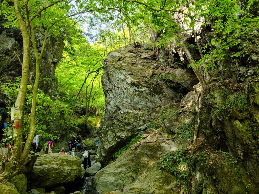<詳細報告>朝6時に家を出て8時過ぎにさわらびの湯に着くと駐車場はすでに満車。臨時駐車場あすなろ会館にとめて出発。予想以上の人、人、人…家族連れも多い。沢コースを辿るが慣れない岩歩きに苦戦する人が多くゴルジュでは渋滞が…高度を上げると実になったカタクリ、ネコノメソウ、ニリンソウなどが見られた。沢を離れると急登が続き尾根に出て30分ほどで山頂に着いた。山頂は広場になっていて角田山のように大勢の人が休んでいた。東京方面は霞んでいて蜃気楼のように高層ビルが見え、2月に歩いた武甲山から大持山の稜線や伊豆が岳が眺められた。下山は岩茸石から滝ノ平尾根を辿る。木の根が出た道で引っ掛けないよう慎重に下った。最後のさわらびの湯からあすなろ会館までの道が長かった。帰りは下道で渋滞もなく3時間で着いた。