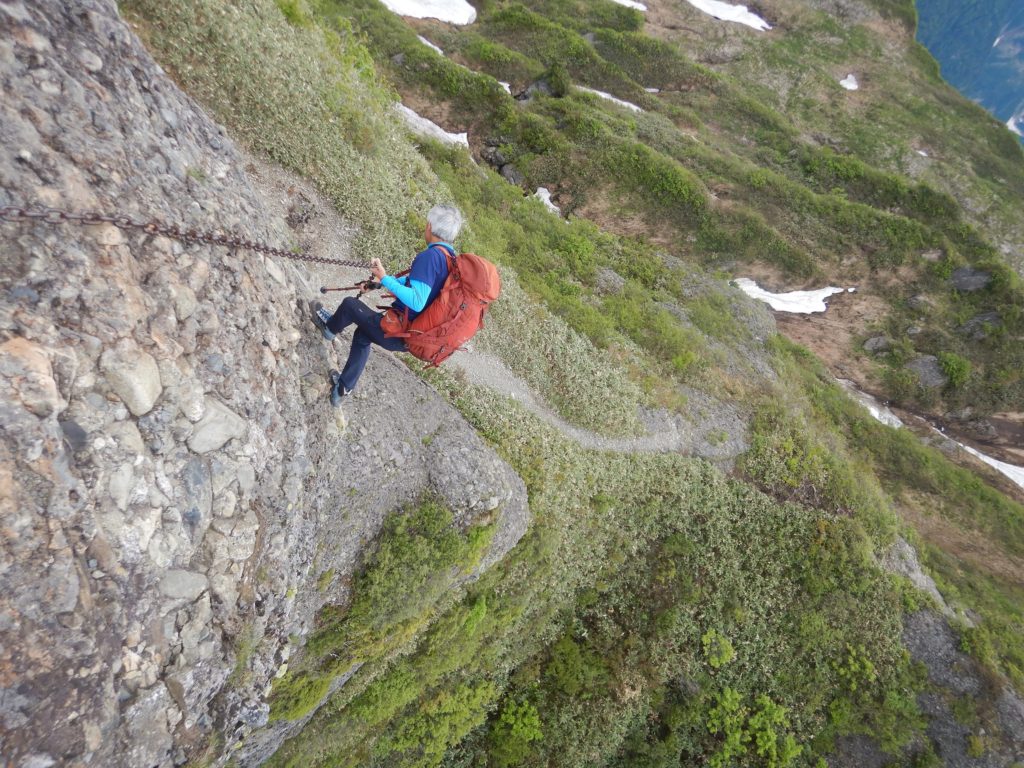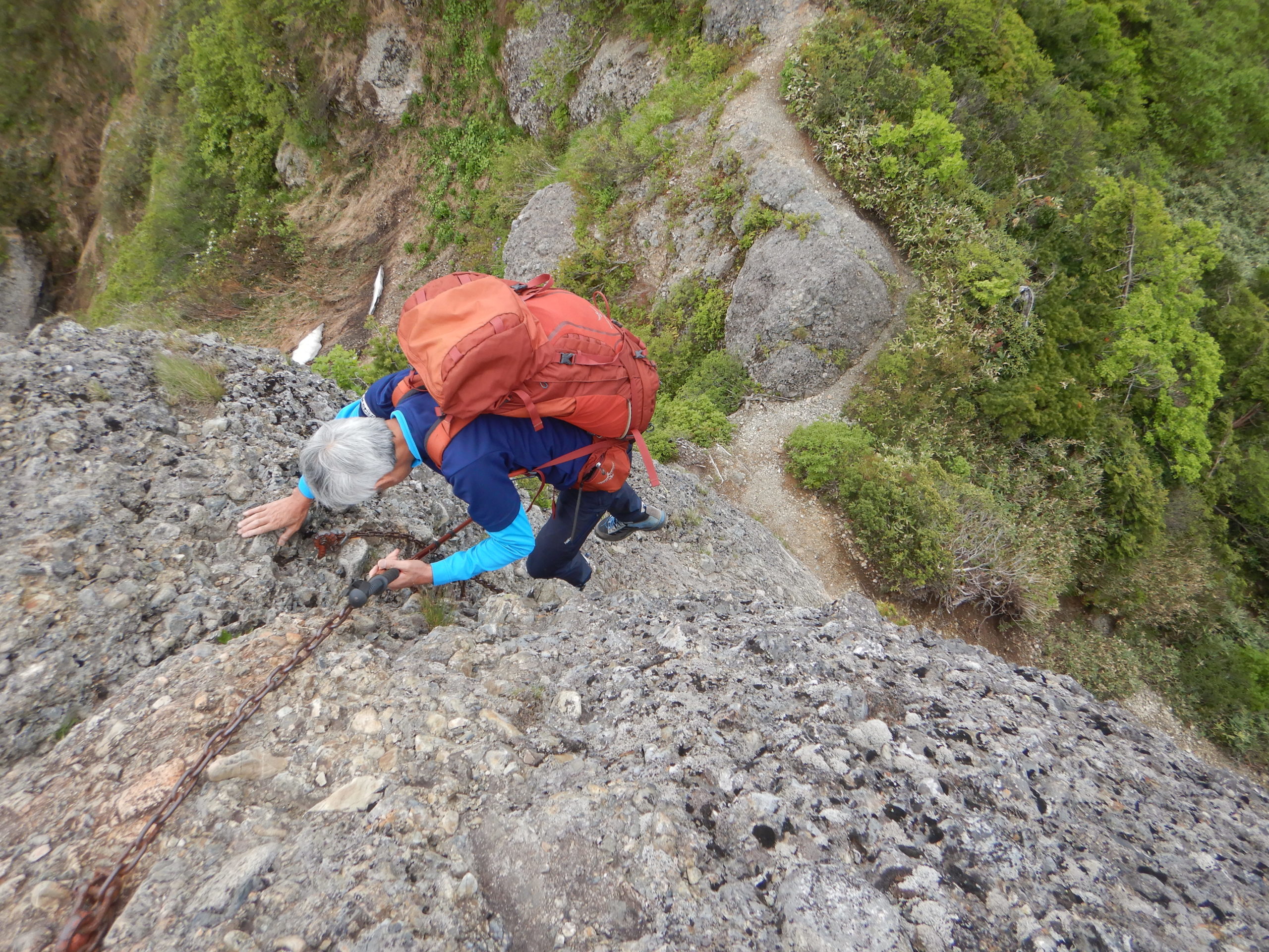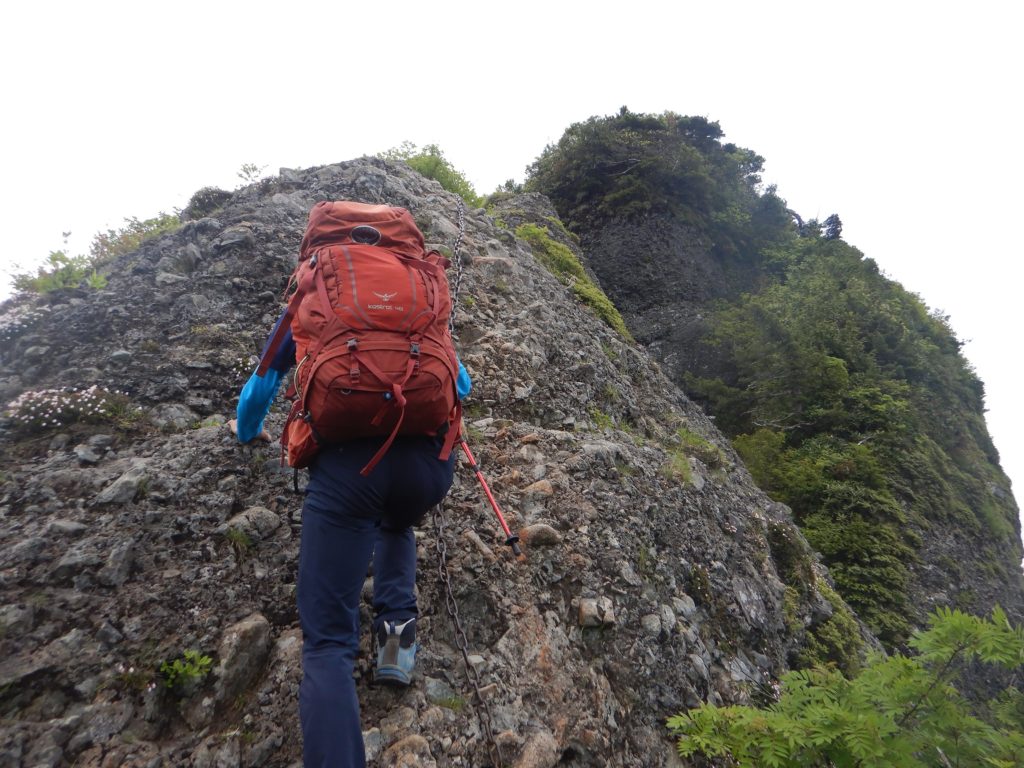 登山道はここの清滝から先、鎖場の連続になり緊張が走ります。ガイドブックを読むと「濡れた岩稜」とありましたが、この日は天気も良く、岩が乾いていたため、スリップするようなところはありませんでした。風のない岩稜は日陰が少なく、休憩のたびに私は水ばかり飲んでいました。岩の尾根の急登は次第に私たちの体力を奪っていくのが分かります。
