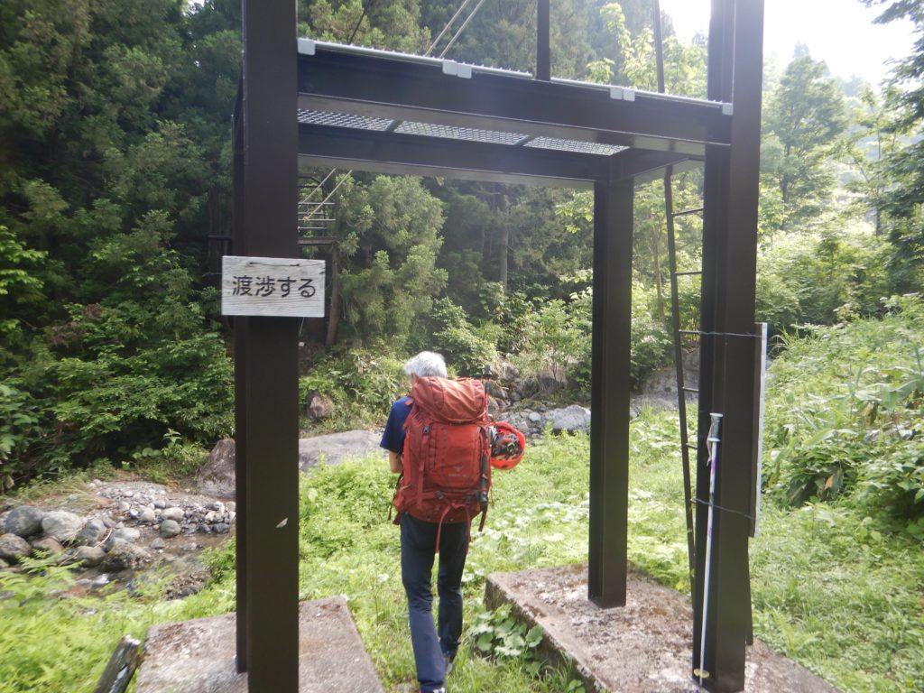 そこから、しばらく緑に茂った沢沿いを進みます。1時間ほどで再び渡渉があり、ここが四合目の清滝でした。ここで二日分の水を確保しました。私は今持っている1Lのほか、今晩とあすの朝の食事、そして、明日の行動分の合計4Lをくみました。一気に4Lの水が増えて、ザックを背負うと両肩にずっしりとベルトが食い込むのが分かりました。