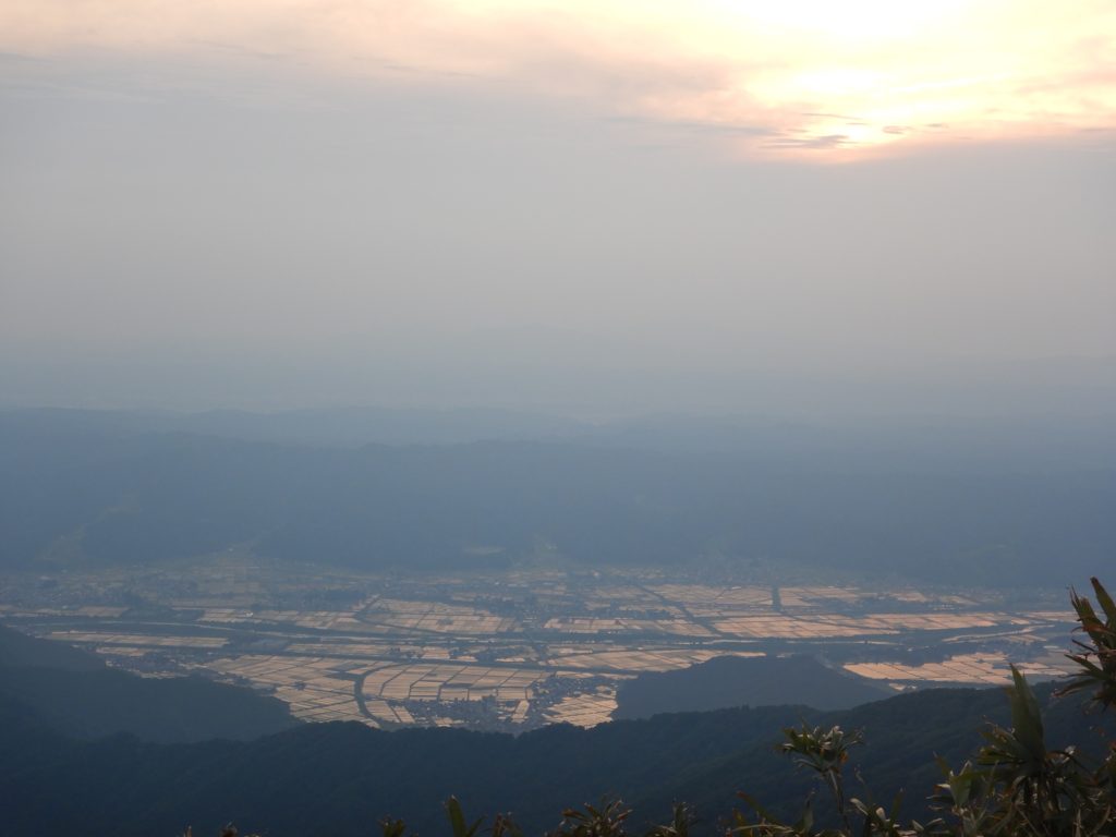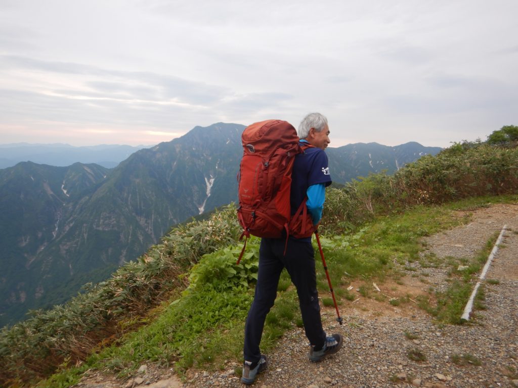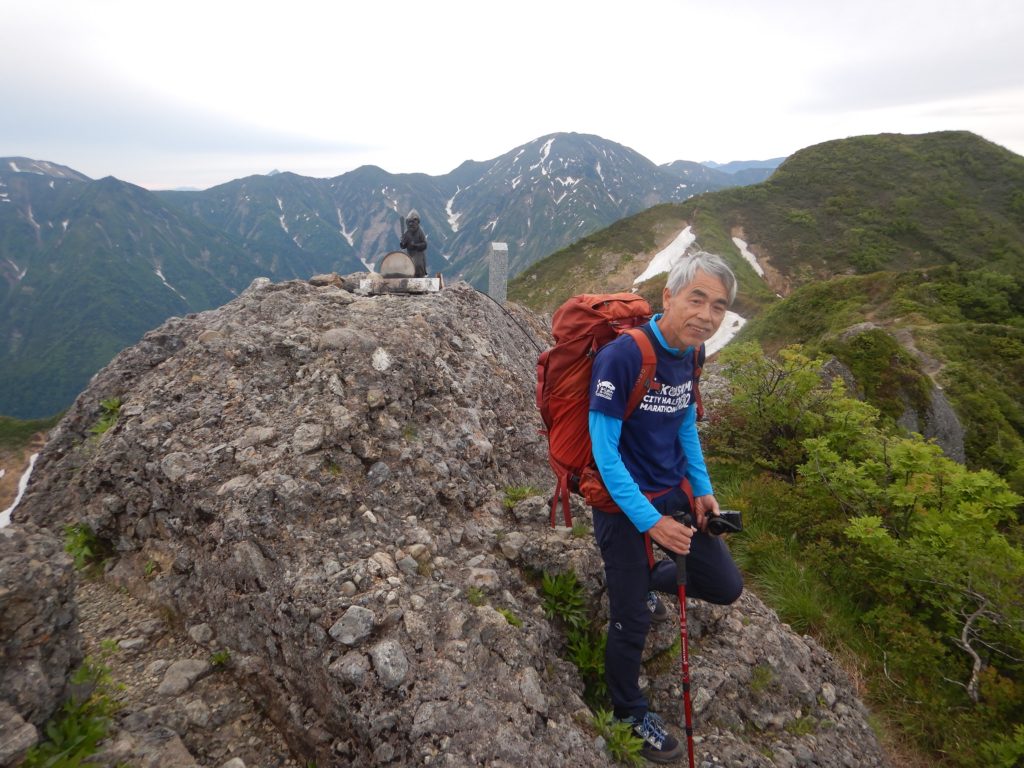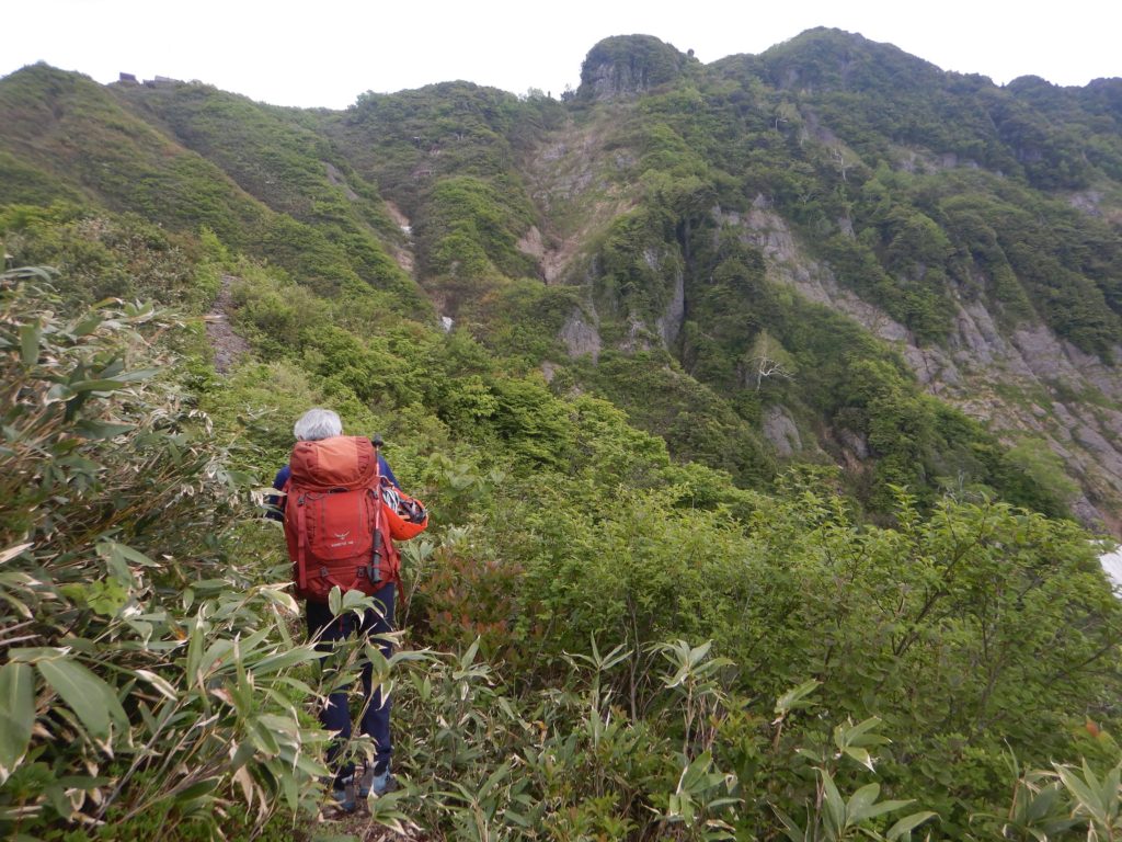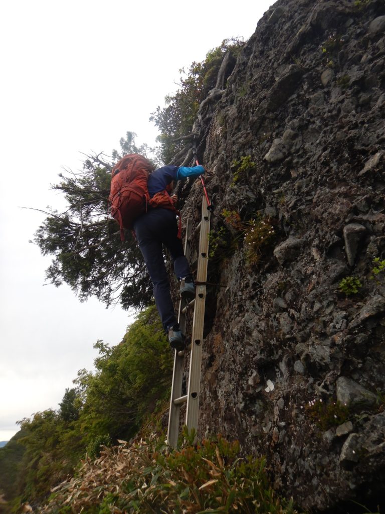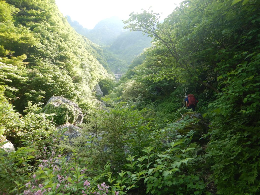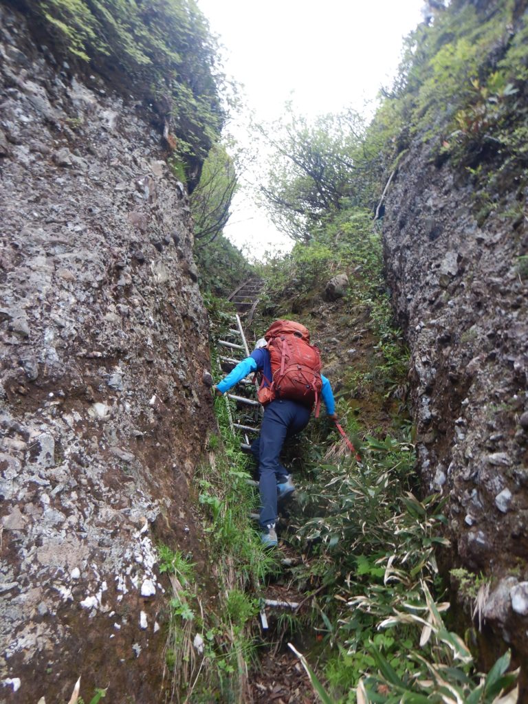 6/9㈰ 外が明るくなり始めた4時に起床。昨夜トイレに起きた時、西側の南魚沼市の夜景がきらきら光っていました。八海山二日目は、前半は八ッ峰の岩稜、後半は八海山を馬蹄形に回り込んで下山する長丁場が待っています。早めに朝食をとり、荷物をまとめて出発。外は昨日同様、もやはありますが、風もなく天気は良好。早朝の心地よい空気を吸いながら、左手に越後駒ケ岳と中岳を眺めながら岩稜に向かいました。最初の烏帽子岩のようなピークは左から巻きましたが、あとの八ッ峰はすべて稜線を踏みました。今の時期新潟の山は雪解けが進み、一斉に高山植物が咲いていて、八海山も同様に、登山道周辺はどこもお花畑状態でした。八ッ峰の鎖場は乾いていて、スリップすることはありませんが、何ヶ所か、10m以上のほとんど垂直の鎖場が待ち構えており、慎重に通過しました。