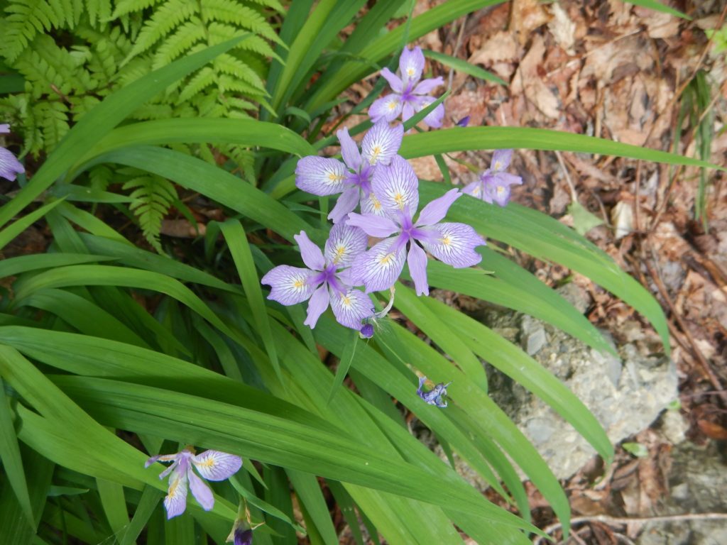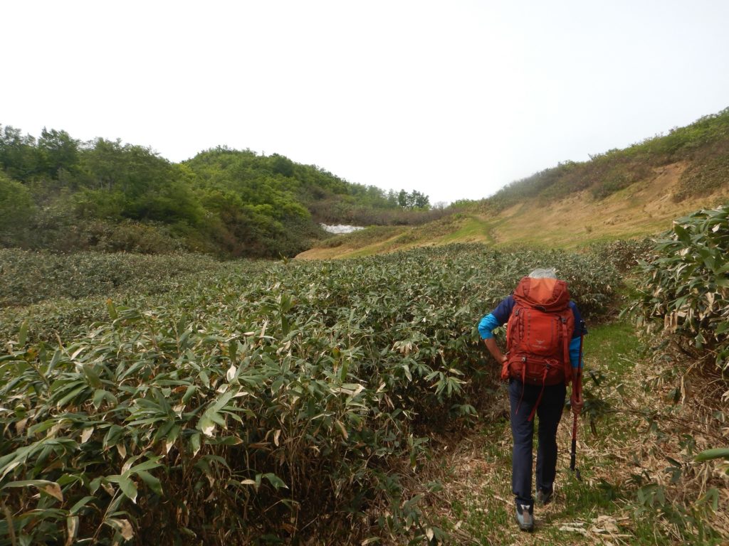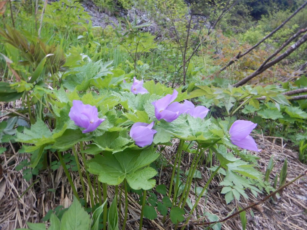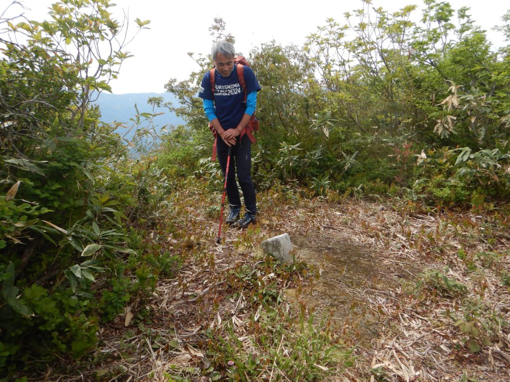 小屋から八海山最高峰の大日岳までは岩稜のアップダウンが続き、少し離れた入道岳まで来ると、ようやくくさり場がなくなり、緊張感から解放されました。五竜岳は以外にも木々に覆われた小ピークで拍子抜けしました。この先に待ち構えている阿寺山までは湿地帯が続き、さっきまでの岩稜とは対照的でお花畑のなかの気持ちのいい稜線歩きでした。ひと月前ながおかさんも参加のときは阿寺山周辺は雪で覆われていましたが、いまは残雪もなく、あの時から比べると、今回は低いアップダウンに苦しんでいます。前回は小ピークだった阿寺山も、残雪のない今回はその急登に苦しめられました。今回最後のピーク、阿寺山に登頂し、計画通りこの山行が達成できたことにホッとしました。阿寺山からの下山道は土の上に落ち葉が積もっており、ところどころスリップしながらの下山でした。途中登山道は尾根から広堀川沿いになり、疲れた身体にバランスの悪い岩の上を歩くことを強いられ、両脚は悲鳴をあげていました。ですが、さくまさんは、沢周辺に群生しているフキノトウを楽しみにしていたようで、歩きながらフキノトウを摘んでいました。