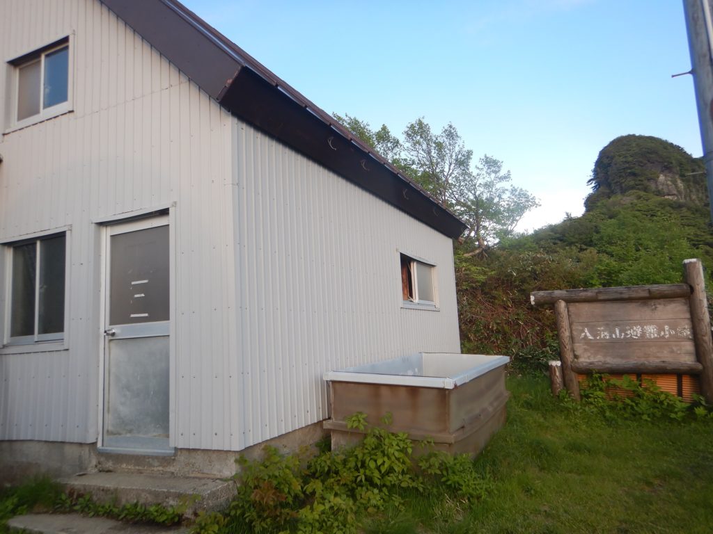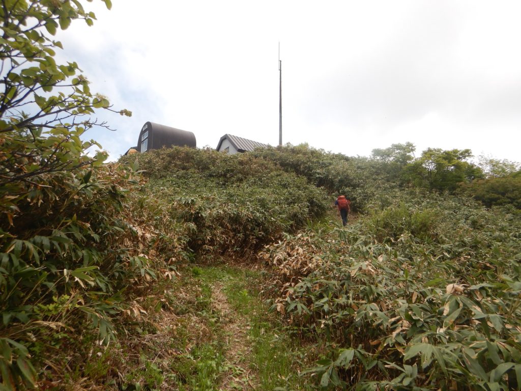 出発して3時間ほどで七合目とおもわれる「のぞきの松」が現れました。そこから稜線を見上げると、数百メートル先の岩場の間から、人工物と思われる避雷針のようなものが観えました。七合目からさらに2時間ほど登り、標高が1500m近くになると、少しづつ傾斜が緩くなり始めました。このあたりから、私もやっとカメラのシャッターを切る余裕が出て来ました。そして、登山道の周りが笹藪になるころ、ようやく千本檜小屋の屋根が笹の間から観えてきました。そして、やっと今日の宿にたどり着くことができました。