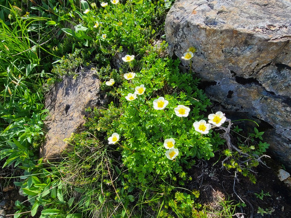 5時半の朝食後に出発。風があり少し寒いくらいです。快晴で気持ちの良い稜線歩きが約束された日でした。まずは小蓮華山へ1時間ほど行くと稜線に出て鹿島槍ヶ岳に五竜岳、少し行くと白馬岳も現れました。よく写真で見る稜線です。三国境では新潟大学の学生さんが斜面の調査でドローンを飛ばす準備をしていました。二重稜線舟窪地形という特徴のある場所なので研究しているのかな?そこからひと踏ん張りで白馬岳山頂に着きました。途中トウヤクリンドウやウルップソウが終わってしまっていたけどお花畑になっていました。やはりお花の咲く時期に来たいなと思いました。少し休憩して先を急ぎます。頂上山荘のテント場を左に見ながら杓子岳への稜線を行きます。大雪渓が閉鎖になっているので頂上山荘の分岐も静かです。白馬三山は、数年前会のメンバーと歩きました。あ~、杓子岳の登り見上げるような斜面、きつかったよなぁと思い出しながら何とかクリアして写真を撮り、白馬鑓への鞍部で休憩しました。そこで20人ほどの中国人パーティーとすれ違いました。あとこの山を越えれば天狗山荘までもう少しです。白馬鑓では剣岳水晶岳穂高岳の吊尾根など見渡せました。南アルプス方面は雲がわき見えず残念でした。歩いてきた白馬岳や白馬山荘を振り返りながらちょっと長めの休憩を取りました。天狗山荘も見下ろせます。石くずのガレた道を慎重に下り鑓温泉の分岐を過ぎほどなく天狗山荘です。稜線から山荘への道はお花畑になっていて、ウルップソウやチングルマ、ウサギギクなどがまだ咲いていて得した気分になりました。着いてすぐうどんと生ビールでお腹を満たしました。この日も蚕部屋6畳に2人だけ。女性は2人でとても静かでした。夕食は鍋、とても贅沢です。天気が崩れる予報で食堂入り口の天気予報を心配しながら確認します。何とかお昼までは持ちそう。槍温泉への下山だけはしたくないなぁと、前回あまりにも長い道でもう歩きたくないと思っていたので。朝食をお弁当にしてもらい夜のうちに受け取り、天気を祈りながら休みました。