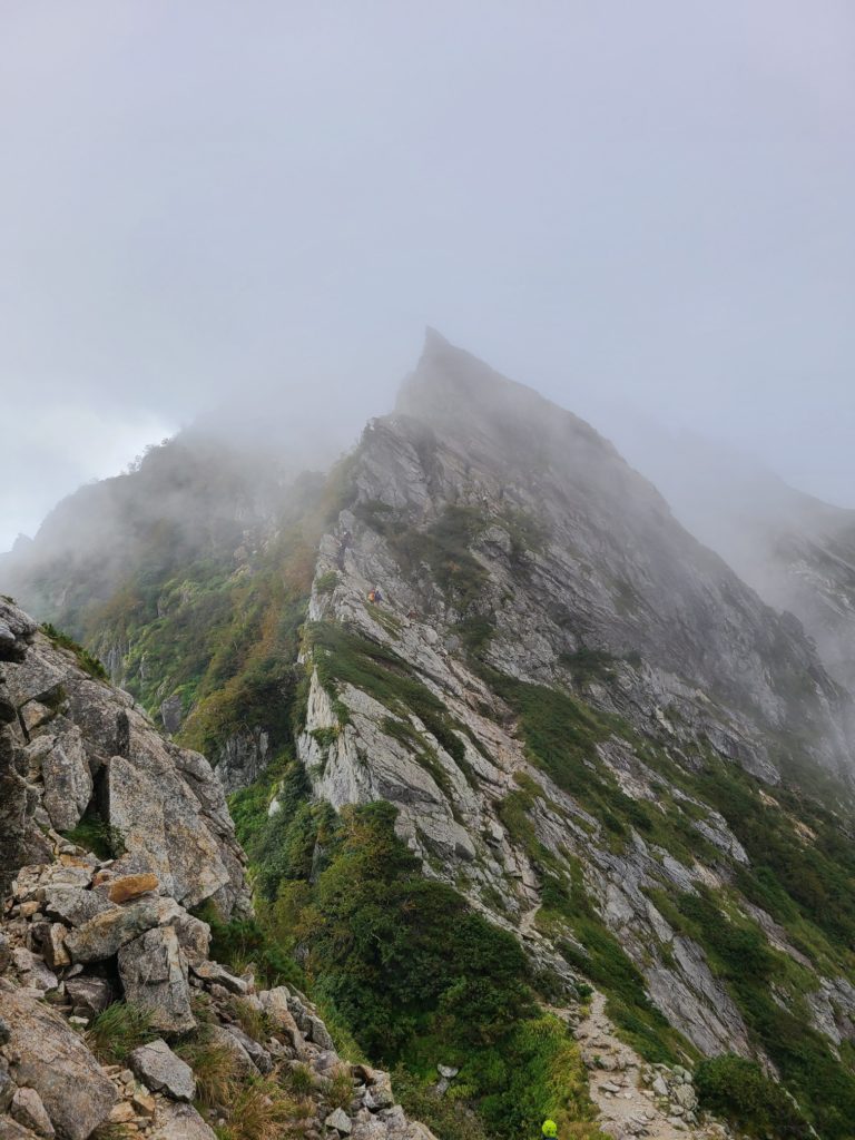 朝、目覚めて窓越しに星が出てたりガスったり雨は降っていないようです。何とか行けそうみたい。真っ白ななか小屋を5時に出ました。風も強く寒いのでカッパを着て歩き始めました。天狗の大下りは足場が悪く慎重に下りました。そこで今季初の雷鳥に遭遇。下っている途中にガスが取れて、向かう不帰の嶮が姿を現しました。またすぐにガスに覆われてしまったのですが、一瞬でも景色が見られてラッキーでした。立ちはだかる岩から数名下りてくるのを待つ2人を見ながら、私たちは鞍部で待機しました。下りてきたのは上高地から親不知まで行くという大きな荷物を背負った大学生グループ。ここが2峰の取り付きなのと、先の様子を教えてもらいました。なんてことなく核心を過ぎ2峰北峰へそこからさほど危険と思う箇所もなく南峰に着きました。南峰は休憩スポットになっていて先行者も休んでいました。私たちもそこで休憩しお弁当を食べました。そこから三峰を越えて唐松岳山頂に到着。山頂は真っ白で展望はありませんでしたが多くの登山者で賑わっていました。下山は土曜日ということもあり予想はしていたのですが、すれ違いが多く夫はイライラ、八方尾根にはもう絶対来ない、今回が最後だ、とぶつぶつ言いながら歩いていました。リフト、ゴンドラを乗り継いで駐車場に戻りました。ぽかぽかランド美麻のお風呂で3日分の汗を流して帰路につきました。渋滞もなく17時には帰宅しました。