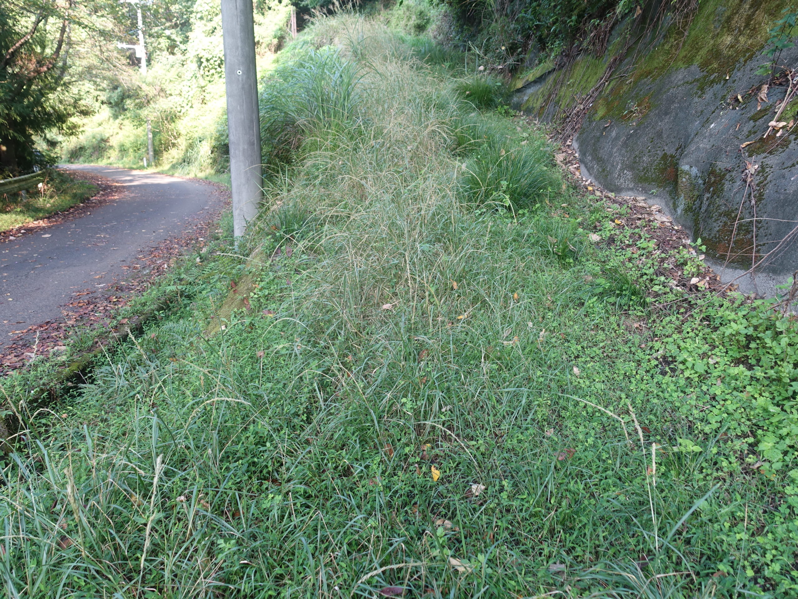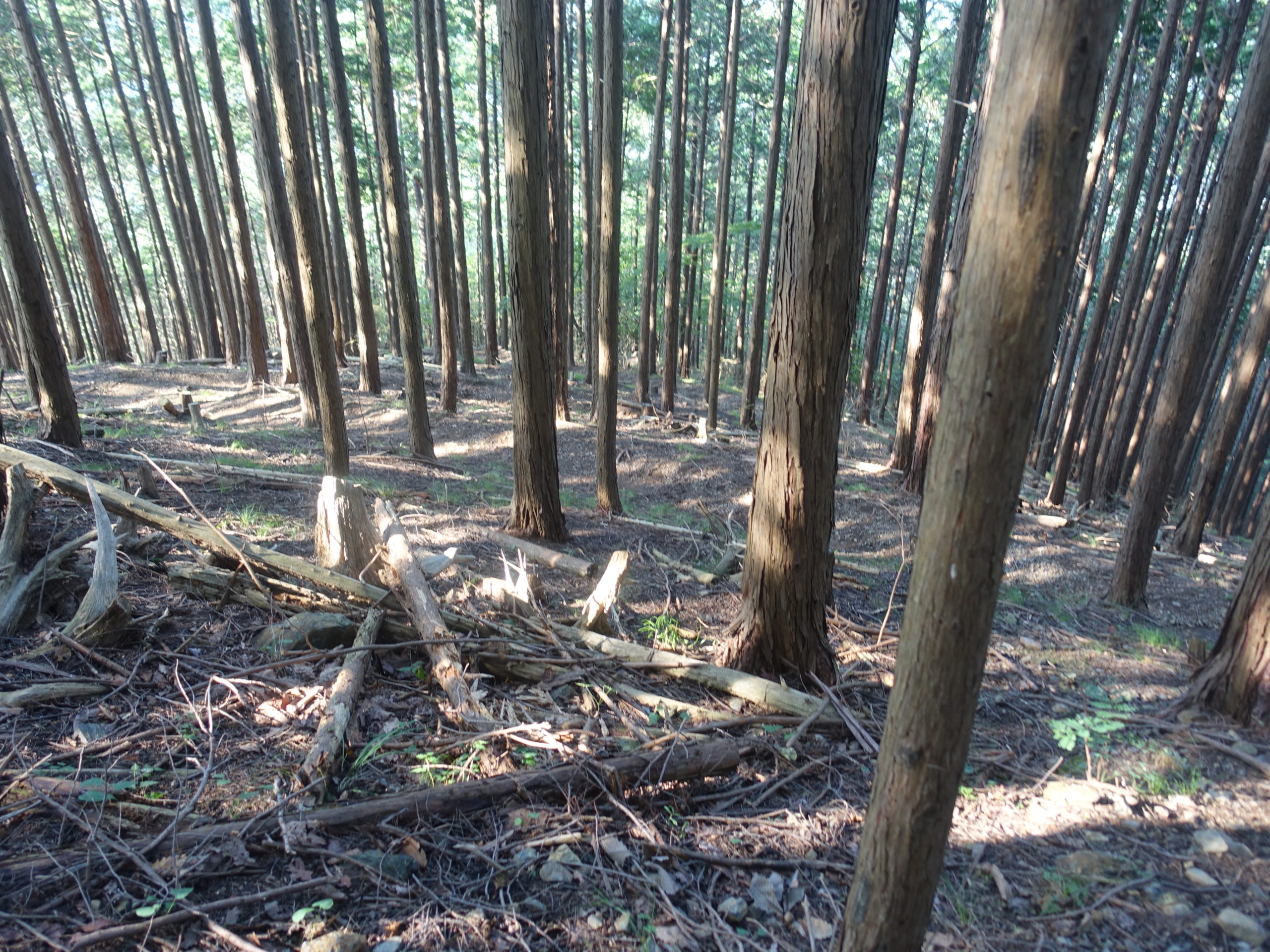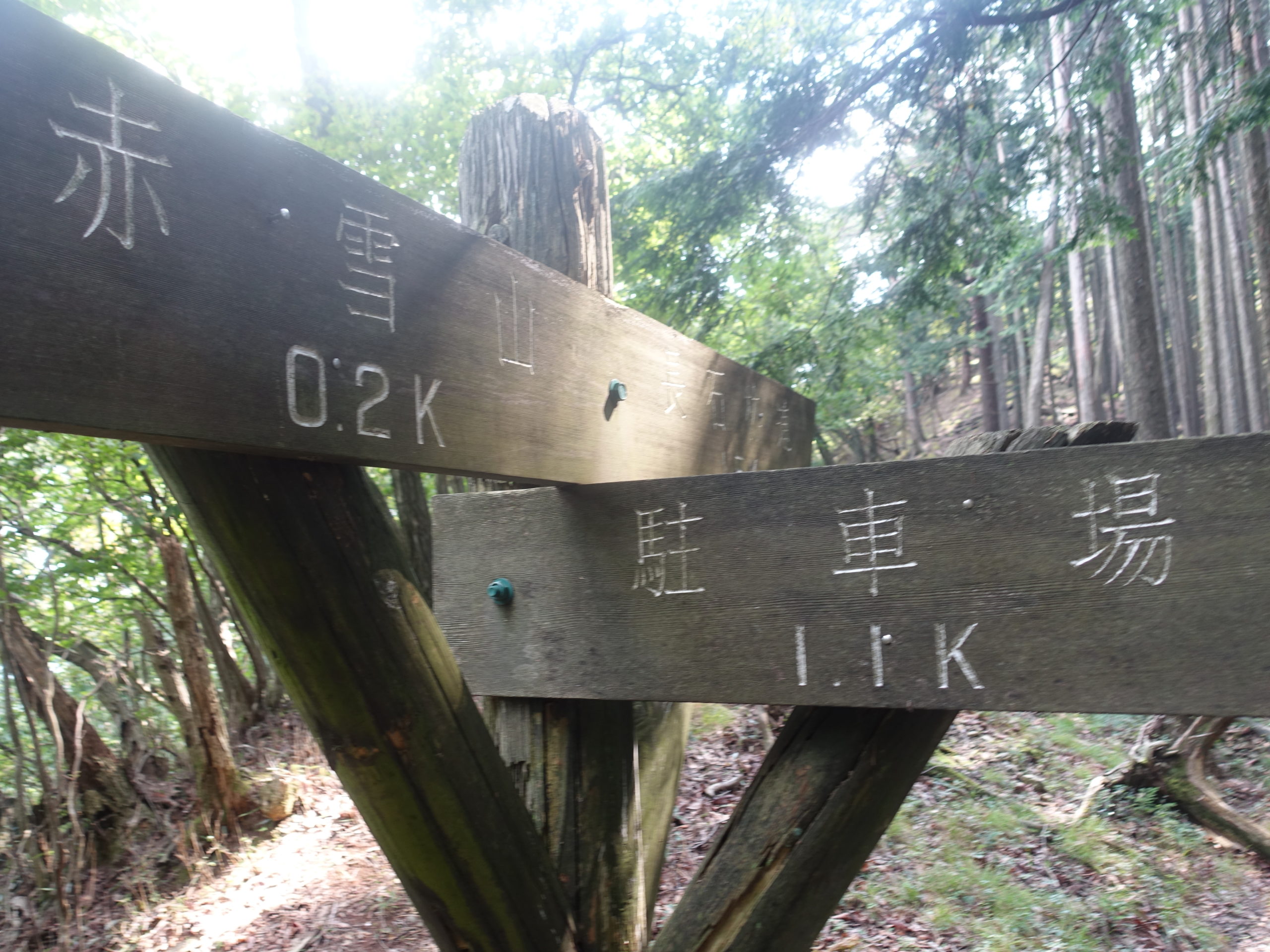 今回の目的は沢沿いのルートがダメと分かっているのに、状況を確認することが目的です。山頂からの急傾斜をおり鞍部のところに、駐車場1.1k との立派な案内板があります。植林の中、トラバースしながらジグをきり降りると、沢筋に合流します(地形図の点線部分と合流)そこからは沢筋に沿うので道間違いはありません。藪に苦労しながら降りていると、何か足がかゆいなーと思い見てみると、最も嫌いな山ビルです。この地域の尾根筋にはいなかったのですが、沢の湿りの中は別のようです。10匹くらい食いついていました、2~3カ所刺されました。ルートは沢筋をたどればいいので、問題ないのですが、人が入らないため、クモの巣だらけです。廃道で2度と歩きたくありません。