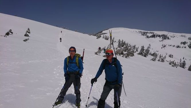 下りは、山スキーとつぼ足組に分れて下りました。駐車場へは山スキー、つぼ足ともあまり時間の差がなく到着しました。
