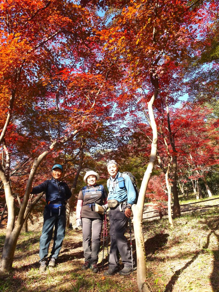 両崖山の裾野にあるもみじ谷の紅葉を見に行ってきました。今年の紅葉はいまいちとは分かっていてもどうせなら山と一緒に見たいものと期待をかけて出かけました。今回は時計回りの周回です。時計回りをする人は少ないので対向者とは結構すれ違いました。最高の天気だったので出かけてきた方も多かったようです。夏の天気と違い丁度良い気候、12度くらいで遠く雪の富士山もよく見えました。目的のもみじ谷は観光客が主流。それなりに日があたりとぼけた紅葉も鮮やかに見えます。隅には大きなアマリリスが立派に咲いていてびっくりです。のんびりと散策して駐車場へ着き、お腹もすくほどでもなくそのまま帰宅しました。