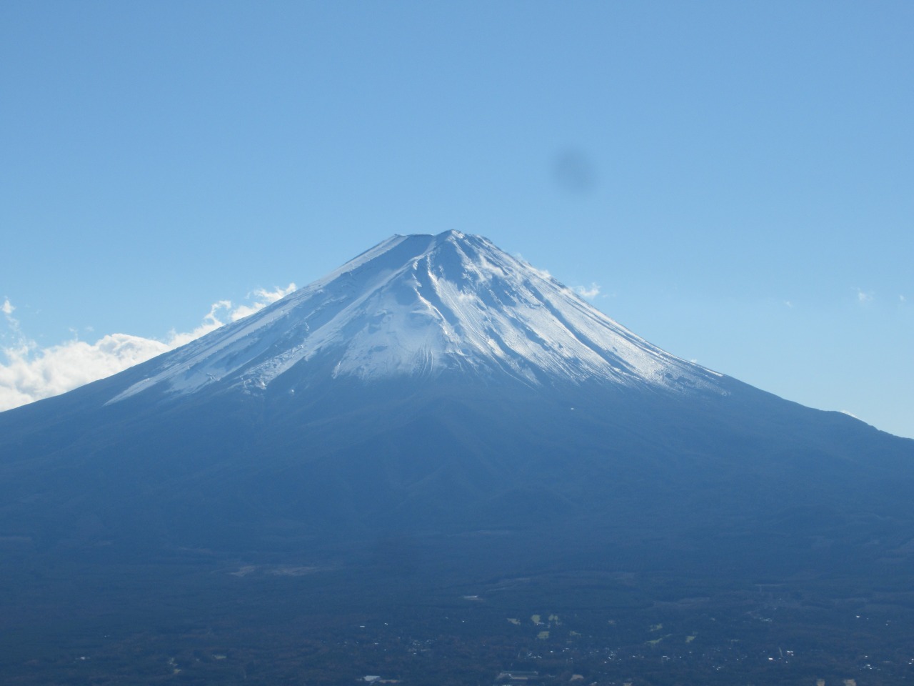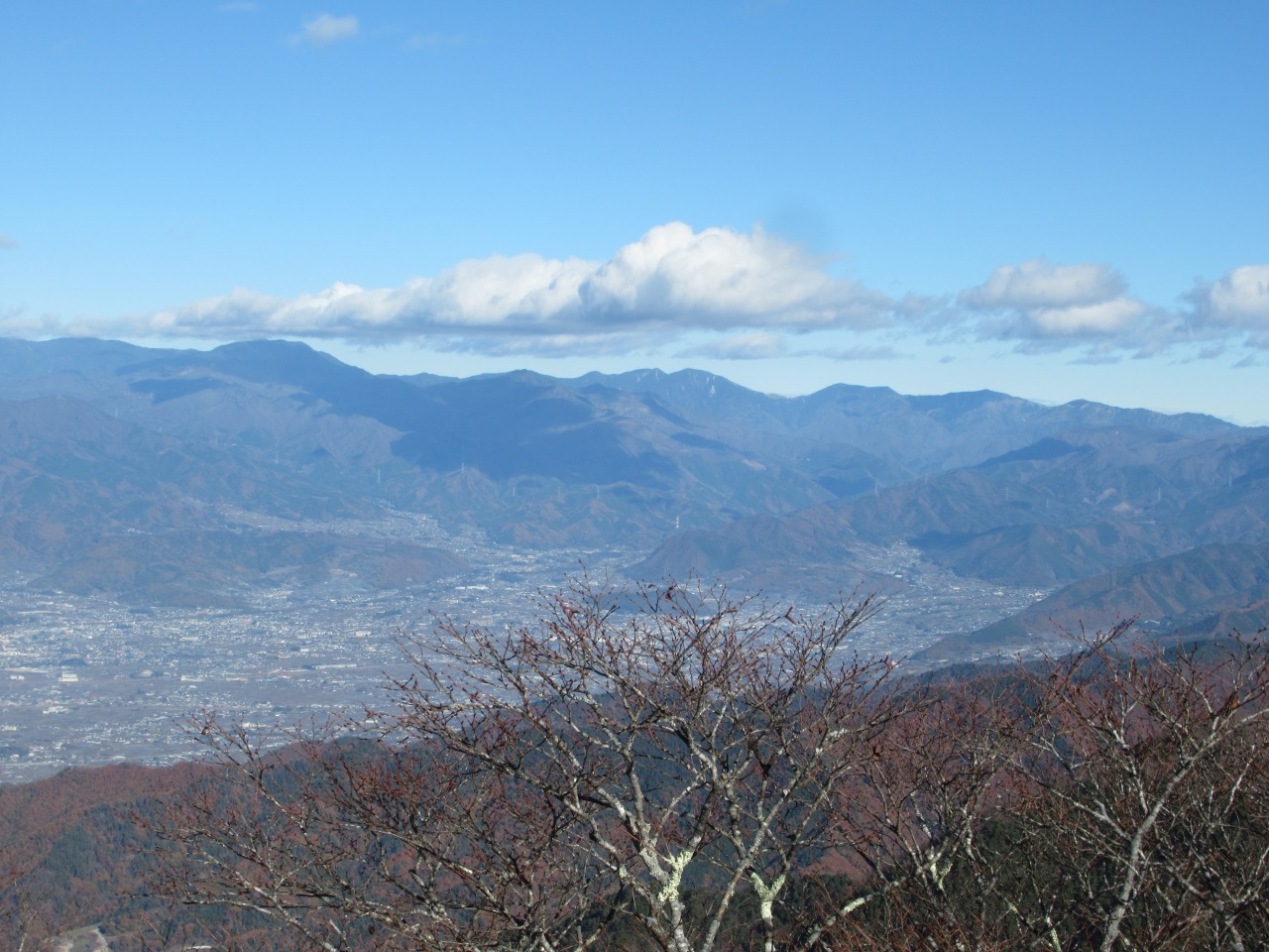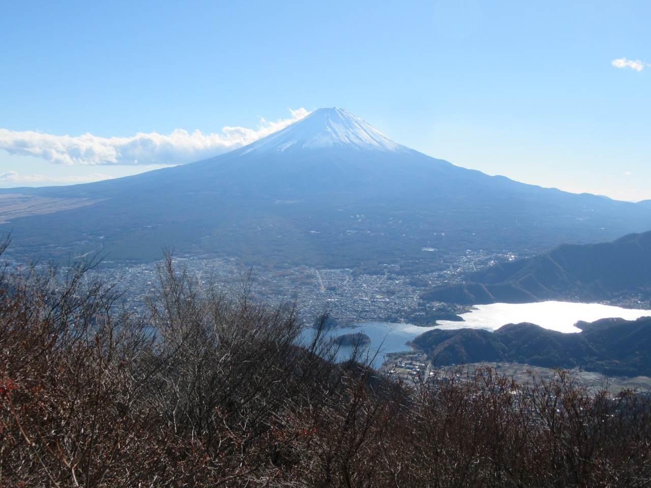 往路を峠に戻り、次は御坂黒岳に向かいました。こちらは小さなピークを二つ越えた後の急登、登山道は歩き易く、霜柱も融けず滑りません。黒岳の先の展望所で大休止、10人程いますが混雑はしてなく、正面に河口湖とドカ~ンと端正な富士山、雲も東側の背後に多少あるだけで良く見えました。