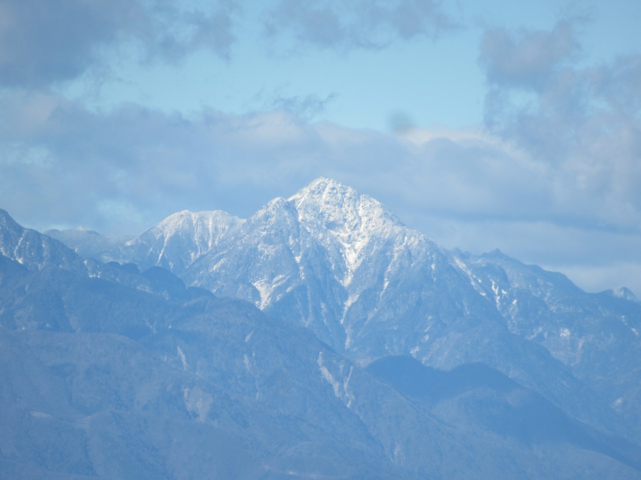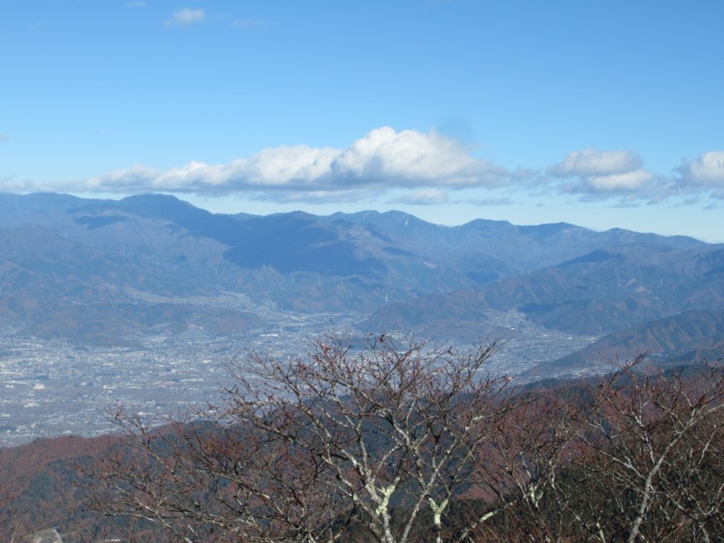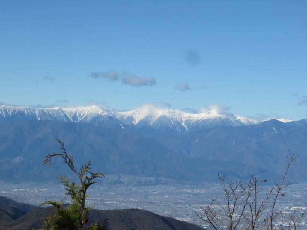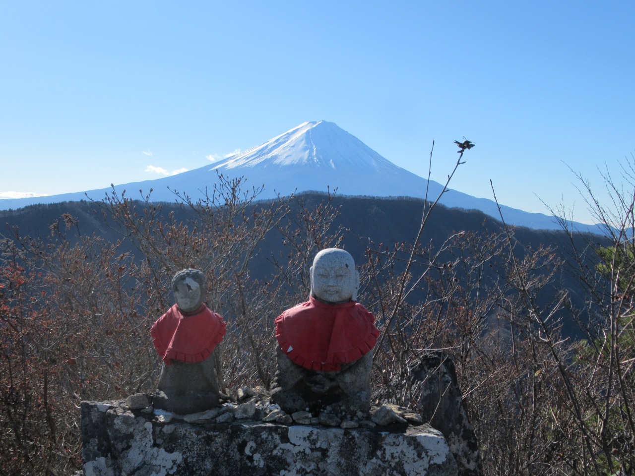 峠からですので、いきなり気持ちの良い稜線歩き、風も穏やかで幾つか小さなアップダウンの後、山頂直下のちょっとした岩場を登れば小一時間で小さなお地蔵様が鎮座する釈迦ケ岳山頂に着きました。岩山で木も無いので360度の大展望、破風山背後に富士山、白峰三山、甲斐駒、荒川、赤石、鳳凰山など白く雪化粧した南アルプス全景、金峰山から甲武信、大菩薩嶺に続く奥秩父の山並が綺麗に見渡せ、暫し観賞です。