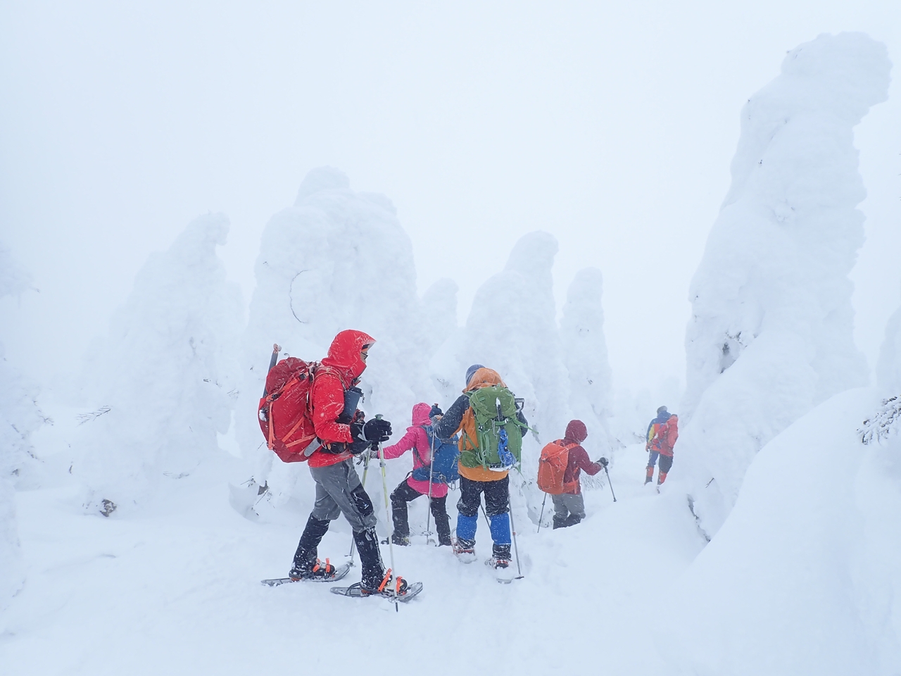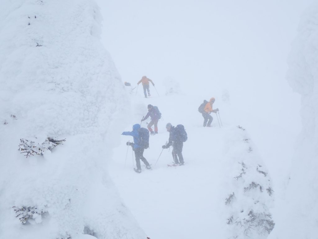 今年は雪が多いらしい。標高が上がると樹林は完全に雪に包まれて見事なモンスターが現れた。残念なのは青空背景でないこと。曇天ではモンスターが映えない。