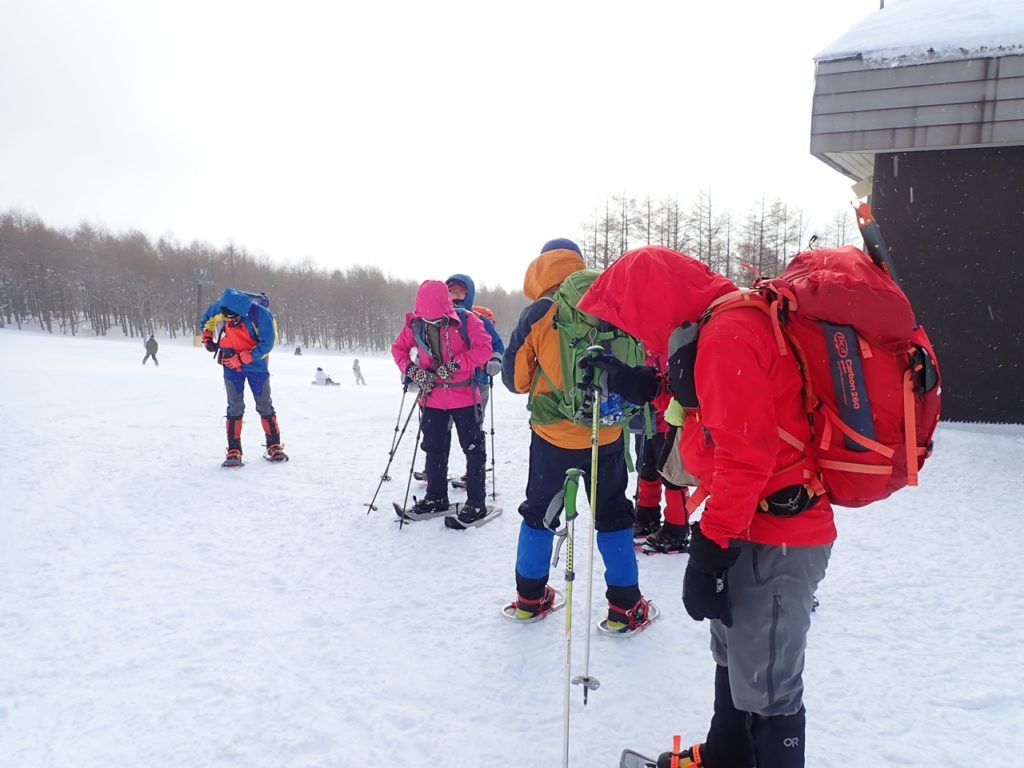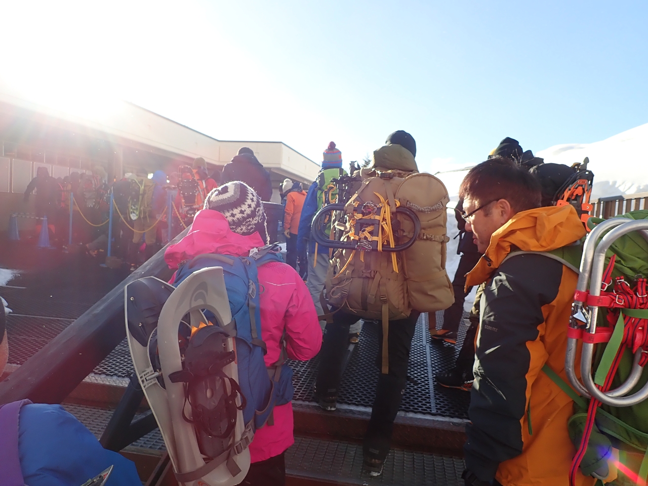 雪山準備をして、スノーシューは担いでゴンドラ山麓駅へ行く。往復チケットは2000円だった。なんとゴンドラ乗り場には30人くらいの登山者が待っていた。朝はスキー客より登山者の方が多いようだ。ゴンドラで標高350m程を約15分で登った。