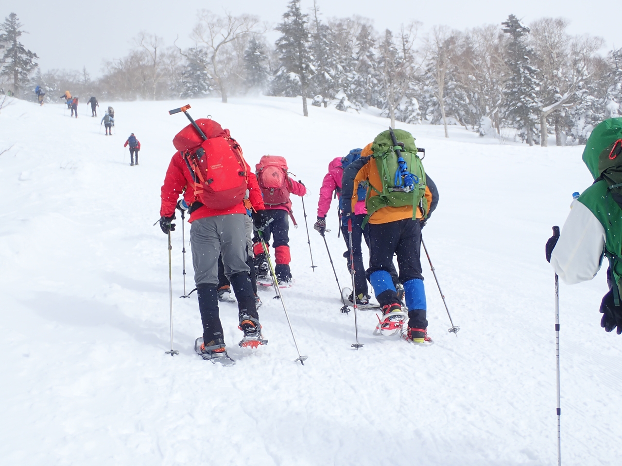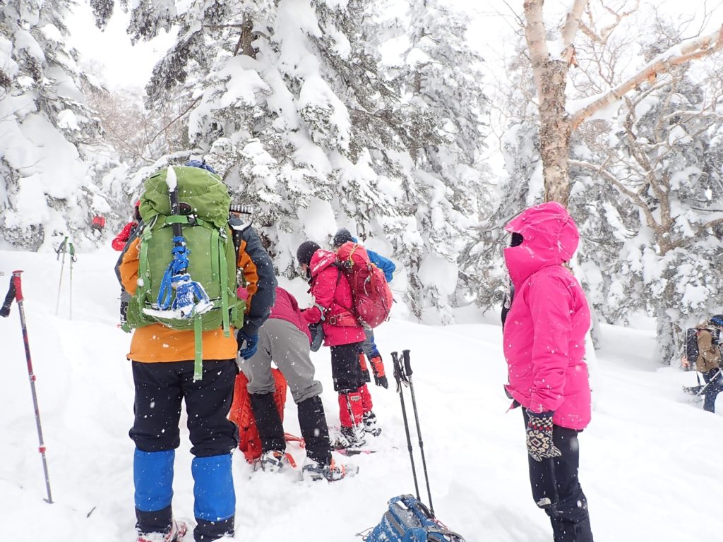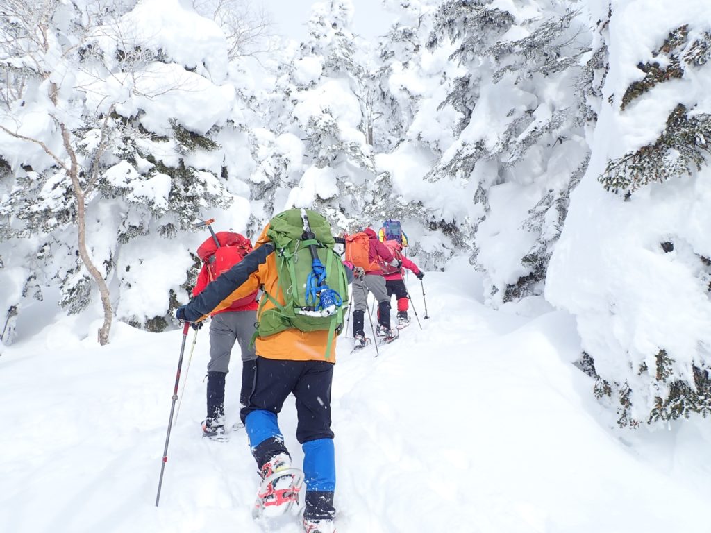 山頂駅でスノーシューを履く。今回はウッチーさんがワカンでその他はスノーシューだ。ただ、4人は会で購入したモンベル製で2人はともさんが持ってきてくれた旧式のものだ。山頂駅からゲレンデの端を登って行く。結構傾斜があるのでリフターが役に立った。ただ、旧式には無いので急な登りはきつかっただろう。30分少々でリフト最上部到着。小休止。そこからは樹林帯を登る。登山者が多いのでトレースはバッチリで、かなり踏まれているのでスノーシューよりアイゼンの方が登りやすいのではないかと思える程だった。時々、トレースを離れてパウダースノーの感触を楽しむ。私達はかなりスローペースだったのか後ろからどんどん追い越して行かれた。