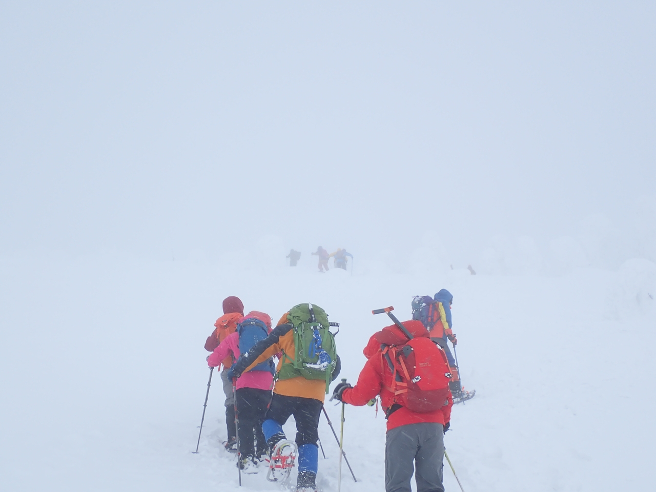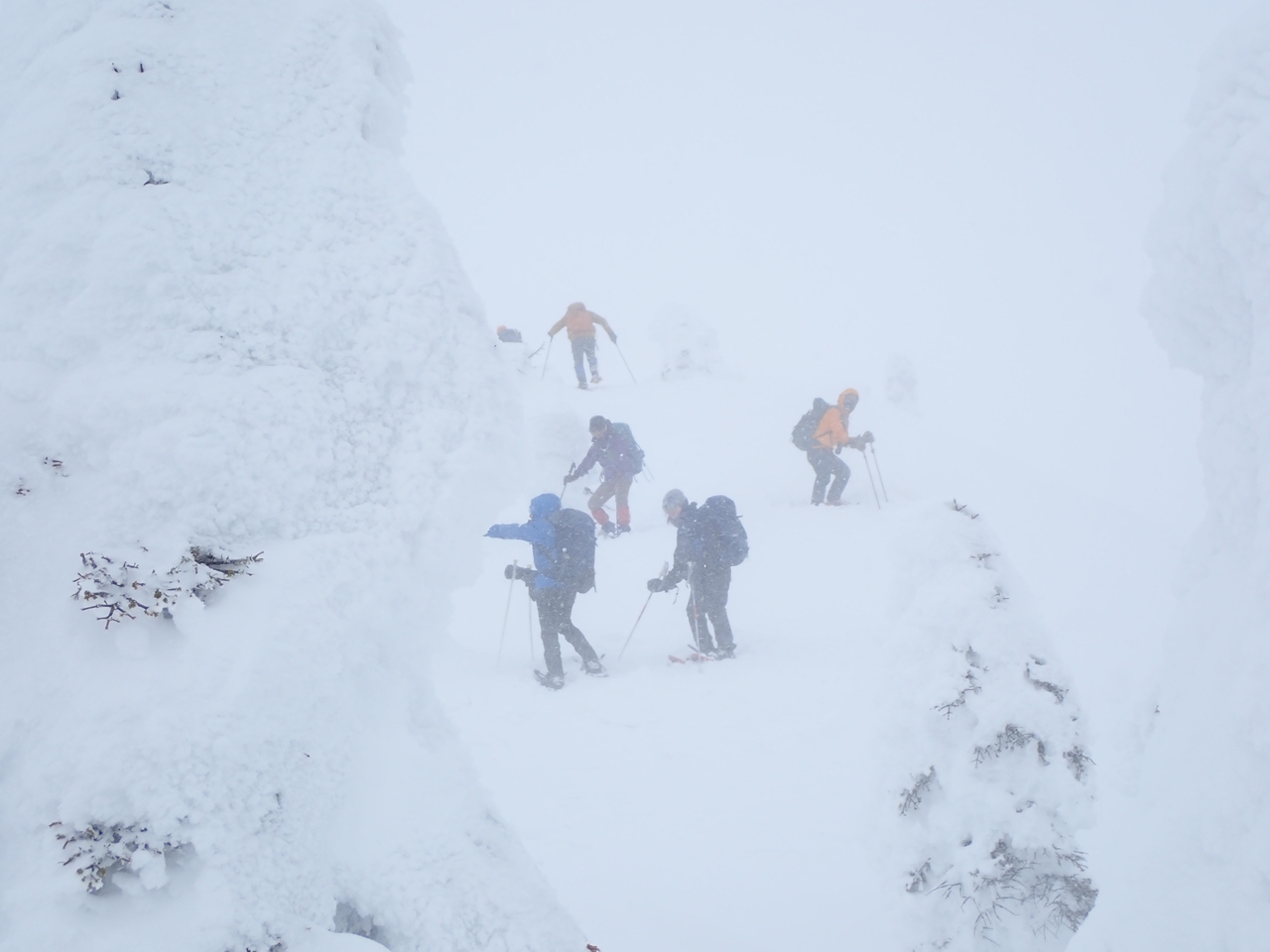 往復なのでトレースはしっかりしている筈なのだが、山頂周辺は雪が固まっていてトレースが見えづらい。濃いガスのなかの下山時は特に分かりづらかった。もちろん、先頭は「さくま」さんで私は最後尾を付いていくだけなのだが。100m程下ると、風も弱まりガスも薄くなった。そこからはモンスターを楽しみながら下れた。下りでは北方向からモンスターを見ることが多いので、登りで見た以上に白く豪快に見える。標高1650m付近まで下って小休止。13時過ぎにゴンドラ山頂駅に戻ることができた。山頂を見上げると晴れていた。少し天気は回復したようだ。4時間足らずの雪山山行だったが随分長く感じた。でも、後で5kmしか歩いていないことを知り驚いた。8kmぐらい歩いた気になっていたのだ。