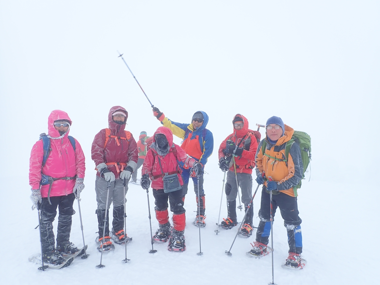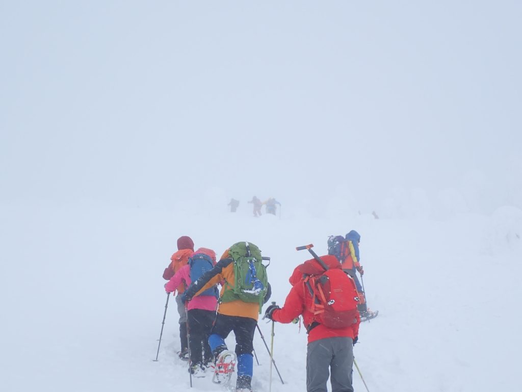 標高が上がるとガスが出て来た。山頂では強風が予想されるので直下の急傾斜下で小休止した。そこからは急傾斜を苦労しながら下る登山者が見えた。休憩後、私たちはその急傾斜を避けて少し左に回り込んでから山頂への急傾斜に挑んだ。帰宅後地形図で確認すると、左に廻りこんだ方が少し緩やかなようである。急傾斜を登って行くうちに風は強くなり、ガスも濃くなってきた。山頂少し手前で白峰会のメンバーと行き交う。何とか山頂に辿り着いた。計画では西大巓から西吾妻を目指す予定だったが、視界がホワイトアウトに近い状態では危険だ。それに、西吾妻を目指すには時間の余裕もなくなっていた。山頂脇のモンスターの陰で休んでいる登山者も居たが、私たちは集合写真を撮って早々に引き上げることにした。