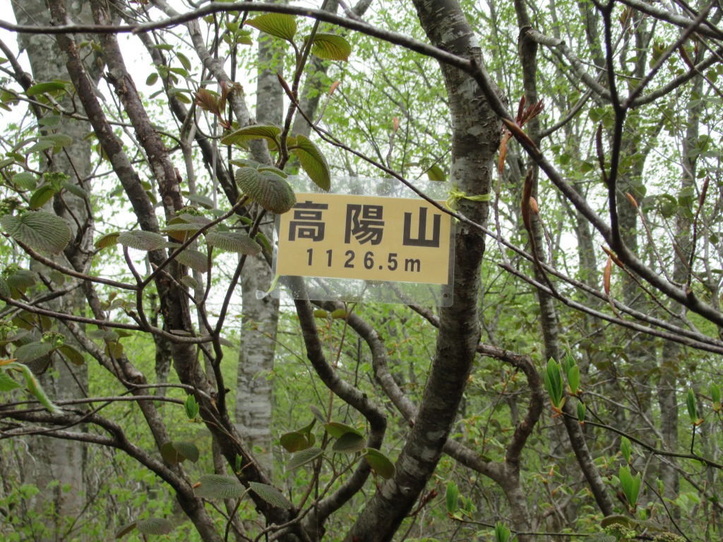 <詳細報告> 低気圧と前線が近づき午後から天候が崩れるとの予報で、小山を早めに出発しました。早朝麓は晴れ、まだ真っ白な飯豊連峰を背に目指す高陽山が濃い緑にくっきり見えた。登山口の駐車場は私達含め2台だけ、所々泥濘んだ緩傾斜の登山道を進み貯水場を越えると、みつまんさんから教えて頂いた珍しいトウゴクサイシンを見つけ、他にも地味ながらチゴユリ、タテヤマリンドウなどが見られた。標高700mからは急登となるが、新緑の綺麗なブナ林が続き、山頂手前はタムシバ、オオカメノキが多く、数は少ないがミツバツツジも咲いている。山頂は残念ながら林に囲まれ展望は無く、小雨が降り始めたので下山した。会ったのは7人程で、新緑の綺麗なブナ林と珍しい花を静かに楽しめました。 —— 他会員報告参照 ———–