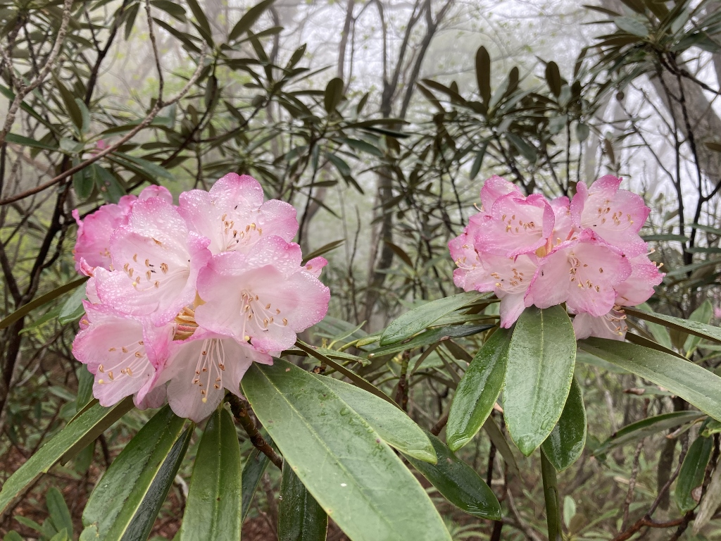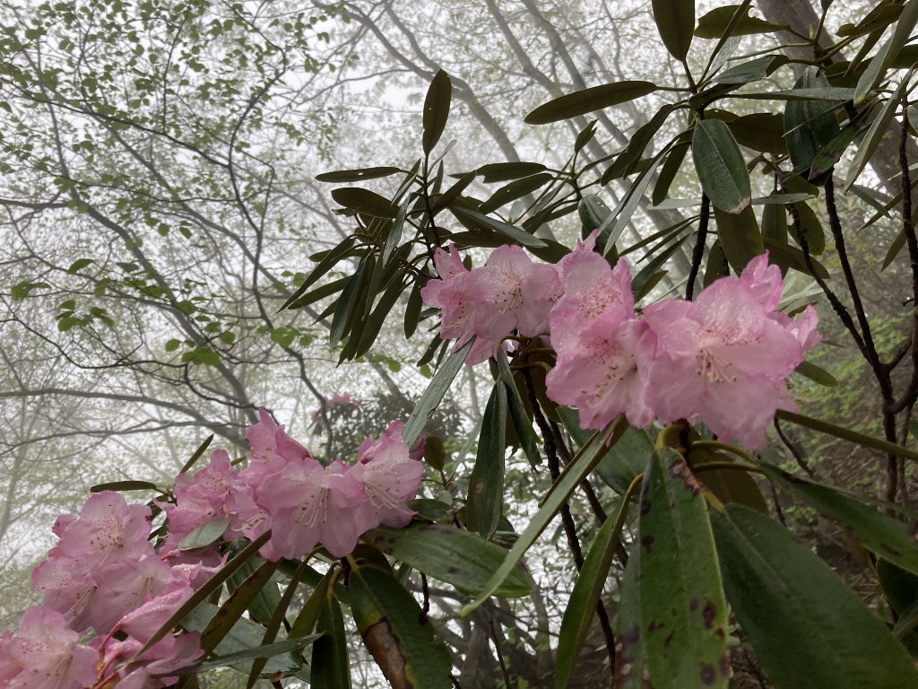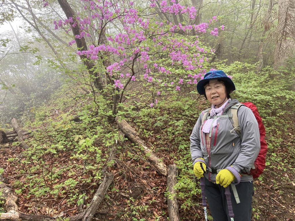 山道は良く整備されていて歩きやすかった。お目当ての花は、赤谷越え(1000m付近)からちらほら、先ずはミツバツツジ、ピンクの花が、緑に映える。仏岩当たりまで行くとシャクナゲも目立ち始めた。少々盛りを過ぎた花もあったが、高度を稼ぐに従って元気なシャクナゲに出会う。あいにくのお天気ではあるが見事な咲きっぷりを見せてくれて、満足。。暫し足を止める。