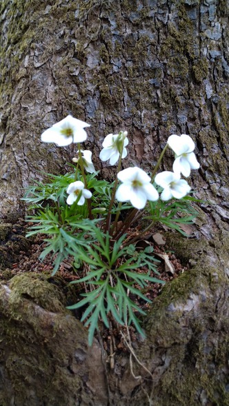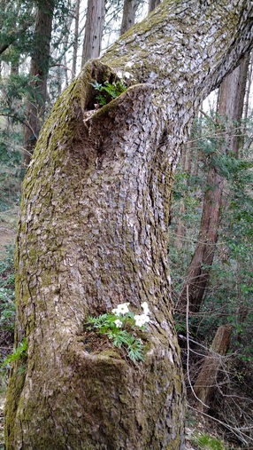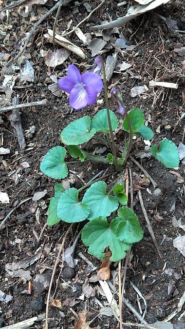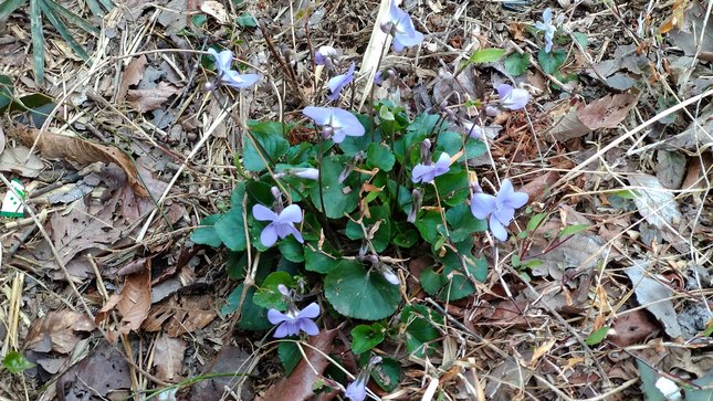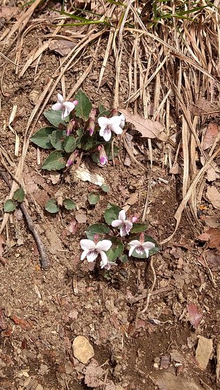 ぐみの木峠で、ベンチ後ろの大きな木の窪みに、ちゃっかりと居座っているスミレを見つけた。とても快適そうとあって美しく咲いていた。エイザンスミレかと思ったが、調べて見たらヒゴスミレのようだ。結局雨は降らず、いつの間にか天気良くなっていて、急ぐ事なかったな。