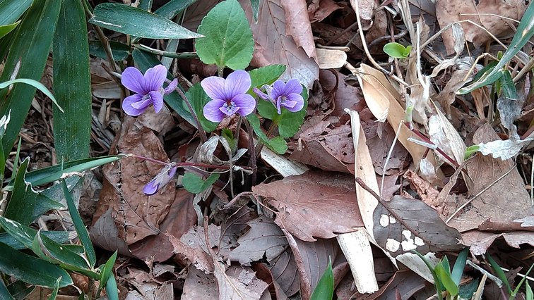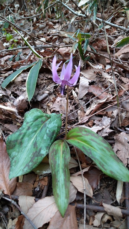 神社前の大きなしだれ桜は七分咲きぐらいかな~。登山道に入ると、先ほどまでの華やかな桜景色が一変し、静かないつもの道だ。所々で見られる山桜の清楚な感じもまた良い。「カタクリはどうかな?」と覗くと、終わっていたが、かろうじて残っているのを写真に撮り、晃石山に着くと、結構人がいたので通過した。青入山から、蕾が膨らんだツツジや花を咲かせたツツジが、ポツポツと見られる様になって来た。最盛期のこの道はとても綺麗であり、待ち遠しい。足元にはスミレがあちこちに咲いていて可愛く、ひとかたまりに咲いていると、さらに目を引いた。桜峠から馬不入山辺りには、また違う種類のスミレが咲いていた。雲行きが怪しいと言うのに、写真撮りに時間がかかる。そのわりには上手く撮れず「もういいやっ」とめげてしまうのである。お腹が空き過ぎて馬不入山で食べ始めると、「雨が降りそうですね」と、一人また一人、急ぎ足で去っていったので、おにぎりを口に放り込み下山。