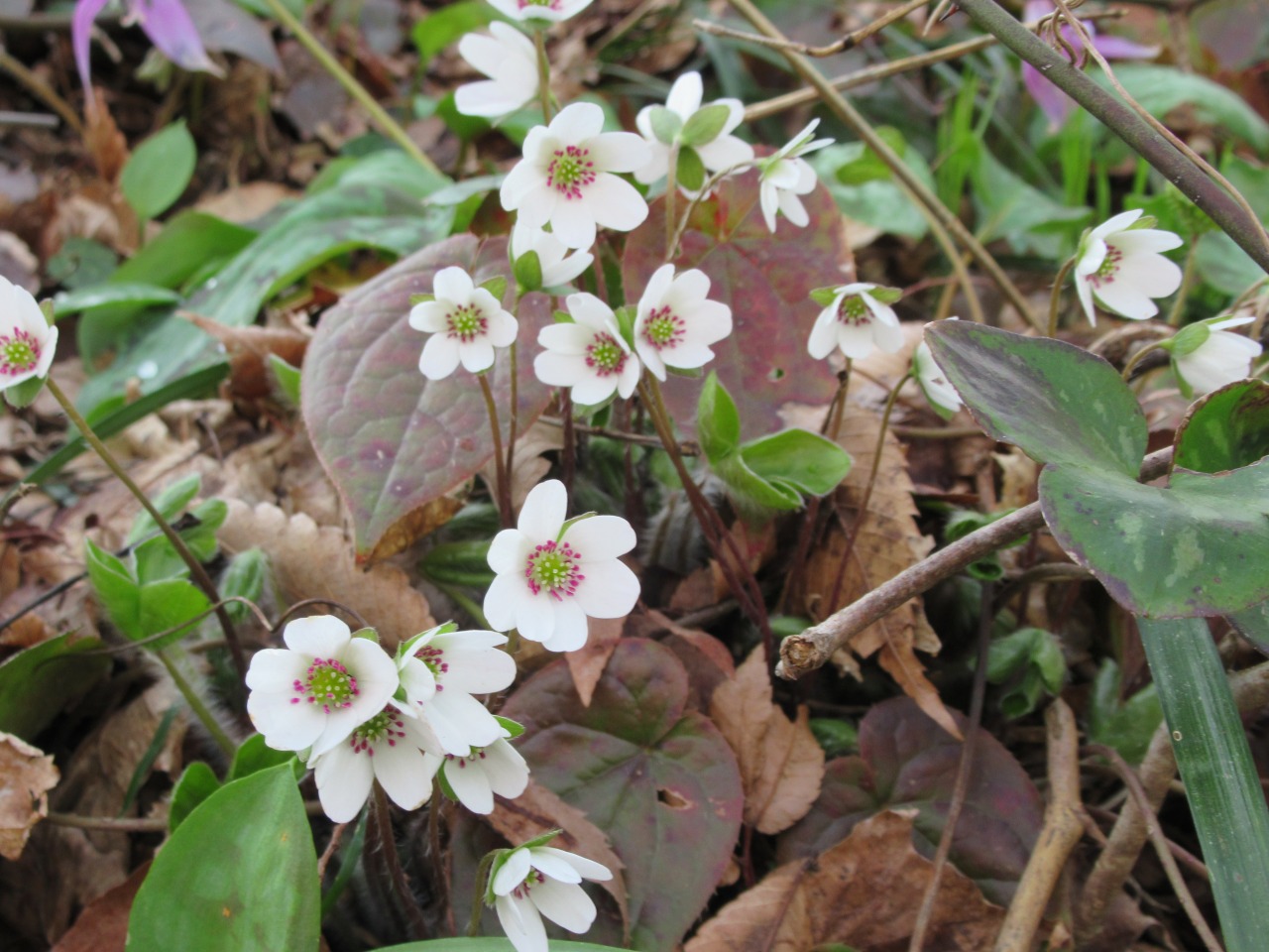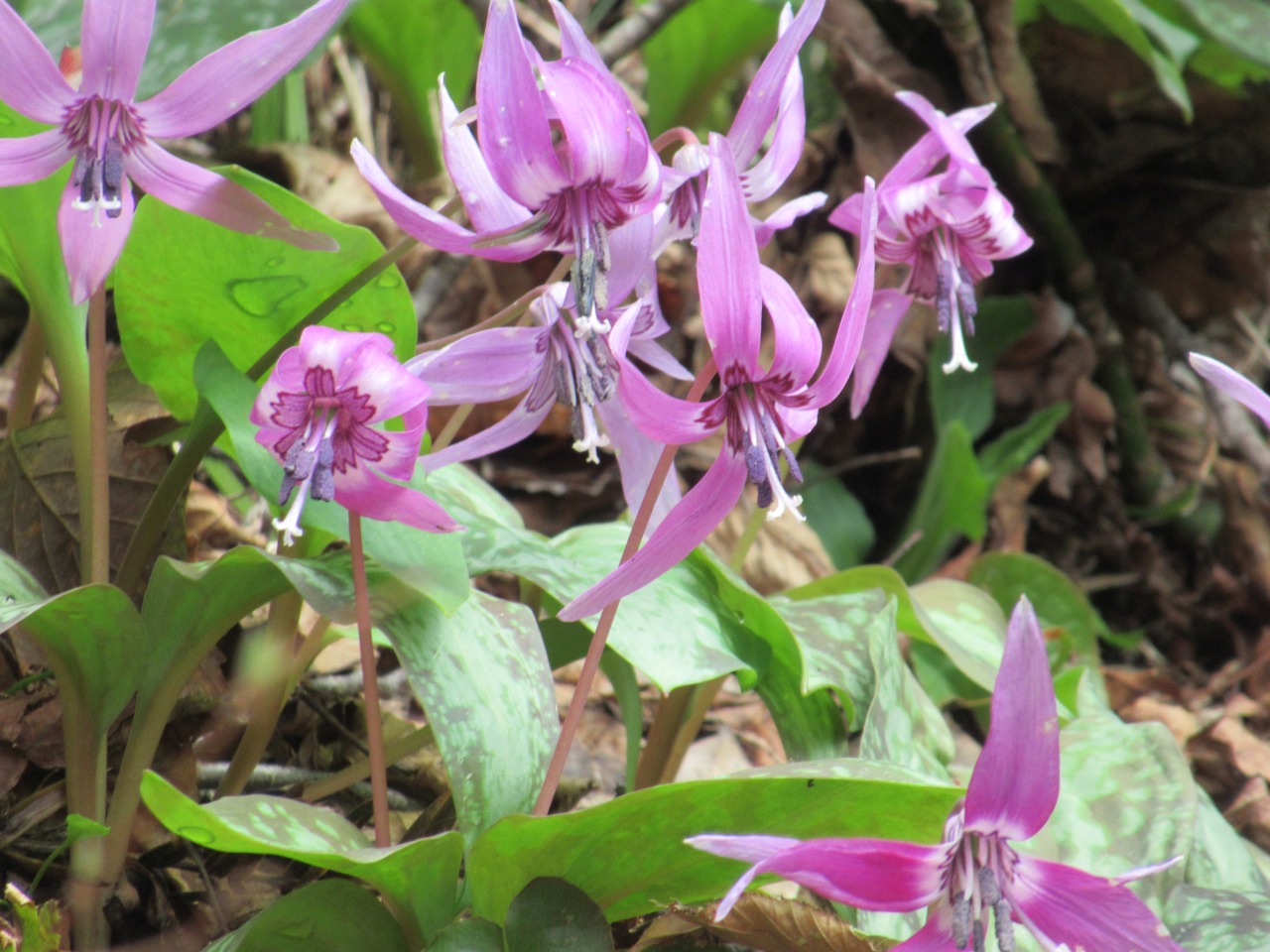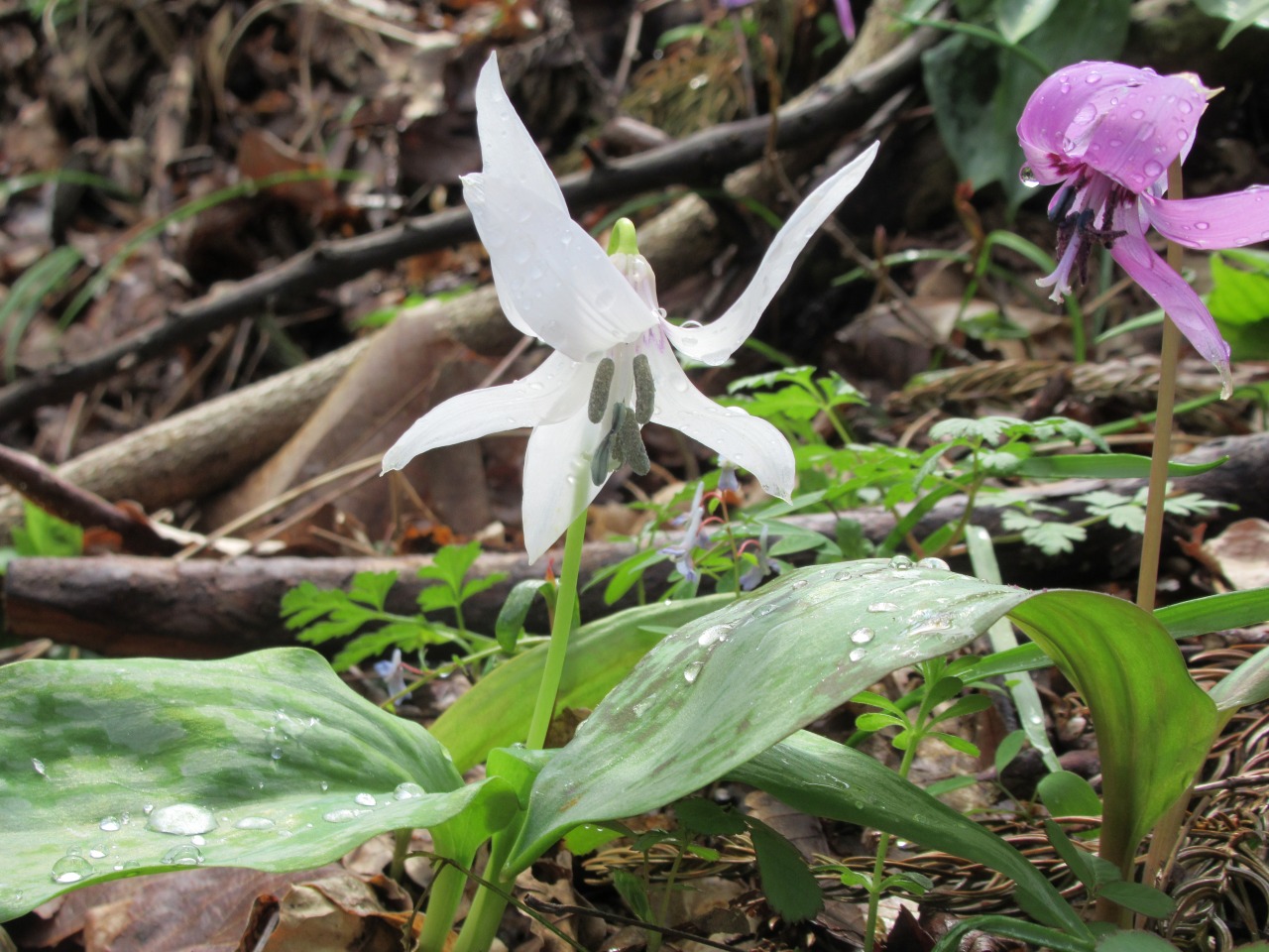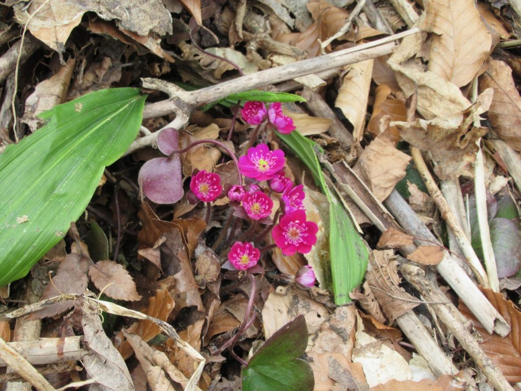 雨上がりの桜尾根登山道はぬかるんで田んぼの様ですが、雪割草は終盤を迎えているものの、色とりどりの花が咲いており、まだまだ楽しめます。少し登り急坂になると一面カタクリが咲き乱れており、最盛期、白いカタクリも見つけラッキーです。ショウジョウバカマ、トキワイカリソウ、ナガハシスミレなどの花々も見られ春爛漫といったところでしょうか?
