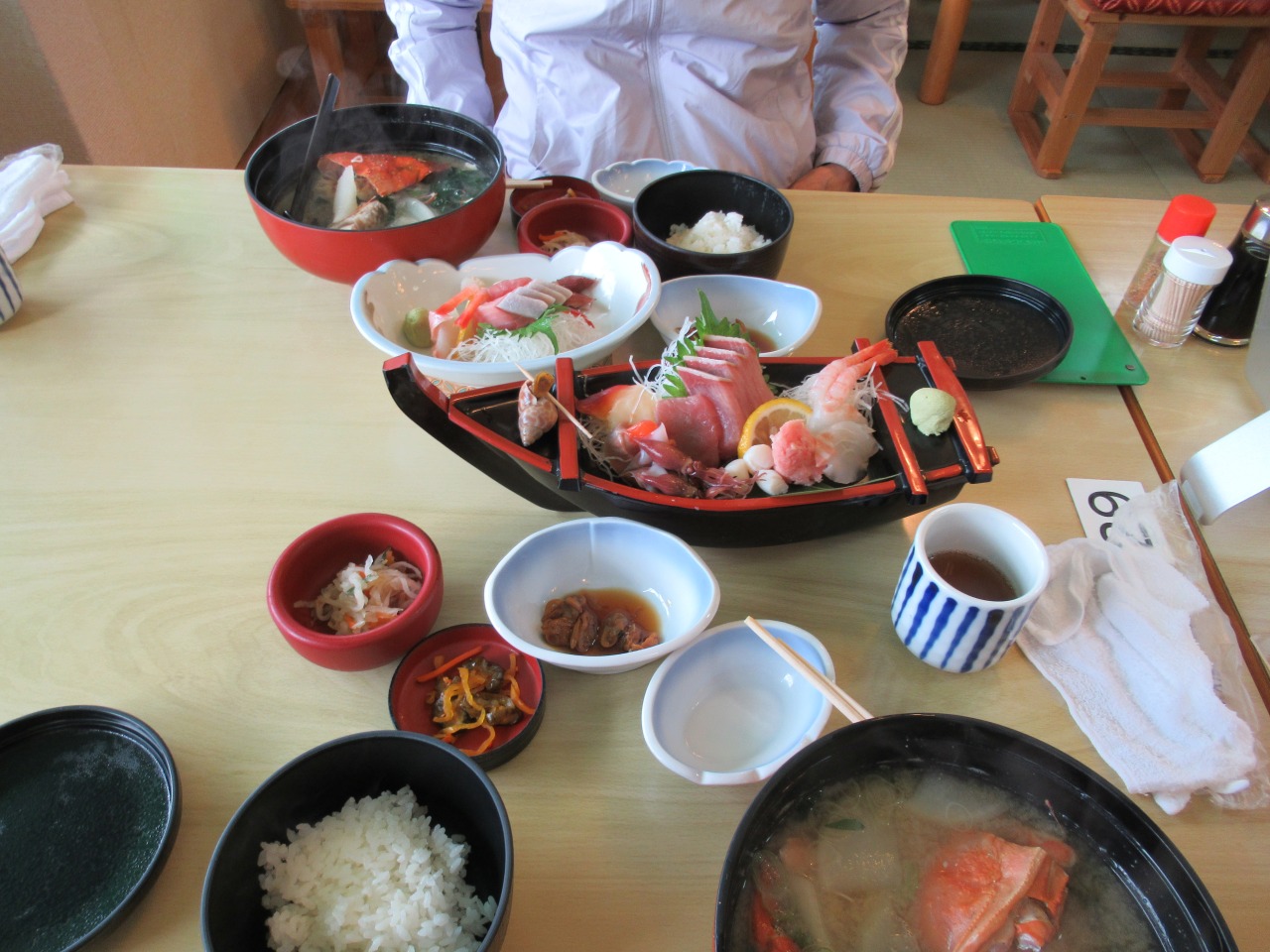 昼食は寺泊に戻りまた海の幸、よく出汁の効いた大きな器のカニ汁と近海物の船盛を食し、海産物を買って帰りました。