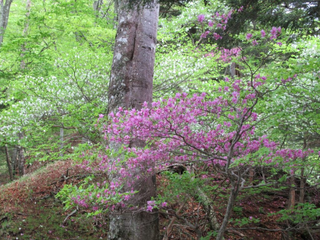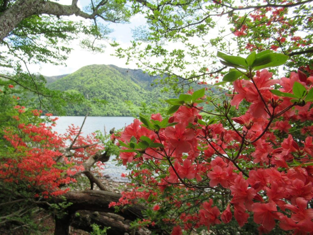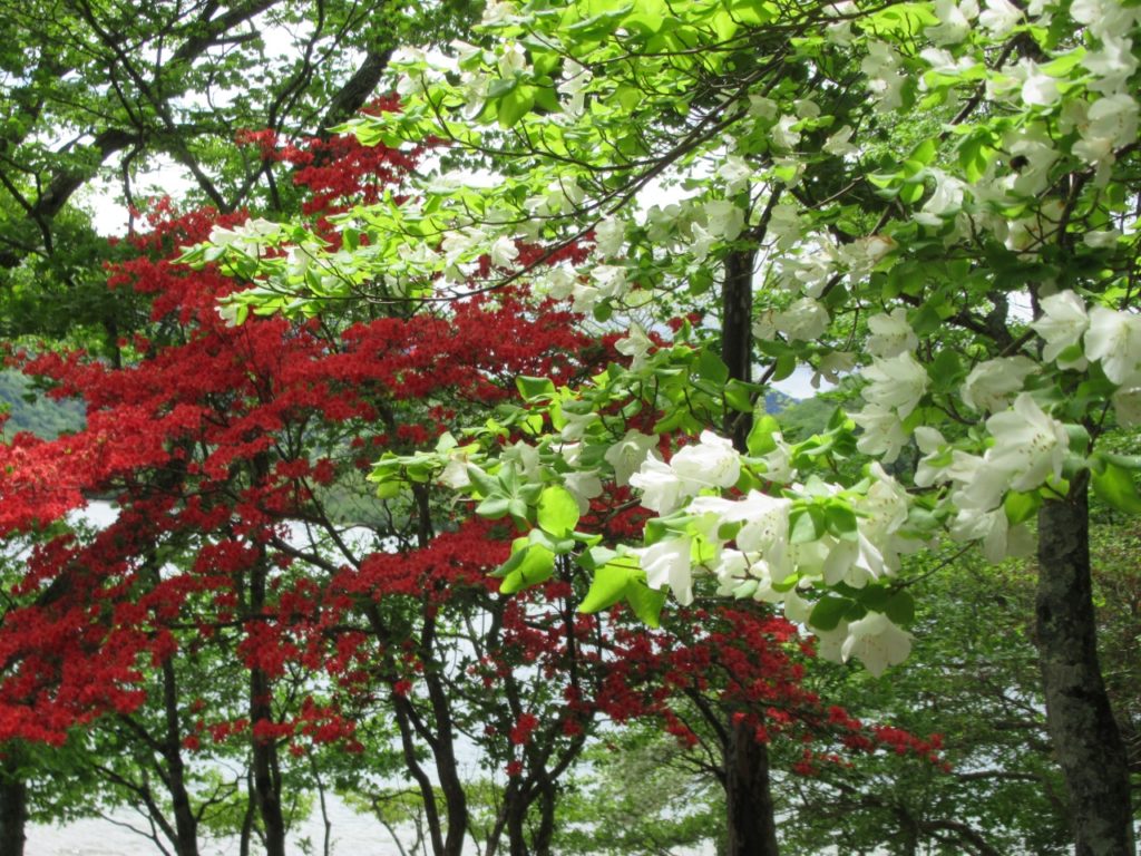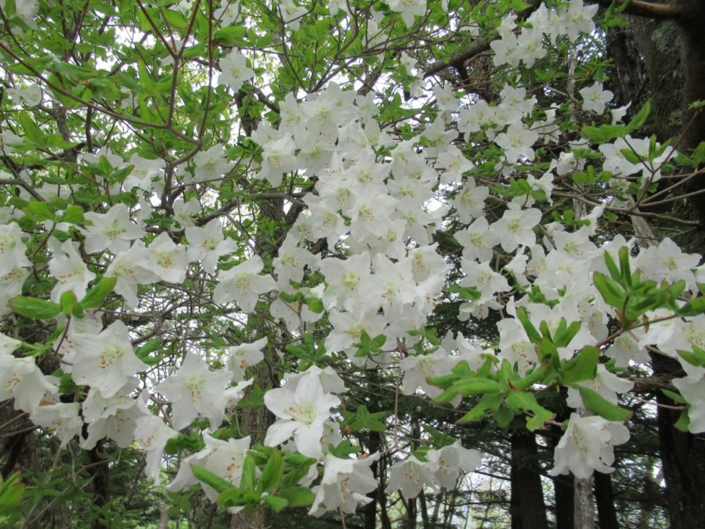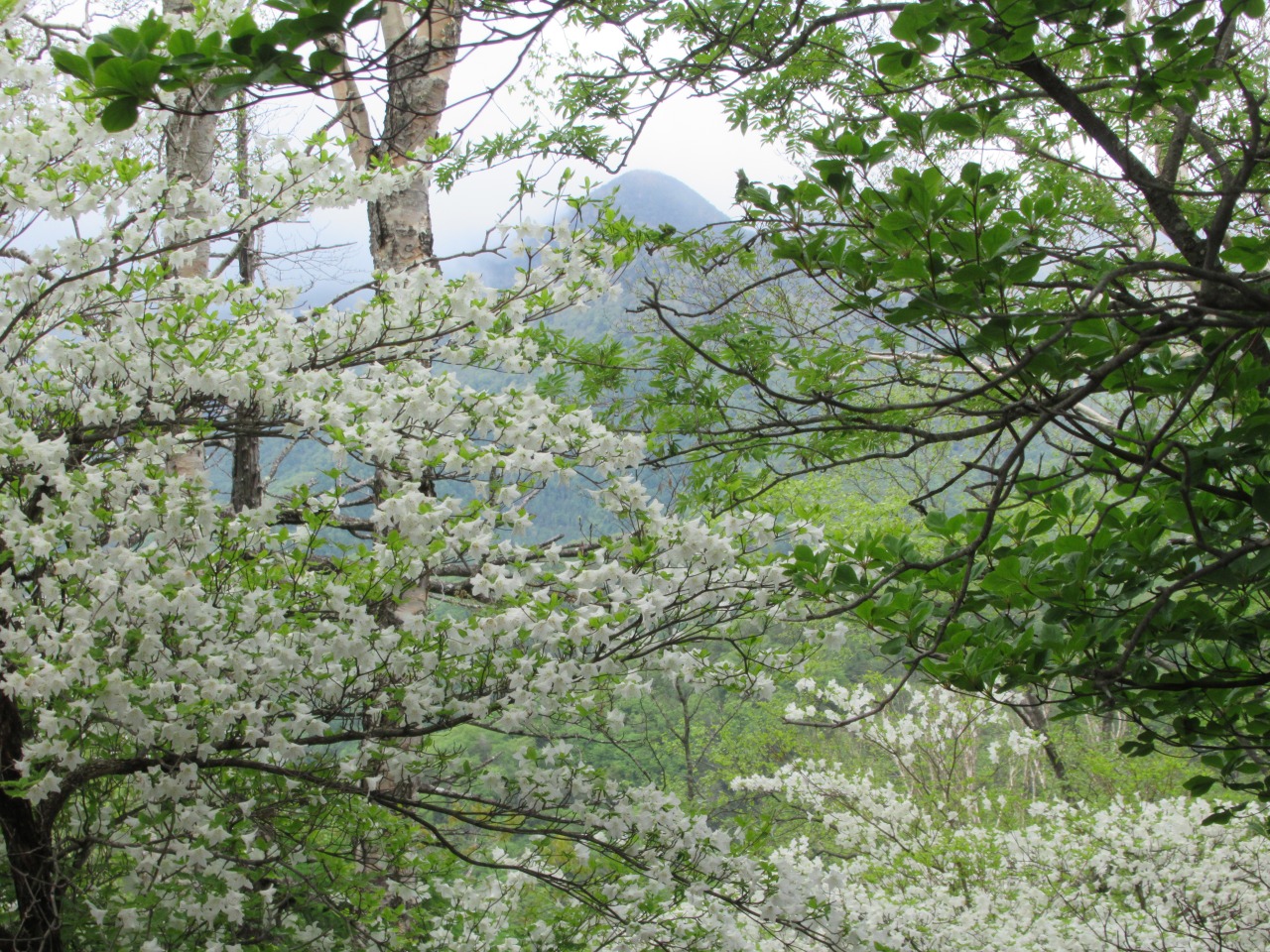 竜頭の滝駐車場はまだ空きがあり、滝を眺めながら滝上登山口へ、水量は多く、シロヤシオ、ヤマツツジ、ミツバツツジが遊歩道脇に咲いています。登山口から暫くはズミの花が多く、高度を上げるとシャクナゲ、ミツバツツジ、シロヤシオがあちこちに咲いています。シロヤシオは山頂付近が見頃で、花の付きも良く、30人程のハイカーで賑わっています。山頂から西に下ると暫くはシロヤシオが真っ盛り、湖畔ではヤマツツジが主役です。
