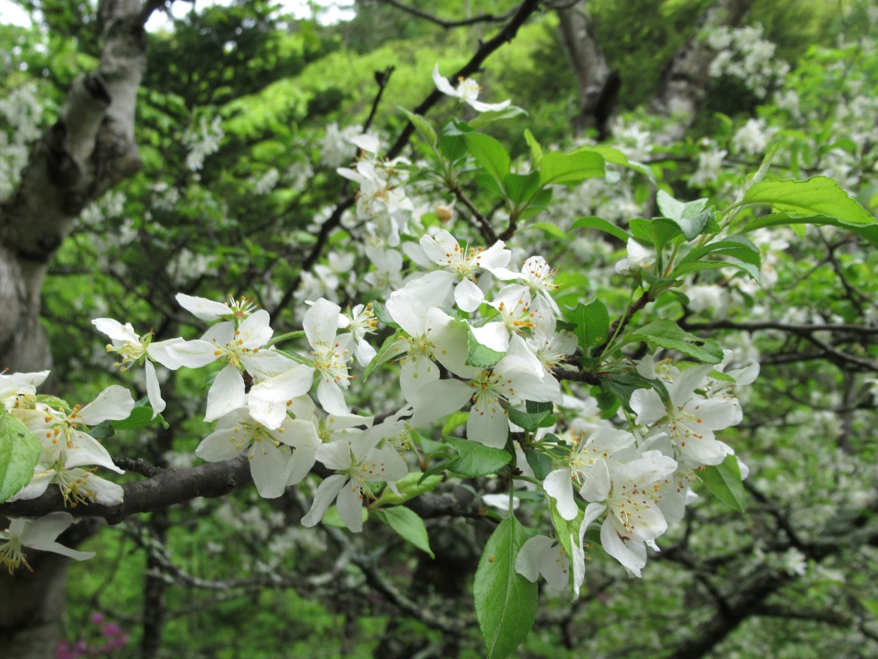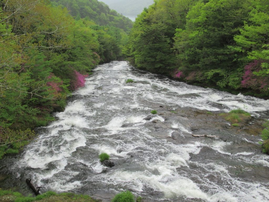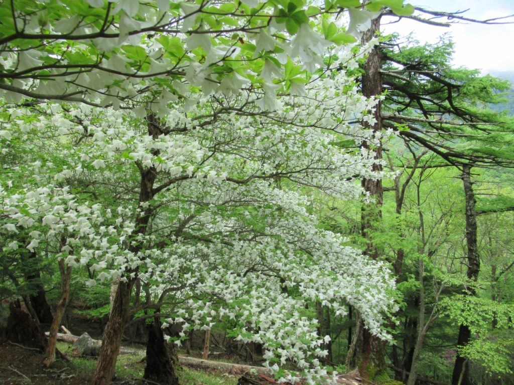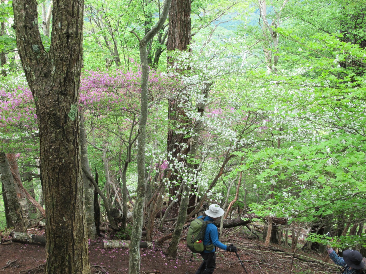 竜頭の滝駐車場はまだ空きがあり、滝を眺めながら滝上登山口へ、水量は多く、シロヤシオ、ヤマツツジ、ミツバツツジが遊歩道脇に咲いています。登山口から暫くはズミの花が多く、高度を上げるとシャクナゲ、ミツバツツジ、シロヤシオがあちこちに咲いています。シロヤシオは山頂付近が見頃で、花の付きも良く、30人程のハイカーで賑わっています。山頂から西に下ると暫くはシロヤシオが真っ盛り、湖畔ではヤマツツジが主役です。
