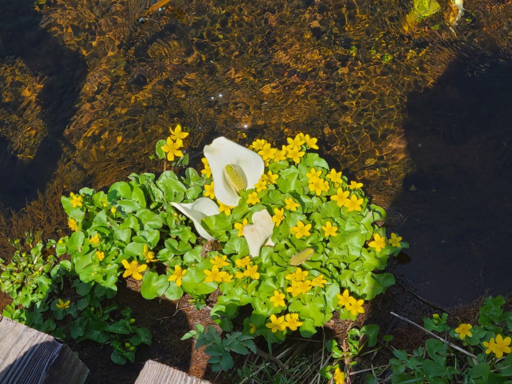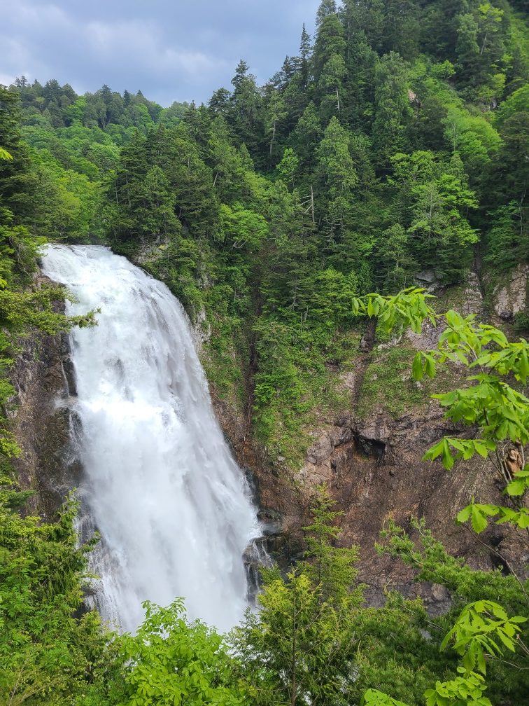 長岡百穴を6時に出発して金精峠経由で戸倉へ向かいました。第1第2駐車場は満車で戸倉スキー場へ誘導されました。きたはらさんはすでに着いていて先にチケット購入に並んでくれました。バスも次々に来て大勢のハイカーを運びます。鳩待峠には新しいおしゃれな休憩所宿泊施設が建設中で今年オープンだそうです。ますます賑やかになりますね。歩き始めてしばらくすると初の水芭蕉が現れました。そこからはずーっと水芭蕉が見飽きるくらいありました。今年は霜にやられず当たり年だそうです。その他にもエンレイソウ、リュウキンカ、タテヤマリンドウ、シラネアオイ、ミツガシワ等々たくさんのお花と行く先には残雪の燧ケ岳、振り返っては至仏山を眺めながら歩きました。あっ、たくさんの人もです。写真もゆっくり撮りたかったのですが後ろの人にあおられながらで記録にとどめるだけで帰宅後見てみるとまともな写真がありませんでした。牛首を東電小屋方面に進み温泉小屋を目指しました。温泉小屋は見晴らしから少し離れたところにあり三条の滝への中継地にあります。なのでとても静かで落ち着いています。着いたらすずが出迎えてくれました。至仏山の見える一番広い部屋に案内され荷物をデポして三条の滝へ行きました。泥濘あり階段あり岩場ありの登山道をひたすら1時間下ります。今年は雪が多く滝の水量も多くてとても迫力がありました。小屋へ戻る道はずっと登り、生ビールと唱えながら頑張りました。カフェ閉店の時間に間に合いおしゃれなテラスで生ビール至福の時間です。夕食後温泉に入りました。鉄分の多い温泉で赤茶色で鉄のにおいがしました。ぽかぽか温まり夜はみんなで暑い暑いと言いながら過ごしました。すずが部屋に遊びに来ていろんな情報教えてくれました。