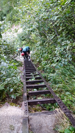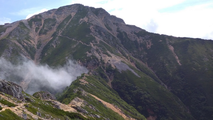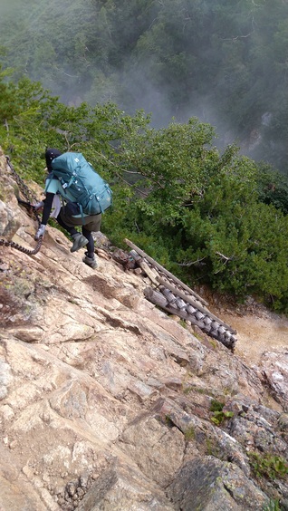 草木が露で重たそうにしていて、登山道もしっかり濡れている。小池新道は歩きやすいように石がおかれていて、スイスイだった。娘さんも途中まで一緒に歩いてくれた。秩父沢はとても大きく、水が勢いよくゴーゴーと音を立てている。2ヶ所の橋が崩壊し、3ヶ所目の橋は新しい。そこから続く登山道も作られて間もないようで、踏み固められて無く柔らかかった。わさび平小屋では野菜、くだもの、飲み物が水で冷やされプカプカしている。トマトを一つ食べ舌つづみをうち、もう一個食べたかったが、いい値段なので我慢した。笠新道登山口から笠ヶ岳は、かなりキツイらしい。