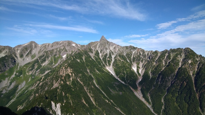 前日穂高駅駐車場で車中泊をし、翌朝、駅前バス停より出発(歩いて8分程)。中房温泉には、すでに沢山の人々が準備をしていて、トイレも並んでいる。合戦尾根は、長い急登と今年の猛暑でかなりキツイ。ちょうどいい間隔でベンチがあり、広い休み所になっているのは、気分転換にもなり上手く出来てるものだ。燕山荘まで、とのかく人が多く、15名の団体の後ろにはどんどん渋滞が繋がって行く。第一ベンチからは、バテぬようにゆっくりだが自分達のペースで歩き順調だ。合戦小屋が近くなると、花崗岩が多い道となり、燕岳の雰囲気を感じる。合戦小屋では、待ちに待ったスイカで長めの休憩をとる。スイカ汁で顔がビシャビシャになるほどガツガツだった。まだまだつらい登りが続くが、展望が開けると槍の穂先が見えたり、花畑があったりすると楽しい。燕山荘からは絶景である。なかでも、特に槍ヶ岳の北鎌尾根の険しいギザギザに目を奪われた。この先からは、ずっ~と槍を眺められる平坦な道が続き、とても快適だ。コマクサは色あせて枯れ気味だが、沢山あった。斜面をうろつくサルの集団を見たが、熊を見なくて良かった。後で、蛙岩を横切った話を聞き驚く。切通岩を注意して下り、すぐに急な階段が続き、終盤の疲れた足は一歩一歩となる。ところが、大天井岳の巻き道は、30分以上の緊張しっぱなしで、疲れがその時だけ吹き飛んだ。崖っぷちの鎖の連続である。ザレ場に出て、大天井ヒュッテの赤い屋根が見えた時、安心した。部屋は個室で気兼ねなく、ゆっくり出来きたが、トイレの臭いはかなり辛かった。
