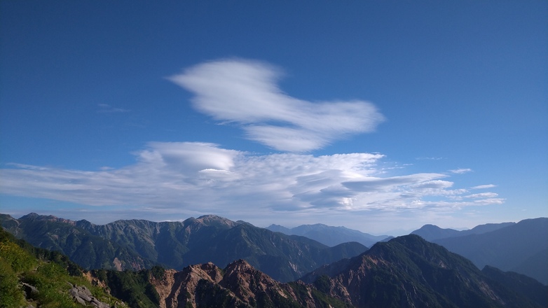 5時の朝食を山荘で食べてから出発。今日は下りが多く体力的には楽と思ったが、そうでもなかった。距離がある上、ザレ場の急なくだりと、ザレたヤセ尾根と谷側の切れ落ちたザレ道は緊張する。滑ったら下まで行くな、とか、あの辺で止まるかな、など考える。段々遠のく槍ヶ岳を振り返えれば後光が差し、目の前には山々に映る槍の影をみる。日が昇ると、筋状の円盤型の雲(レンズ雲かな?)が現れ、4つ出来た。樅沢岳からはガスで何も見えなかった。槍ヶ岳方面もすっぽり雲の中になってしまった。