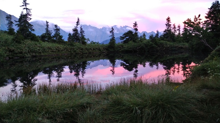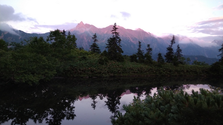 鏡平山荘に着くと、Sさんの娘さんが出迎えてくれて「元気だねー」と驚いていた。さっそく、抹茶あずきのかき氷を食べクールダウンだ。身体の熱も半分引き、じっくりと、メルヘンチックな美しい景色をボーっと眺める。そうしているうちにに雨が降り出した。「赤槍は見られないだろう」と思っていたが、食後しばらくして、見えてる情報があり鏡池へ。何とも美しい景色に興奮気味だった。赤く染まった槍ヶ岳、穂高岳が鏡池に映るのだ。自然の美しさに見入った。