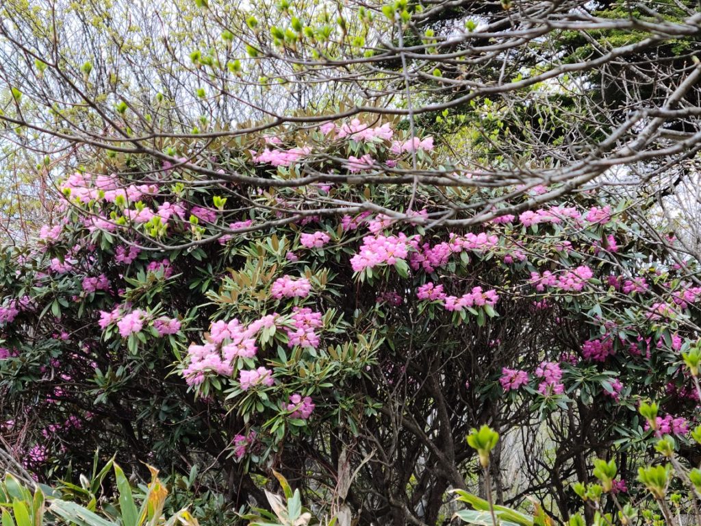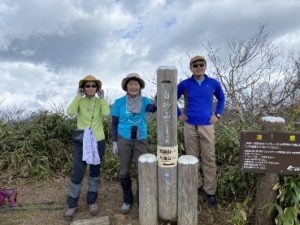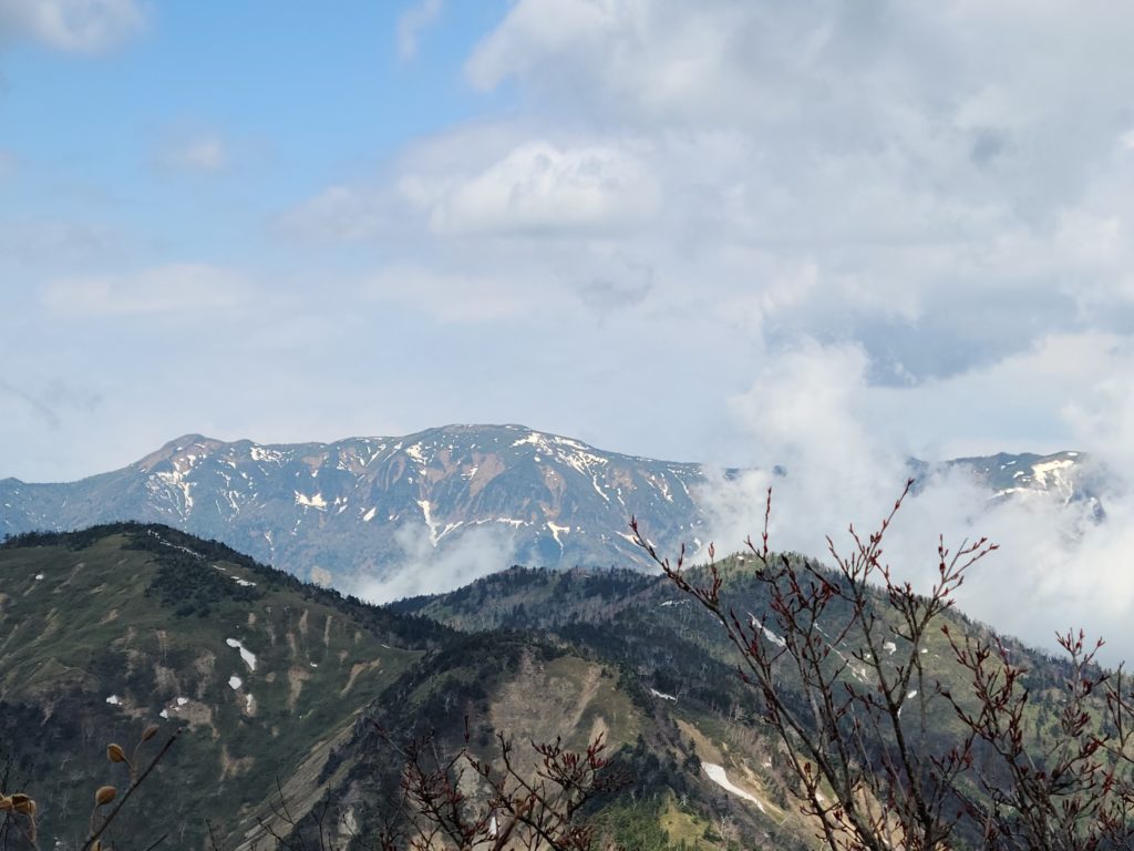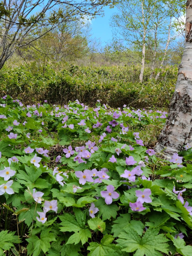 <詳細報告>前日、川原湯温泉駅できたはらさんをピックアップし、駅前のおしゃれな温泉(石鹸のみ990円ちょっと高い、シャワーのお湯が出ず後から来た人に伝えてもらう。きれいだがサービスは?)で汗を流し野反湖バンガローに入る。5畳ほどのこじんまりとした部屋。シーツと枕カバーは料金(1棟7150円)に含まれ掛け布団に触れないようシュラフカバー持参とのことで持って行った。布団はとても清潔な感じだった。板張りの部屋だが断熱材が入っているようで朝方少し寒い思いをしたぐらいで快適だった。朝4時起床5時過ぎに登山口駐車場に移動する。もう数台停められ出発している人もいるようだ。もやがかかる中歩き出す。エンレイソウやミツバオウレンマイズルソウの群生の道を進む。だんだんガスも晴れ振り返ると野反湖や草津温泉の街並みが眺められた。登山者は私たちだけと思っていたら堂岩山に着いて休んでいると続々と後から登ってきてあっという間に7~8人に抜かれてしまった。堂岩からの稜線歩きはとても気持ちがよかった。冷たい風にも助けられいくつかのアップダウンを繰り返し山頂に到着。360度の展望と3年前にできた上信越トレイルの道が続いている。5分ほど先の3県分岐の標識があるようで向かっている人がいた。小野子山上空には積乱雲があり北から雲が湧いてきているので早々に下山。続々と登ってくる人とすれ違う。八間山分岐で協議し八間山周回はせず予定通りピストンで登山口に下りた。野反峠に移動して、10分のところにあるシラネアオイの群生地まで行ってみた。斜面一面にシラネアオイの花が見ごろでとてもきれいだった。