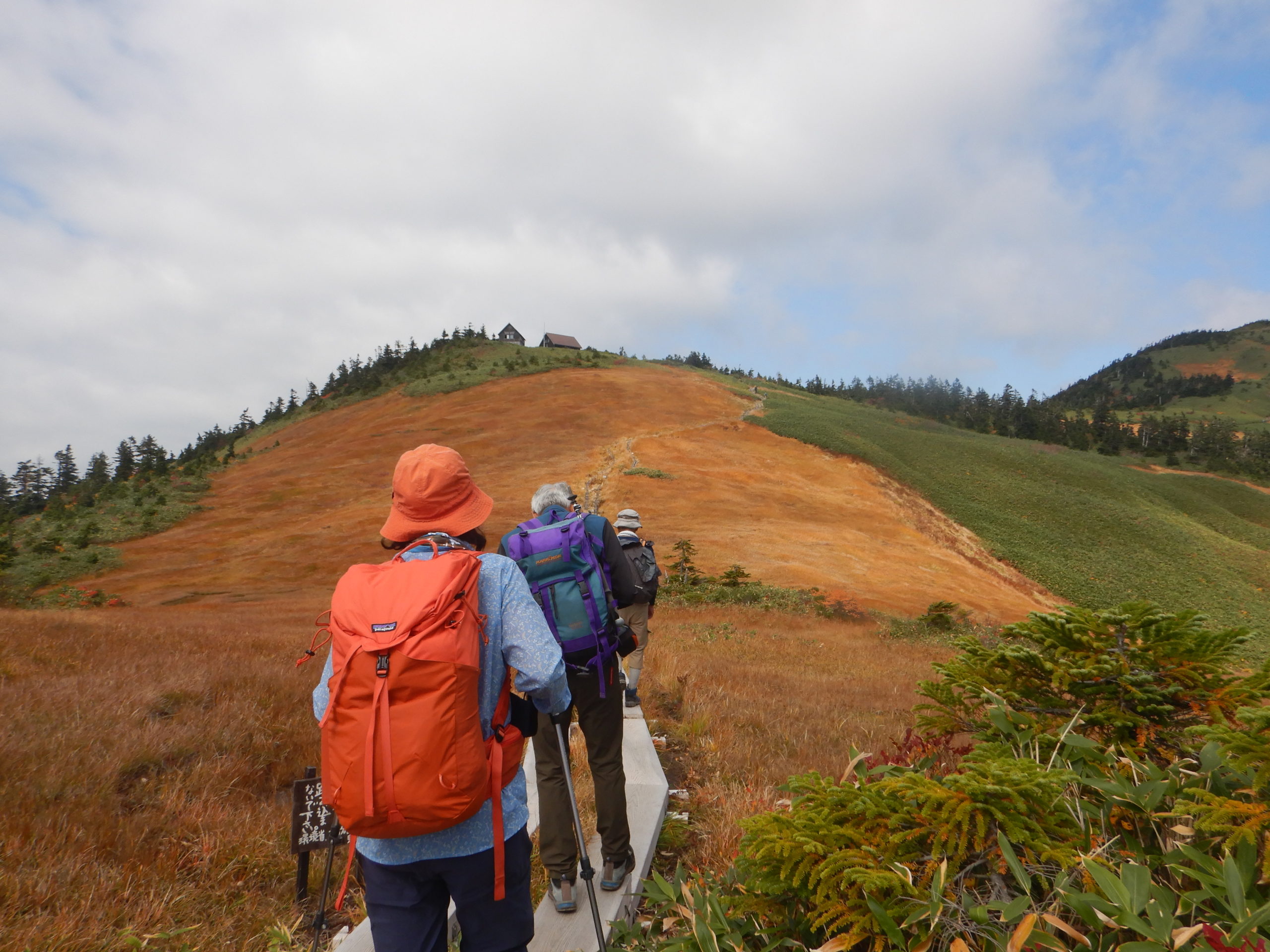 小屋にあるベンチで休憩。山頂まで一面の草紅葉に今までの疲れはなくなっていました。小屋周辺には、登山者が20~30人はいるでしょうか?比較的女性がおおく感じました。