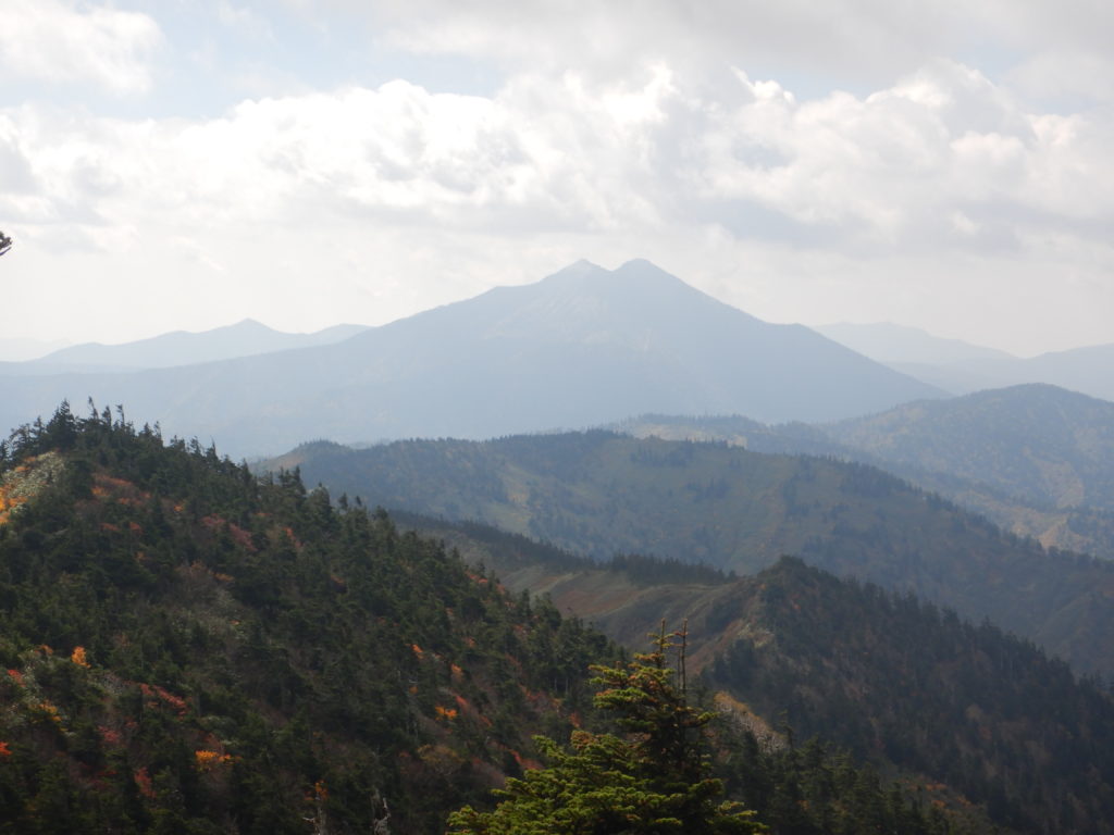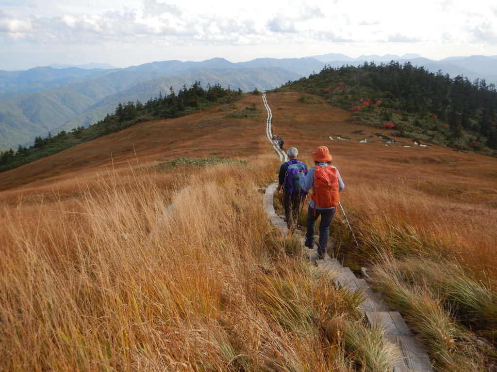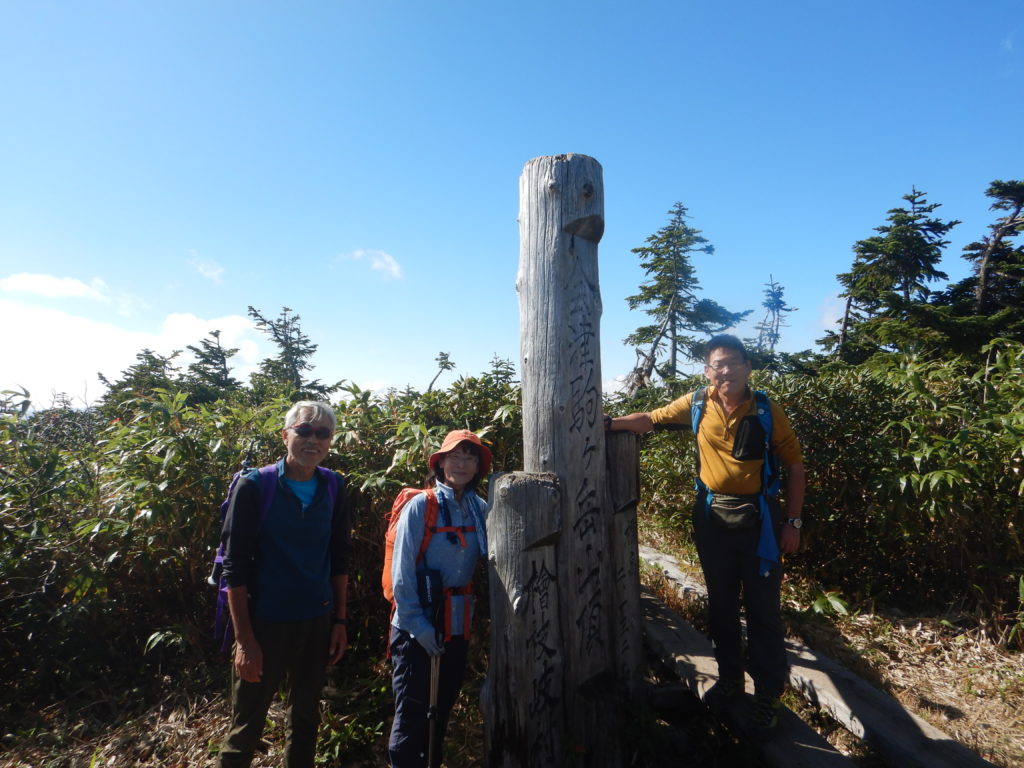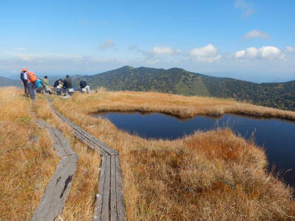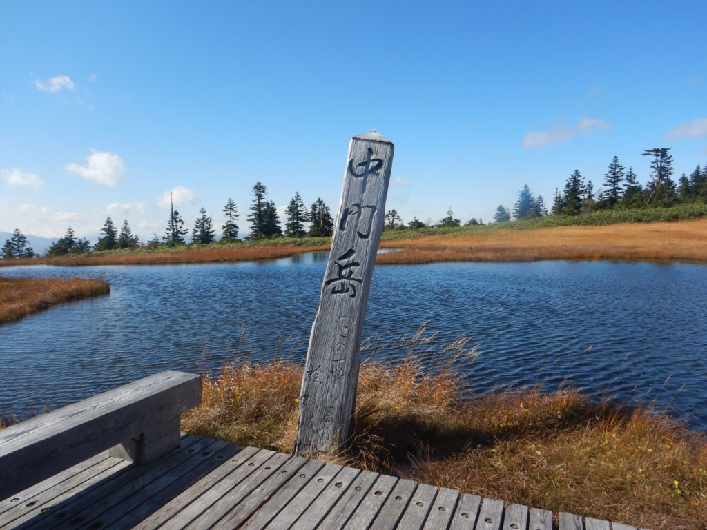 そこから、木道を進み中門岳に向かい、草紅葉と心地よい風のベンチで大休止。昼寝でもできたらシアワセだろうな。という気持ちでした。風が少し寒く感じてきたので、来た道を戻り本日の目的地、会津駒ケ岳に移動しました。山頂を表す「会津駒ケ岳」とかかれた大木は背の高い笹の中なので、周りの景色は望めませんでした。記念写真を撮って下山。