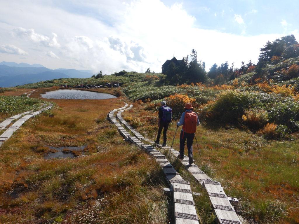 <詳細報告>滝沢駐車場はほぼ満車状態。ゲートに近い道路わきに車を止めて出発。天気が心配でしたが、雲が次第に取れて、青空が見えてきました。予想外の天気に驚きました。高度が上がるにつれ、葉の色が赤や黄色に色づいてきました。ベンチのある水場を通過して最後の急登を登ると、待望の草紅葉が現れました。そして、草紅葉の中の木道の先には駒の小屋がありました。