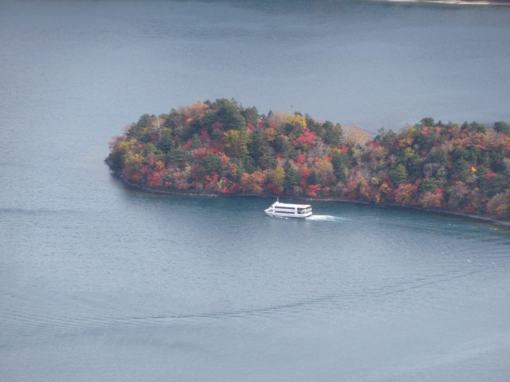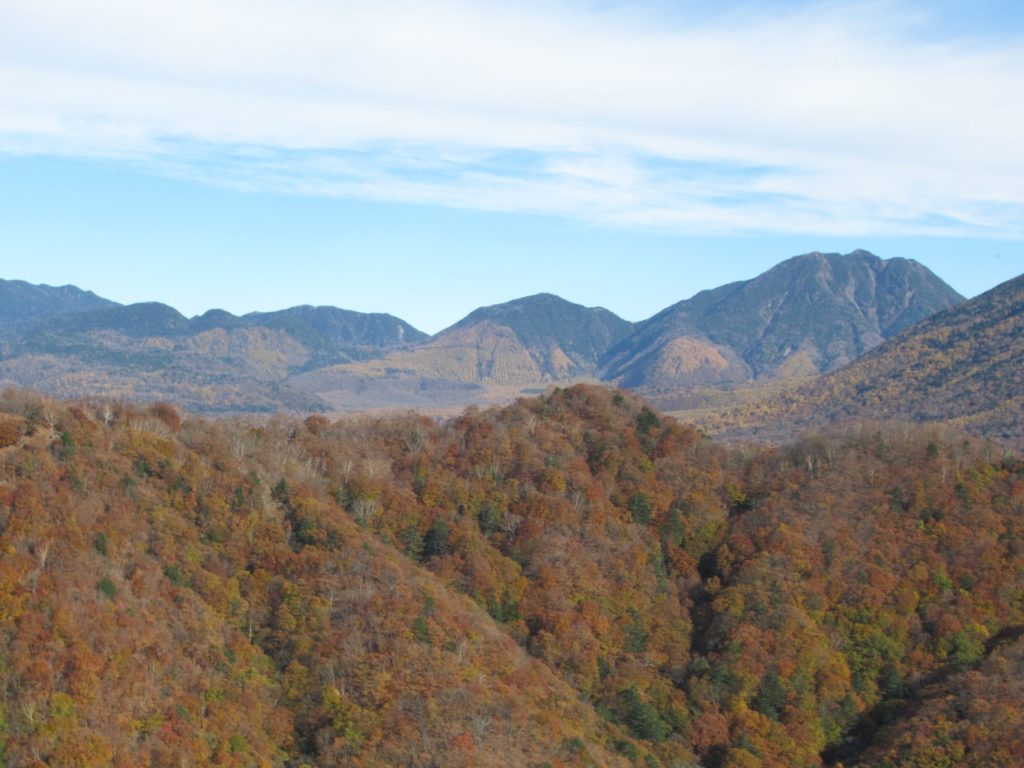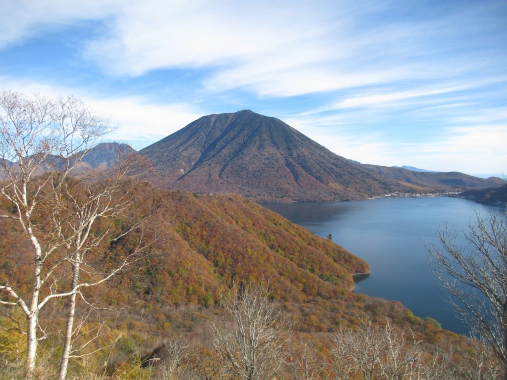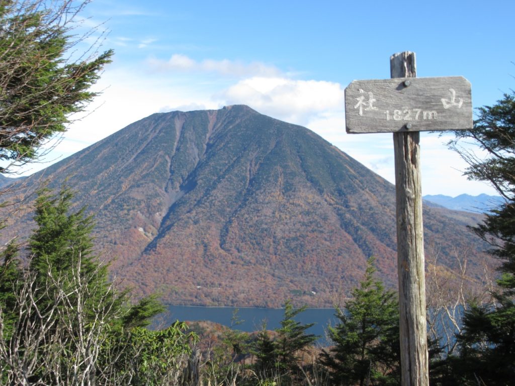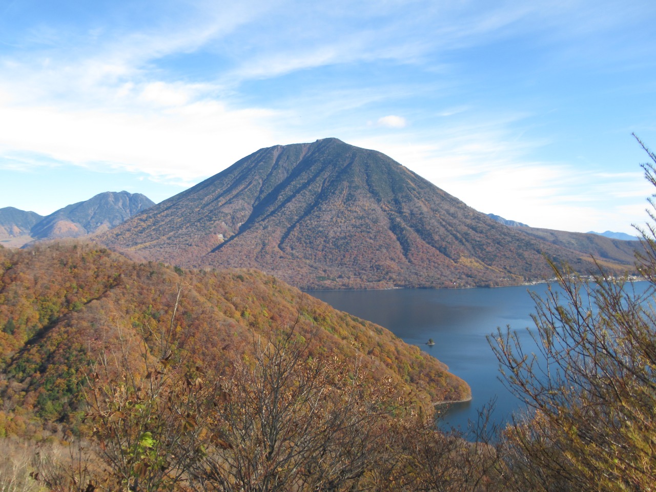 阿世潟まで1時間程道路を歩き登山道に入りますが、早朝のためか人影も疎ら、カラマツはまだ色付き始めですが、西側の長手沢方面は綺麗に色付いています。さらに高度を上げると、雄大な男体山を背景に、中禅寺湖と八丁出島を周遊する遊覧船が眼下に見渡せ、写真撮りで中々歩が進みません。漸く山頂に着くと、眼前に広がるのは太郎山、日光白根山、皇海山といった雄大な山々の連なり、遠くには筑波山、富士山、スカイツリーなど、澄み切った秋の眺望が広がっていました。