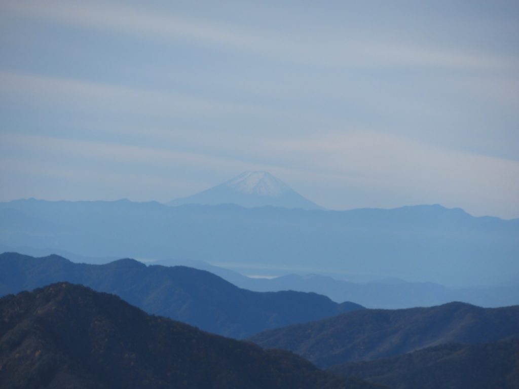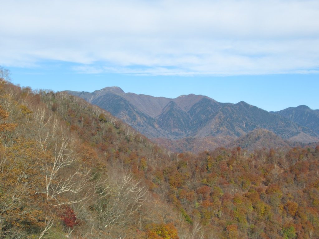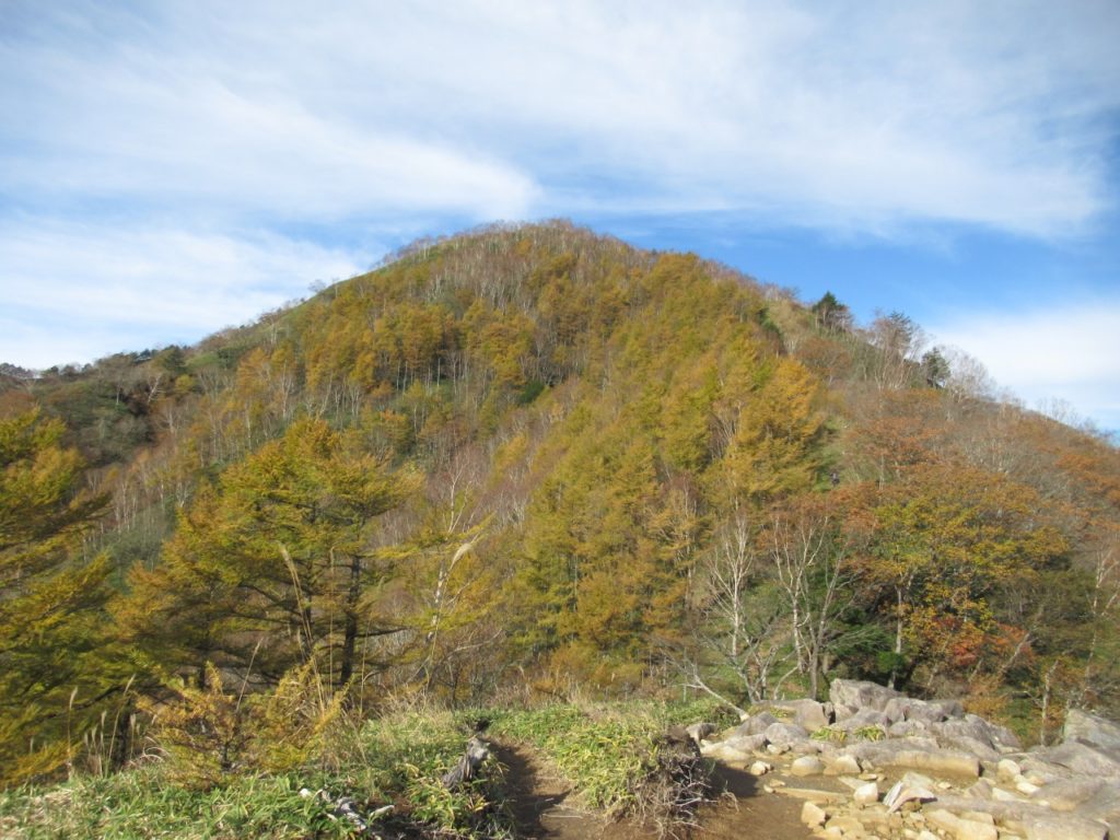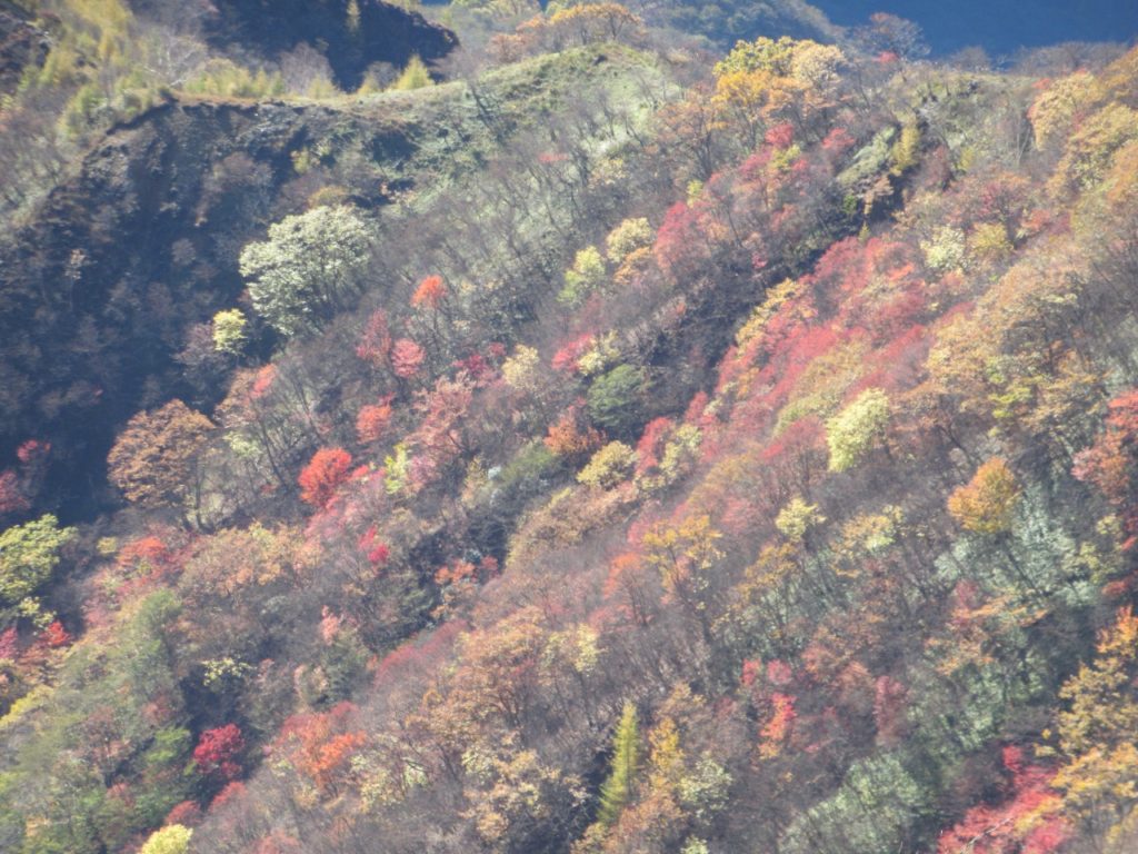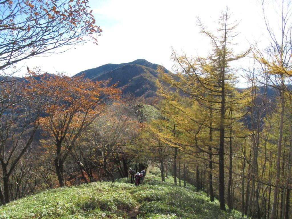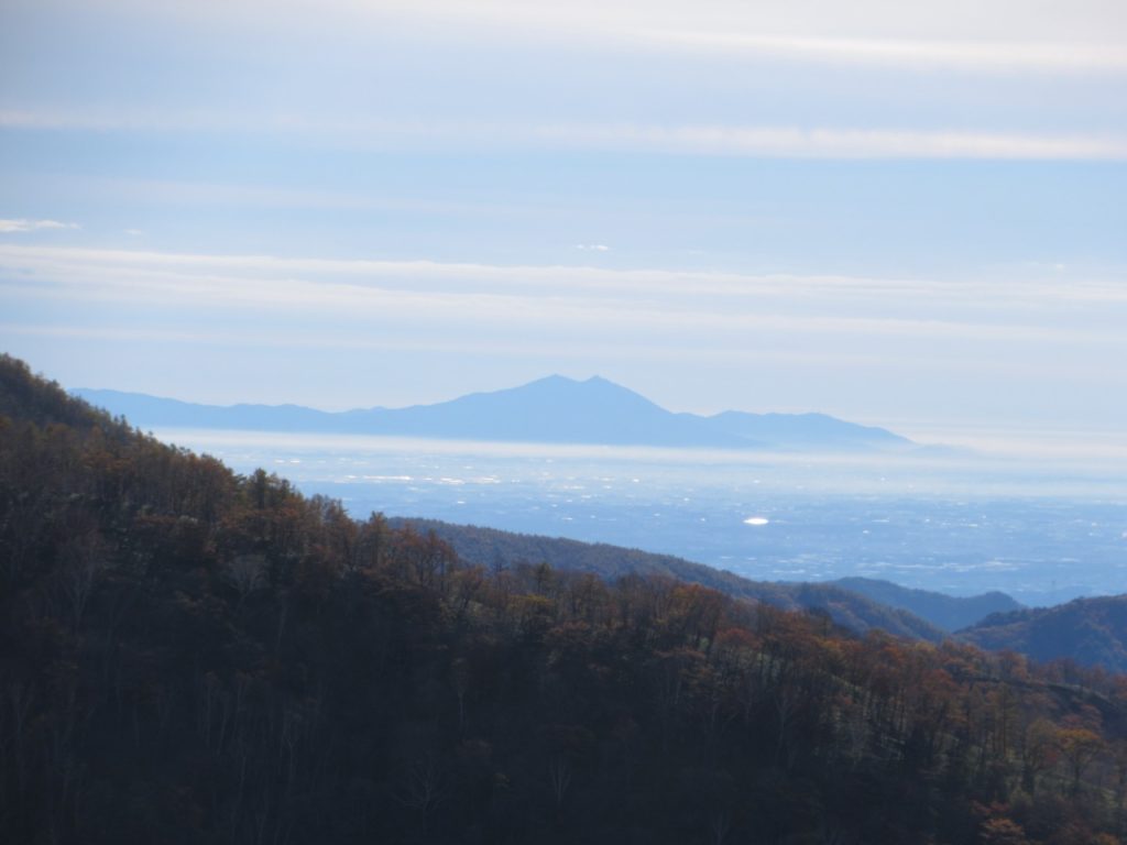 阿世潟まで1時間程道路を歩き登山道に入りますが、早朝のためか人影も疎ら、カラマツはまだ色付き始めですが、西側の長手沢方面は綺麗に色付いています。さらに高度を上げると、雄大な男体山を背景に、中禅寺湖と八丁出島を周遊する遊覧船が眼下に見渡せ、写真撮りで中々歩が進みません。漸く山頂に着くと、眼前に広がるのは太郎山、日光白根山、皇海山といった雄大な山々の連なり、遠くには筑波山、富士山、スカイツリーなど、澄み切った秋の眺望が広がっていました。