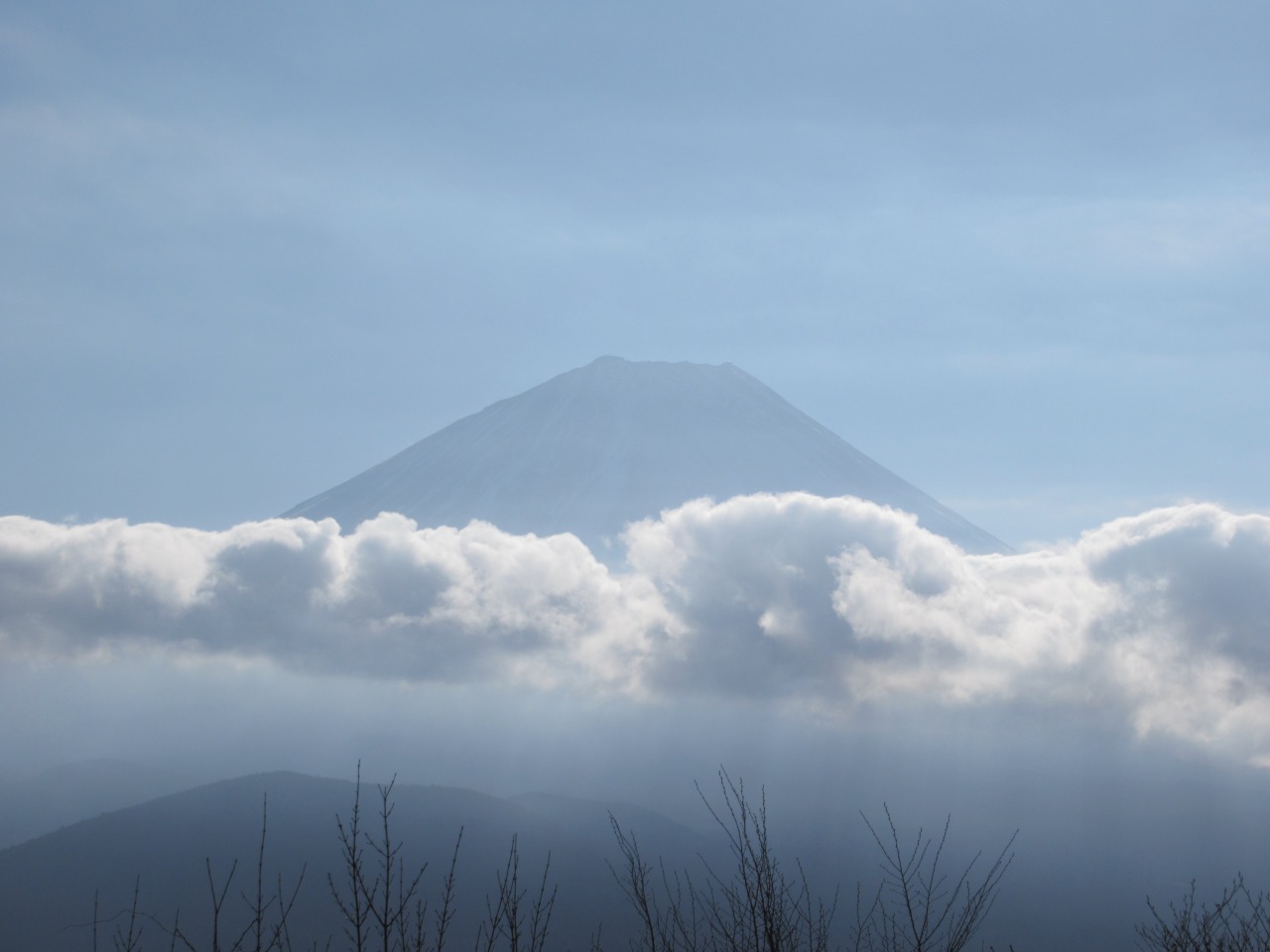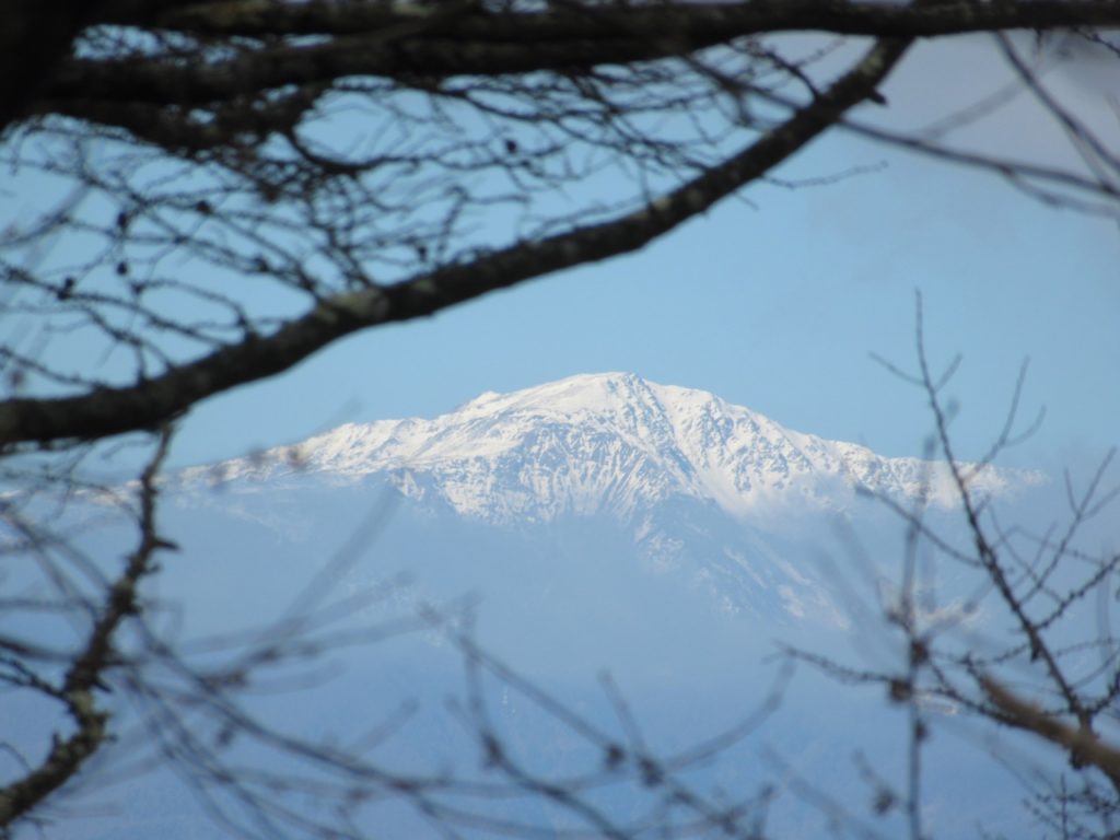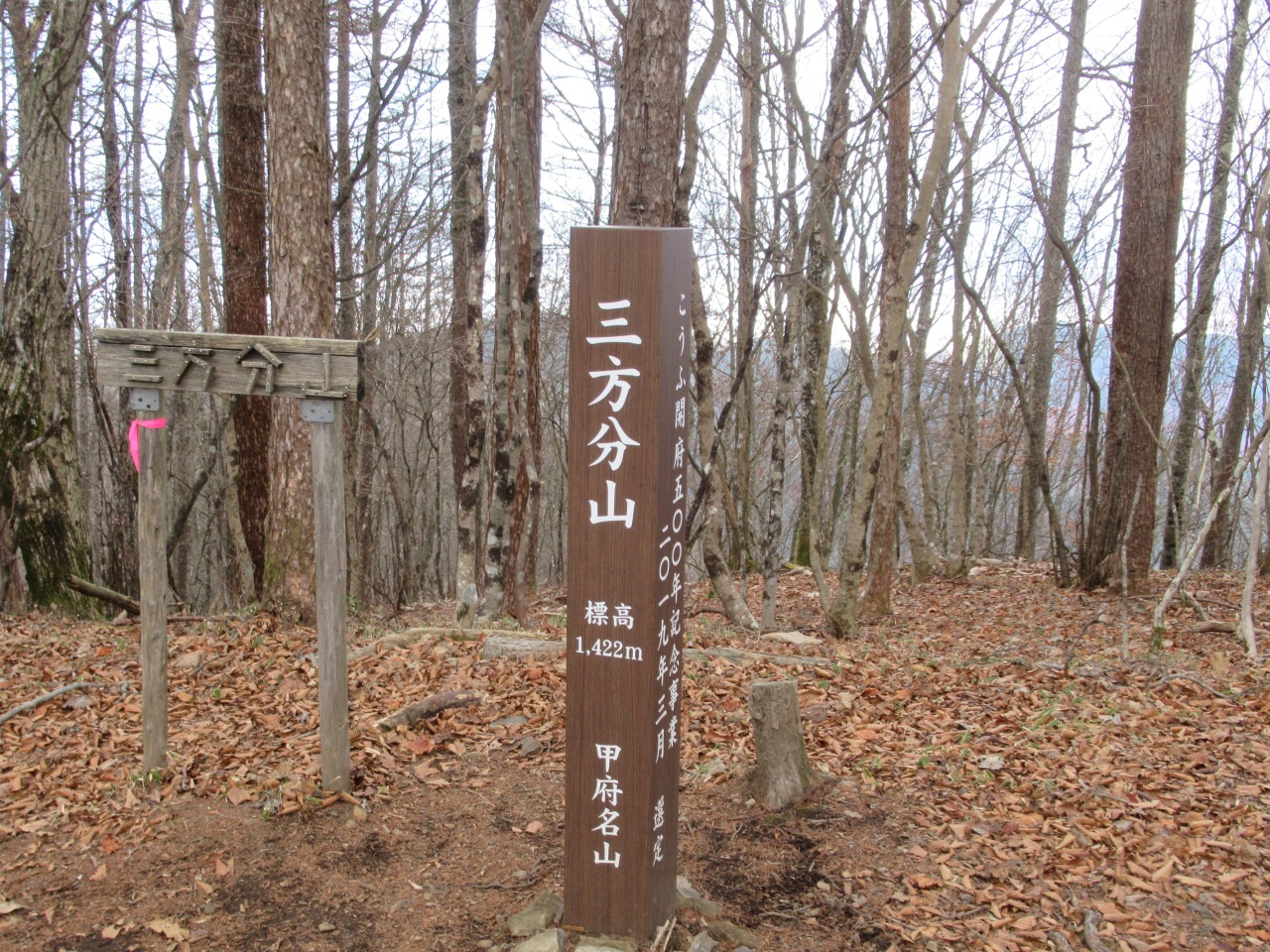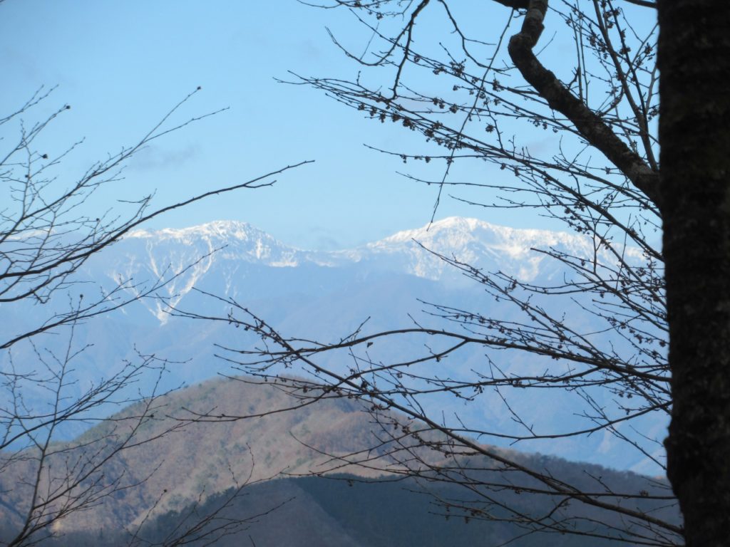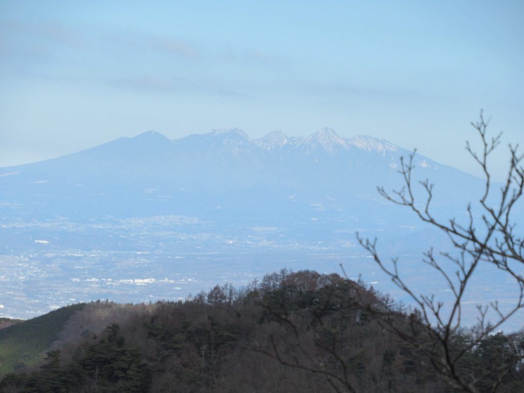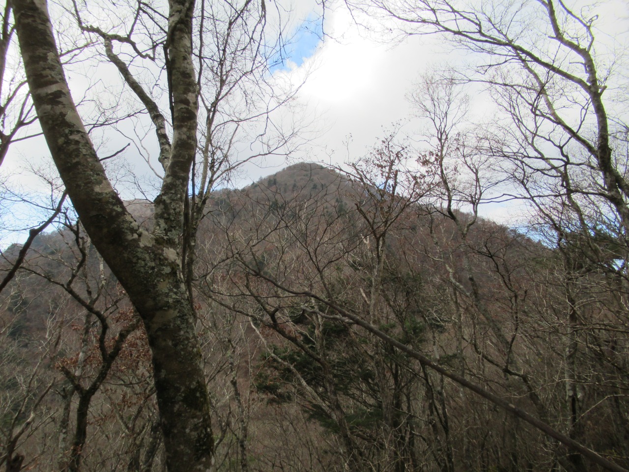 稜線を根子峠まで戻り、小さなアップダウンを繰り返しながら三方分山に向かいます。枯れ木の間からは先程まで雲に隠れていた南アルプスの甲斐駒、雪で白くなった白峰三山も見えました。精進峠から登り返し150m程の急斜面を登り切ると精進山、程なく三方分山に到着、南面が開けていますが、富士の中腹は見えるものの山頂は雲の中、待っても雲が切れないので諦めて下山しました。