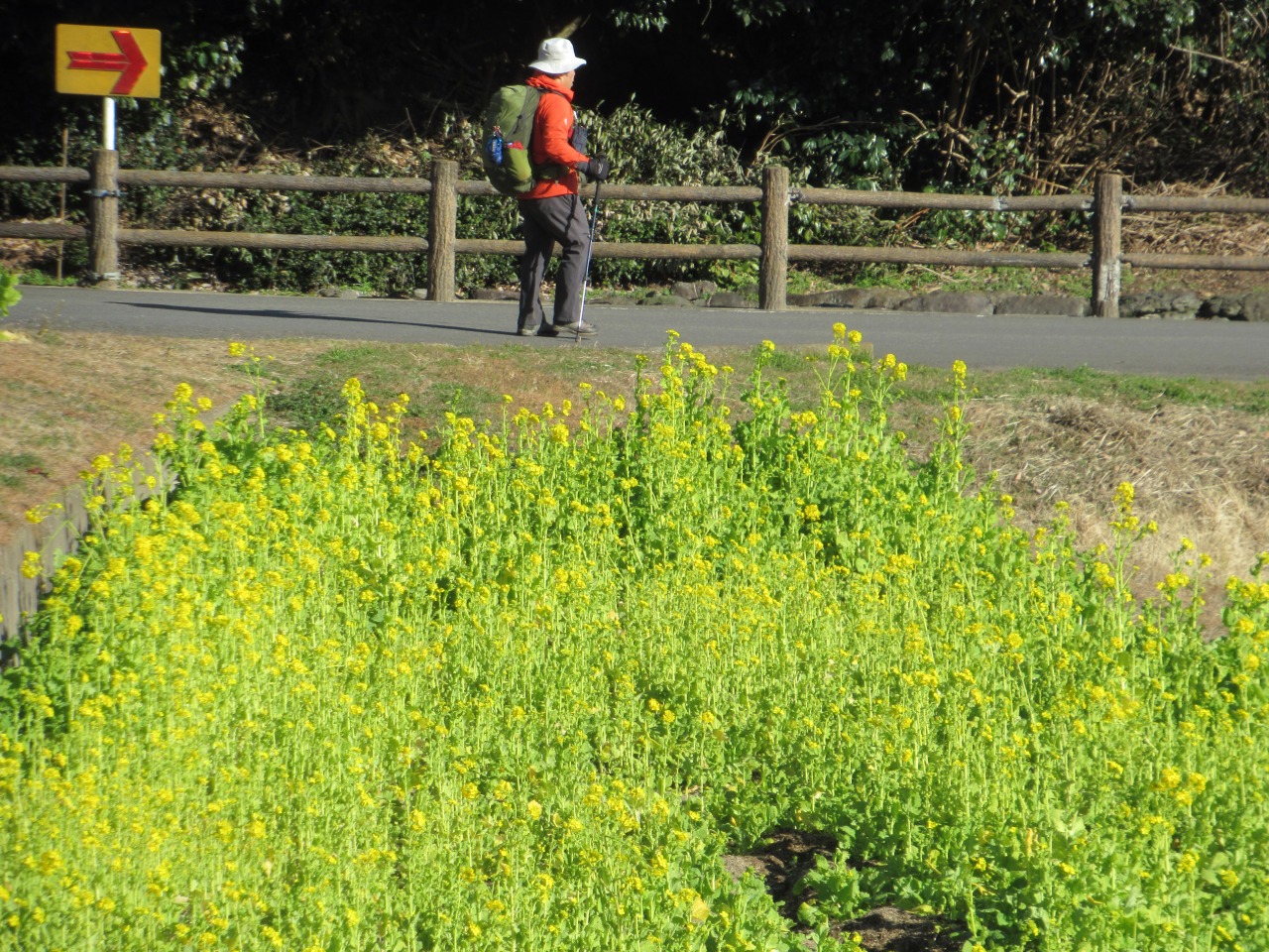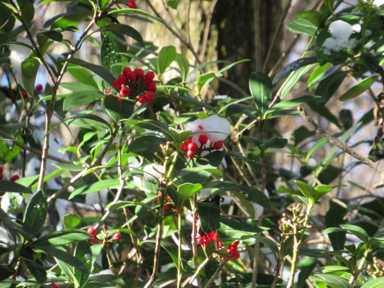 気温は4℃で少し風もあり肌寒いのですが、日当たりが良い沿道には早くも菜の花が咲いています。観光案内板に拠るとこの辺りは変成岩(ホルンフェルス)で形成されているらしく、登山口の ”山の神” にお詣りし登り始めるとすぐに”石抱き椎”、中腹に”ものくさ岩”や”三段岩”などの奇岩が至る所に点在し、展望所やベンチなども整備されていた。小町山々頂からは近くの筑波山、霞ヶ浦、スカイツリー、富士山も見えました。小休止後に稜線を西に進み、途中鬼越山に立ち寄り電波塔のメンテナンス用林道を歩き宝篋山に向かいます。稜線北側の日陰には一昨日降った雪が残りヒンヤリとしていますが、日向のマンリョウの紅い実に積もった雪は殆ど融けて滴が陽に輝いています。