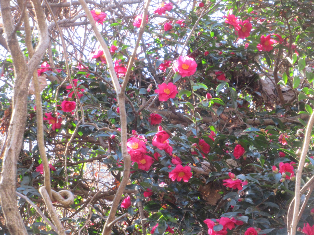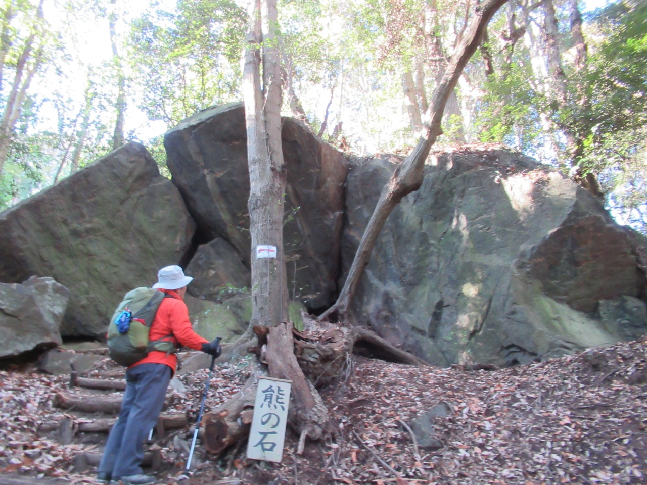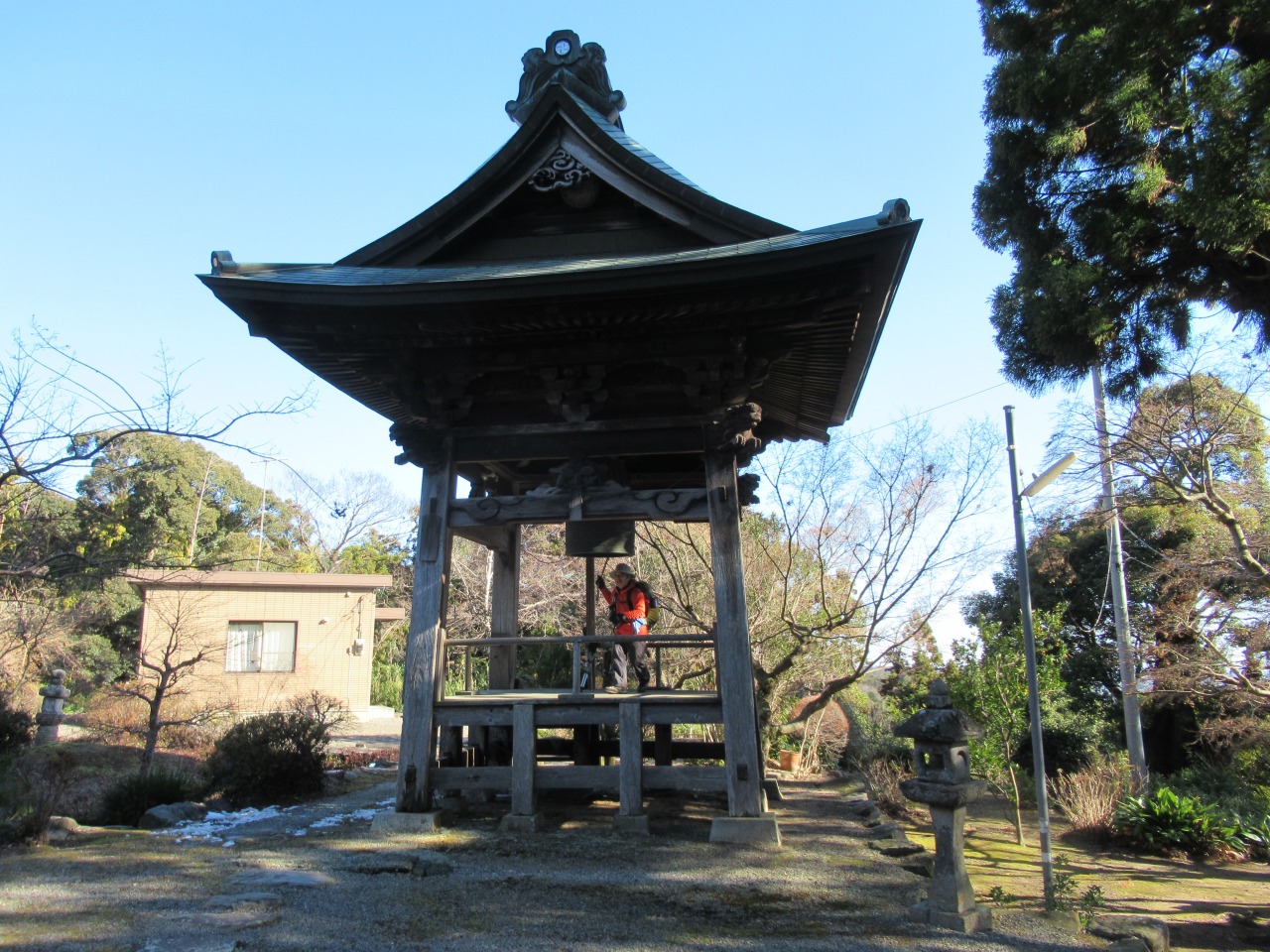 ぐっちゃん直伝の🍙おにぎりのお茶漬けを食しながら大休止した後、常願寺コースを南東方向に下山、394Pを下ったコルを直角に左折し石切り場を眼下に迂回します。ここからの登山道は地図にはなく、至る所に低山特有の道が縦横無尽に走っており、分岐のたびに地図とGPSを確認しなければなりませんが、里に咲く赤い花を付けたツバキが和ませてくれました。東城寺立ち寄り本年初の鐘を突き、奇岩 ”熊の石“ を拝観、小町の館駐車場に戻り新春登り初めを終えました。