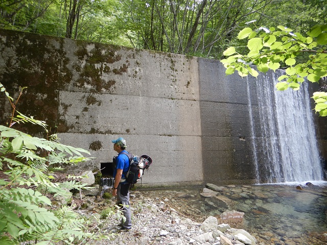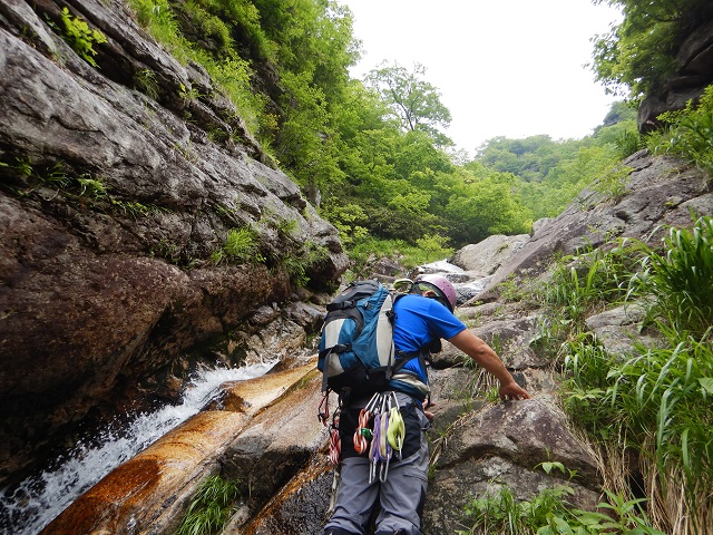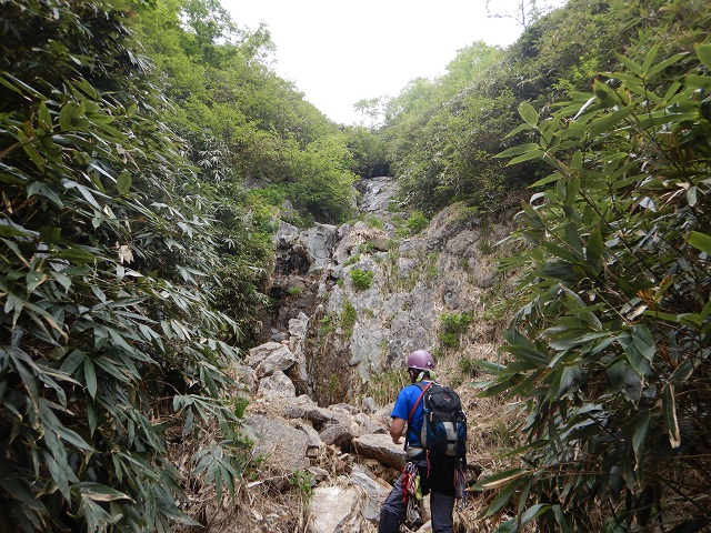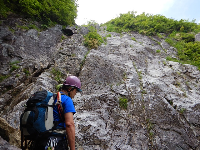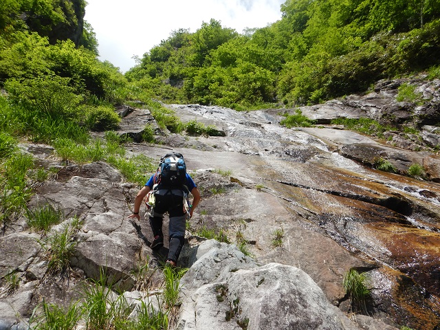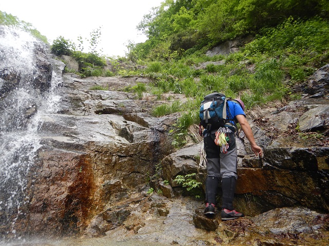 ほぼ中間点にある1:1の二俣を左俣へ、正面には20mのスラブが待ち構えていました。左俣も連瀑が続き、水量が減ったころ、この沢の核心部、40m大滝が現れました。この辺に来ると水はほとんどなくなり、私はフエルトの沢靴よりもラバーソールで登りたくてたまりませんでした。この大滝も安全のためロープを出して左側のクラックを登りました。途中残置ハーケンに助けられ、40mを登りきるころにはバテバテ状態。