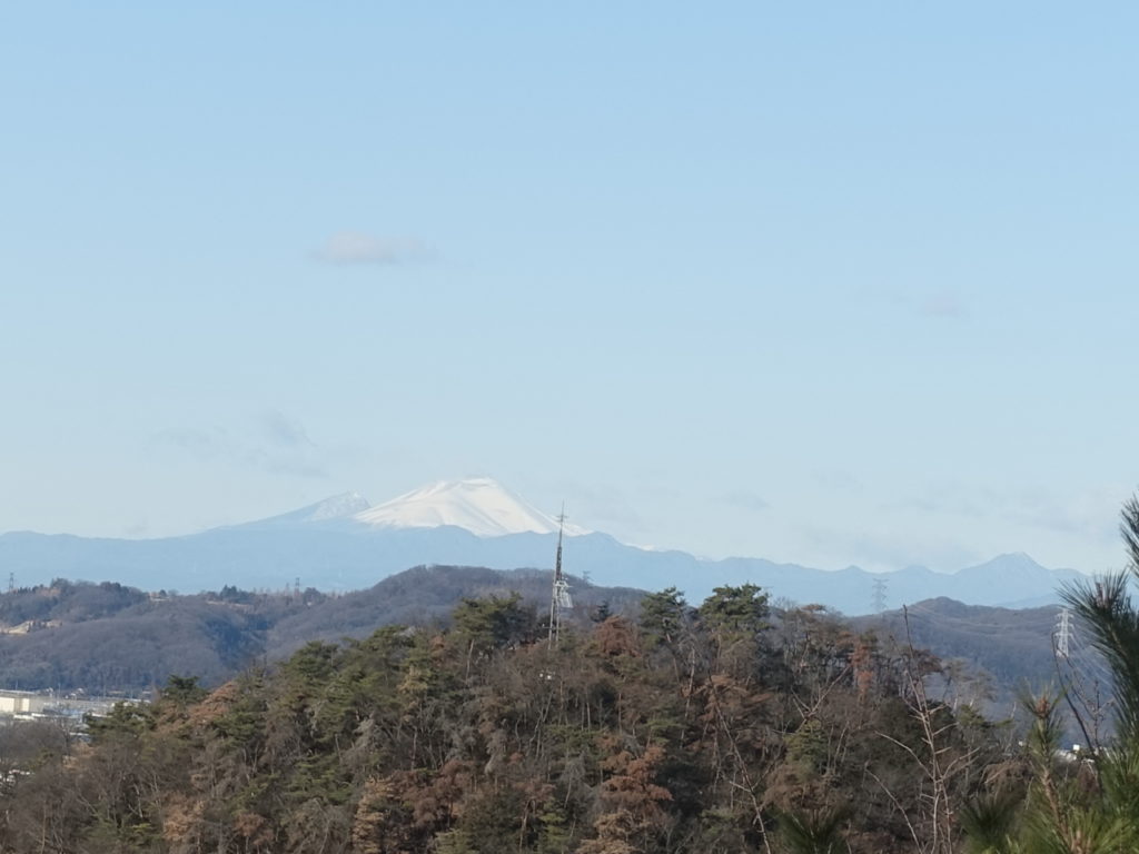 小さなピークをいくつも越え、最後のピーク両崖山に到着です。周囲は太い木々が多く展望は効きません。帰りにソバを楽しみたいので行動食は殆どとりません。神社にお参りし、いよいよ下りです。手ごろなハイクコースのため、ハイカーには結構会います。 かすかに東京都心、スカイツリー、富士山もかすかに認識、浅間山だけはハッキリ目立ちます。