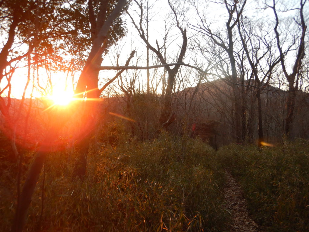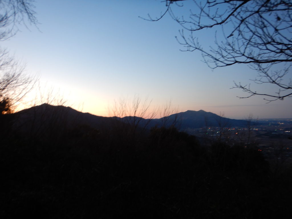 ヘッドライトを付けながら、まだ寝ている民家の脇を静かに歩く。そこを抜けると真っ暗になり、ボソボソと話し始まるが少々怖い。御嶽山登山口には、立派なトイレがあった。ライトを頼りに足元だけを見てじわじわ登ると、鳥居があり、あっという間に御嶽山だ。素通りして黙々と歩いた。とても歩きやすいが、山頂直下は長い階段が続く。そこが終わると雨引山に着く。少し明るくなり、薄っすらと富士山が見え出した。筑波山方面は赤く染まり始め、下界の街明かりがキラキラと輝きとても綺麗である。この夜明けの美しい景色が新鮮で感動していたが、「行くよー」に慌てる。とにかく、今日は先が長いのだ。ペースも少々速いが皆順調についていく。ここから燕山までが、一番長い縦走路である。