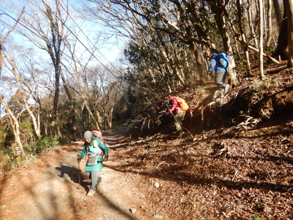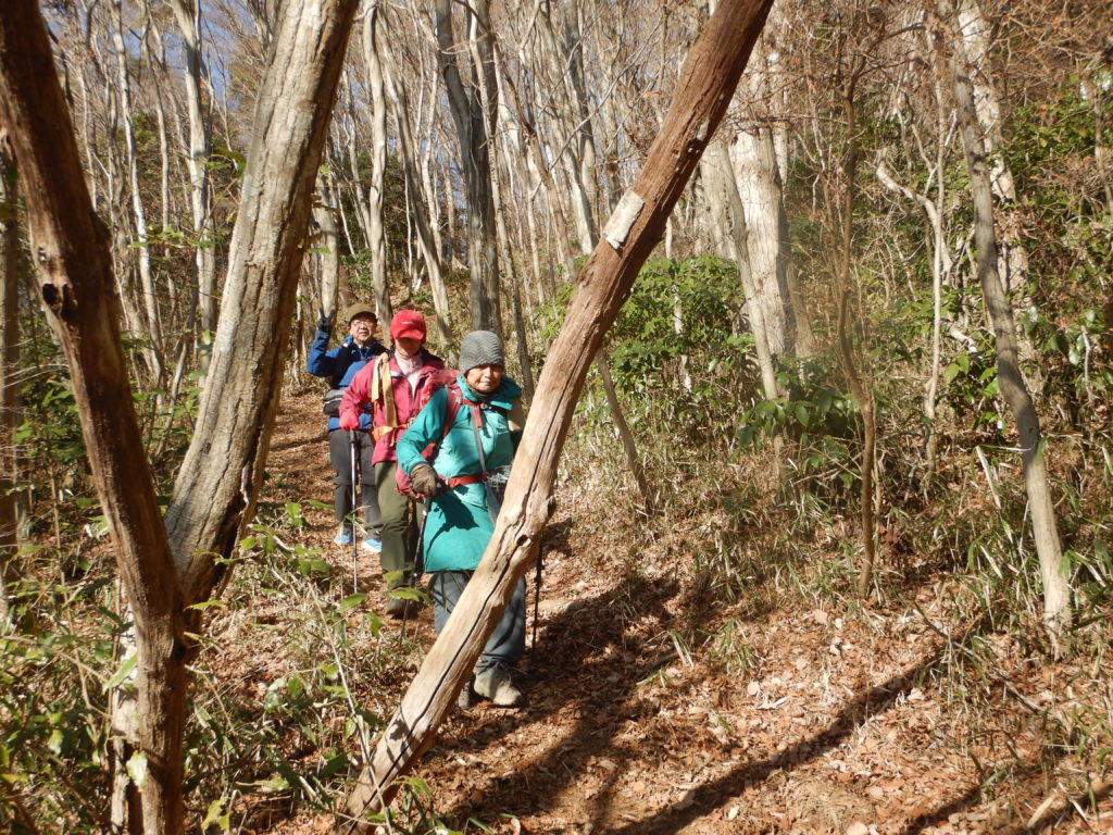 きのこ山までずっと舗装道路を歩く。縦走路ではめったに人には会わないが、きのこ山に男性が一人いた。私達とは逆コースと言う。キャンプ場まで2時間弱と長いし、道も沢山あり、なるべく体力消耗をしない道を選ぶ。この辺りは迷いやすい。当てにしていたキャンプ場のトイレは使用出来ず我慢。また、工事中でう回路を強いられ、ややきつい階段登りが増えたが、日光連山が綺麗に見え、一時疲れを忘れられた。最後の登り返しは予想通り辛かった。音を上げそうになるが、メンバーがいると励みになり、「ガンバロウ‼」と言う気持ちになる。どうにか女体山に登頂し、風がヒューヒュー寒いので長居せずに、白雲橋コースに入った。少し下で休憩した時は解放感に満ちていた。疲れた足での下山は「特に注意すべし」と気持ちを切り替えて、大きな石がゴロゴロする所を下る。急坂を下っても下っても下界がなかなか見えず、久し振りに膝に痛みが出た。その痛みはバス停までの車道歩きの中で消えていたが、足が棒のようだった。