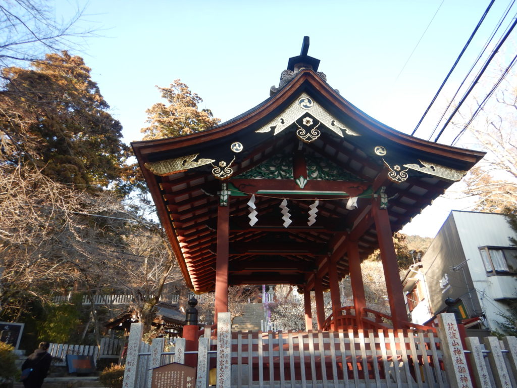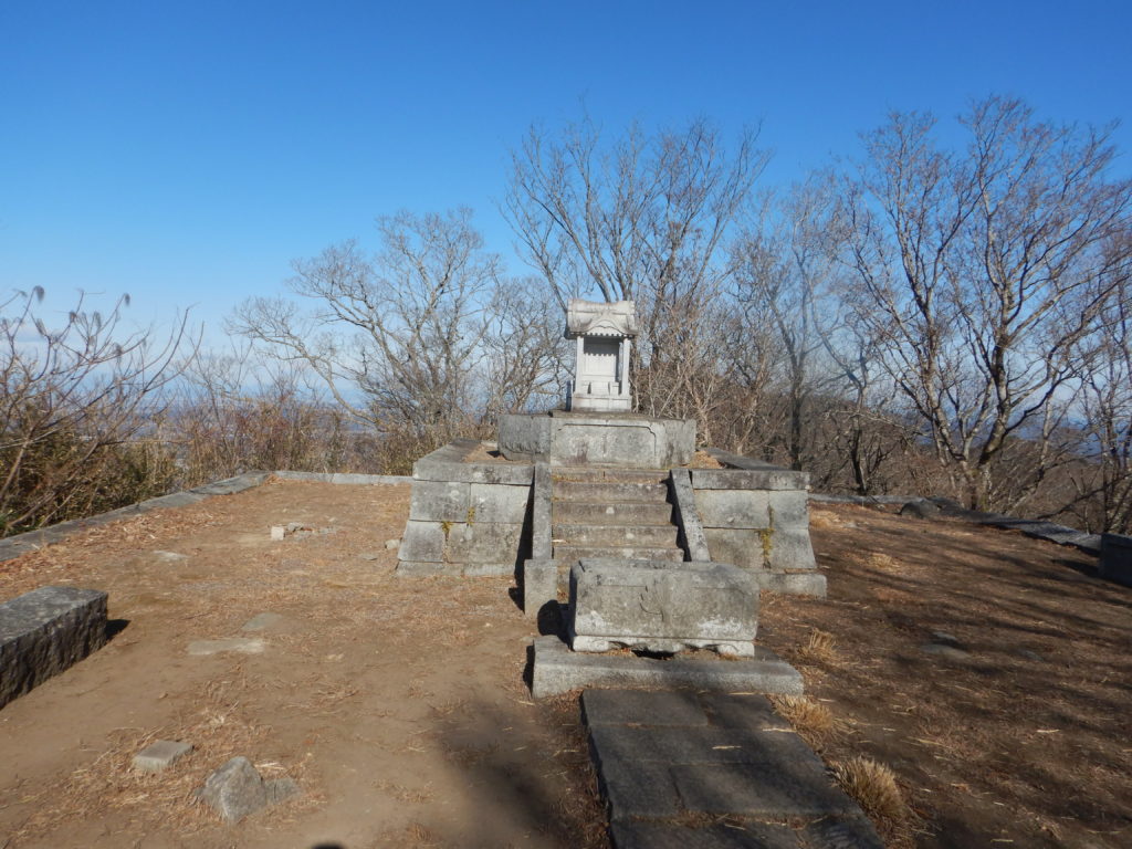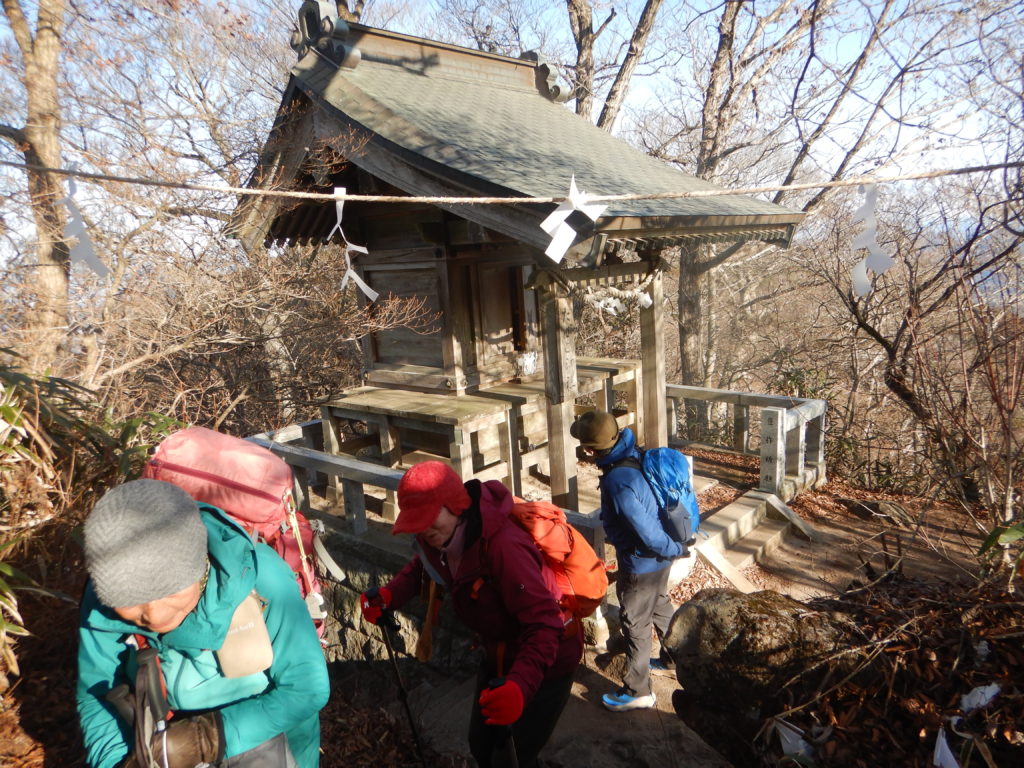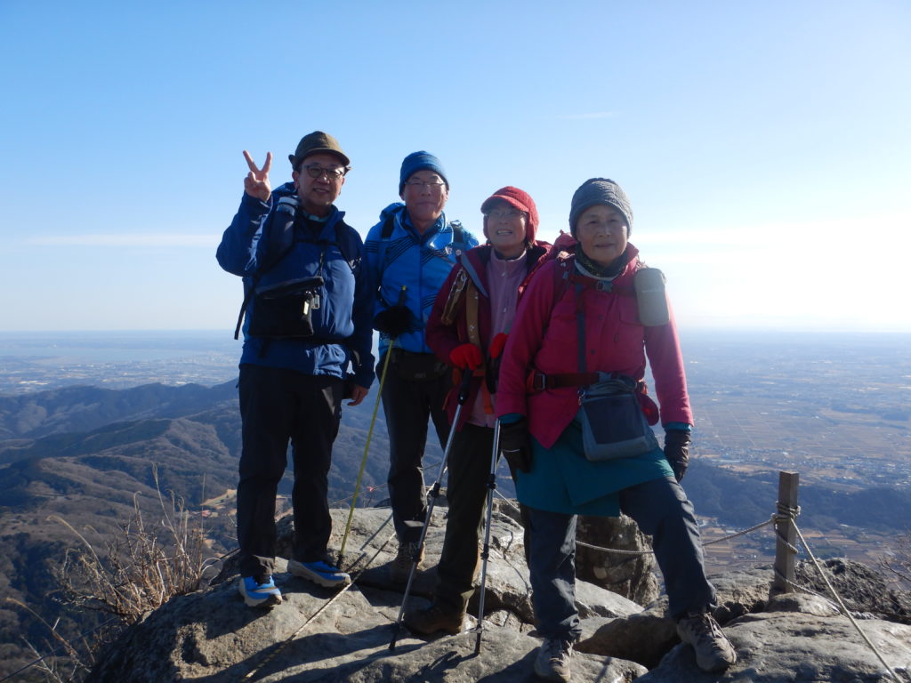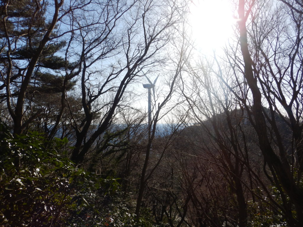 次は加波山。短いので気が楽だ。加波山神社はなかなか立派で、人々がいると心も和むものだ。お賽銭を納め、先を急ぐと次々と神社や祠、巨大な石が見られた。「たばこ神社」は新しかったが、他の神社は古く長い歴史を感じさせられる。また、加波山は「加波山事件」や「殉職之碑」(自衛隊の墜落事故)などの出来事があった所だった。一本杉峠に向かい半分も歩くと風車が現れた。近づいて見ると、なんと大きいこと!ウォンウォン低い音を出して回り、とがった羽根が恐ろしい。舗装道路は出来るだけ避けて山道を歩いた。5時間もたつと徐々に疲れてきて、足尾山直下の急登はかなりきつかった。シャリバテ?ついつい寒いと食べる気がしなくなってしまう。足尾神社奥社で元気を取り戻し、浅間山や八ヶ岳などの眺望を楽しんだ。そして、足尾神社本宮では、股関節痛が治るようにお参りした。