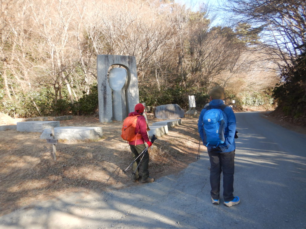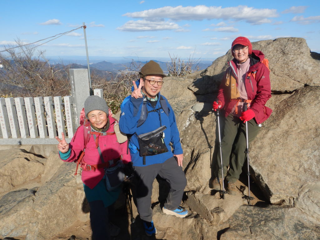 雨引山の下りは落ち葉が多い上、薄暗いので凄く気を使った。下りきってからは、テクテク、テクテク歩くことが出来る、気持ちの良い道が続き楽しい!そうしてるうちに太陽が昇り、光は冷えた空気を突き刺しパーっと明るくした。風もなく穏やかで快適な早朝の登山である。ところが、しばらくすると、風が出て来て嫌な予感。とうとう強風となって、右側の頬をたたきつけるので寒いやら冷たいやら、指先はジンジンして防寒着を着る。手袋を3組使っても半端なく冷え、自分には雪山でなくともオーバー手袋と目出帽が必須と悟った。幸いにも強風は30分足らずで、うそのようにおさまり、少しずつ指先と頭の冷えも治って安心する。燕山が近づいてくると100m間隔で道標があり、山頂まであと1.1㎞の立て札からは、またまた長~い急登の階段でしんどい。やっとの思いで着いたが、燕山山頂は狭く展望もなく、石の標識があるだけだった。